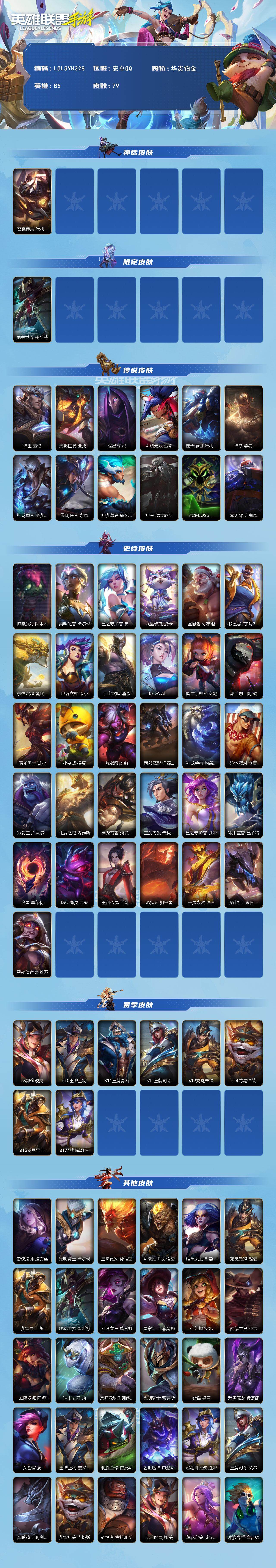 商品描述:【LOLSYH328】85英雄/79皮肤/1神话/12传说/华贵铂金/雷霆神兵 沃利贝尔/地底世界 崔斯特/神王 盖伦/光影巨翼 亚托克斯/暗星尊 烬/斗魂无双 亚索/霸天原祖 沃利贝尔/神拳 李青/神龙尊者 圣龙 李青/黎明使者 永恩/神龙尊者 驭风啸龙 易/神王 德莱厄斯/最终BOSS 维迦/霸天零式 赛恩/惊悚派对 阿木木/黎明使者 卡尔玛/星之守护者 奥莉安娜/水晶玫瑰 悠米/圣诞老人 布隆/礼物选好了吗? 布隆/东恒之曜 奥瑞利安·索尔/电玩女神 卡莎/西宙之晖 潘森/K/DA ALL OUT 阿卡丽/福牛守护者 安妮/源计划:阴 劫/屠龙勇士 凯尔/小蜜蜂 提莫/炼狱魔女 蔚/西