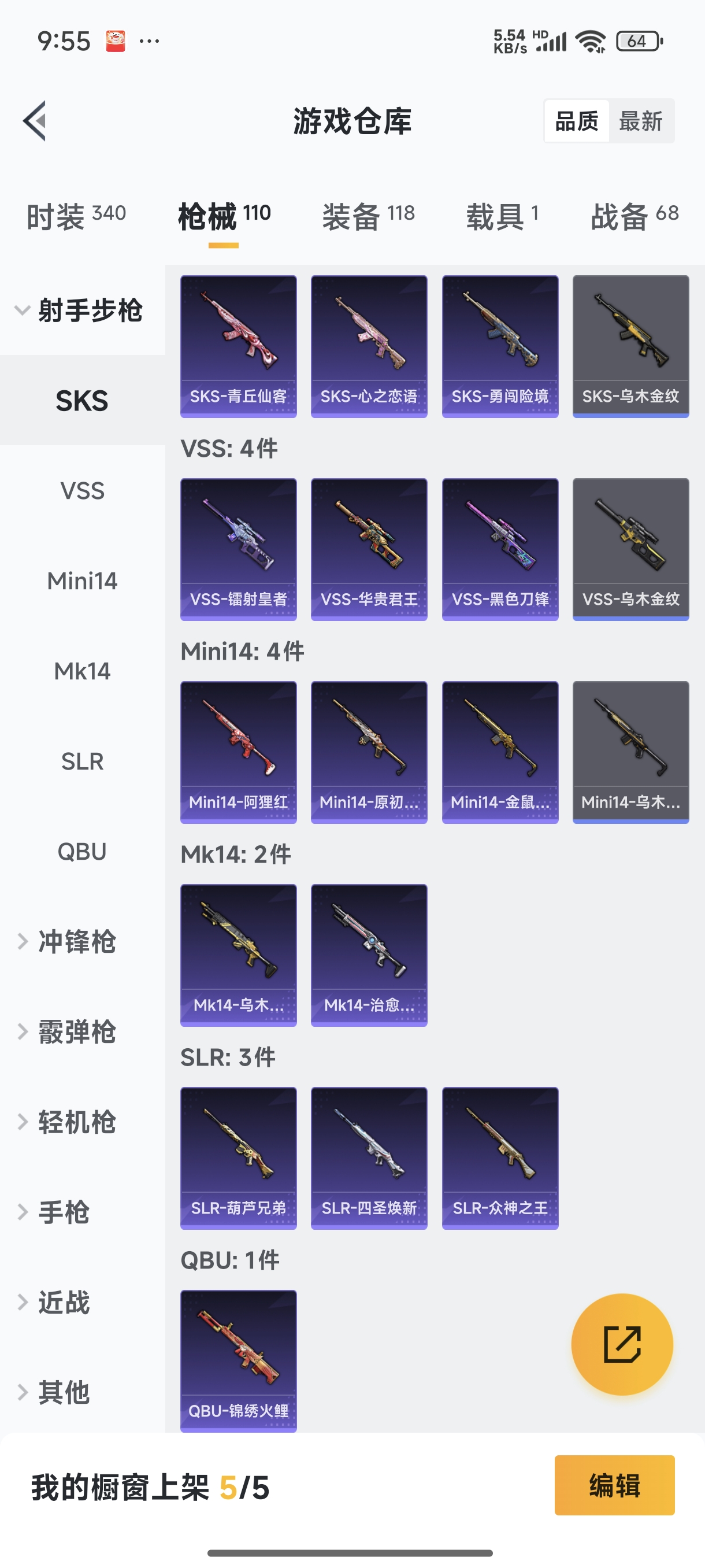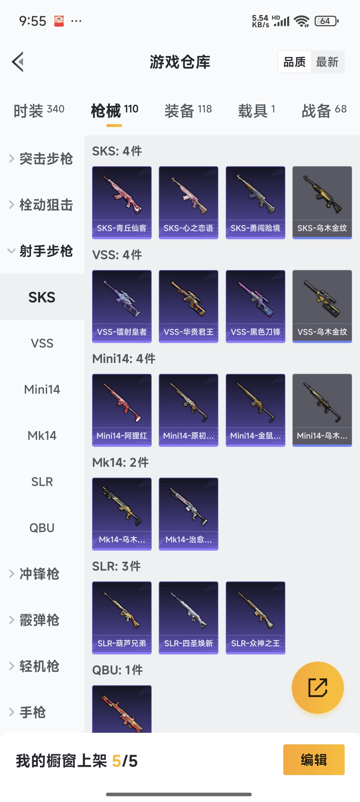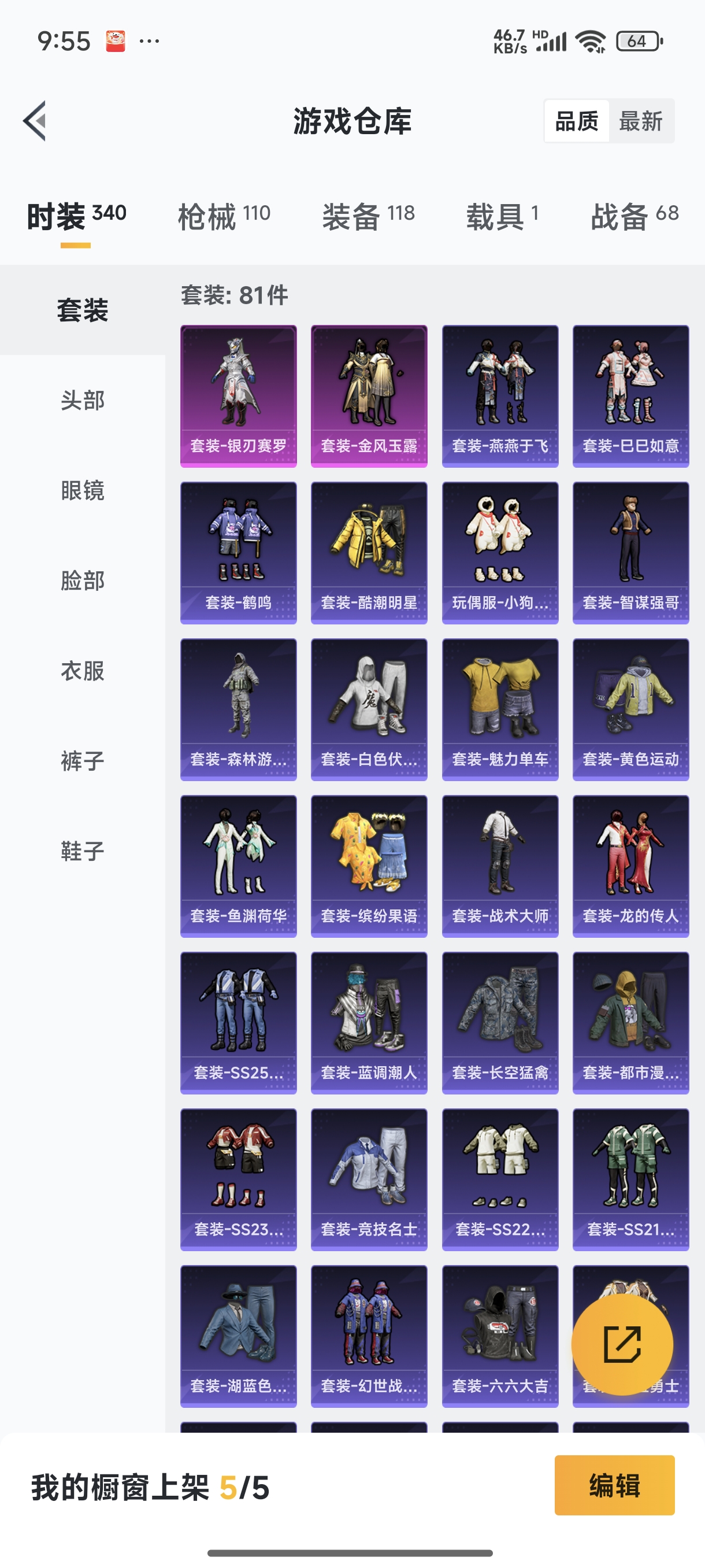 【安卓QQ】95套装-132枪皮-1载具 零号机款机体服 黄螳螂 SCAR-L-锦绣绵绵 团圆交子 瑞龙福将 极速红龙 黑色刀锋 M762-瑞龙福将【苹果QQ】122套装-159枪皮-0载具 奇异狩猎者 2号机款机体服 梦幻火箭 音爆索尼克 浪漫波比 M762-甜蜜誓约 M416-五爪金龙 UMP45-相思残雪 黄族统领飞行器 金曜白虎 新侠客行 街舞达人 街舞之王 仓鼠灰灰 团圆交子 瑞龙福将 摩登艾咪