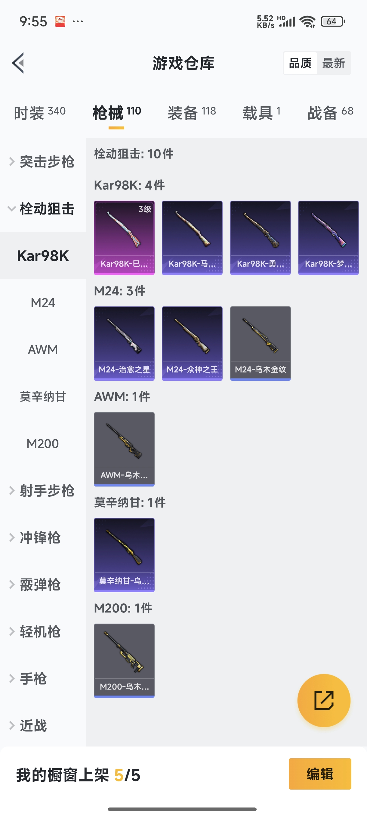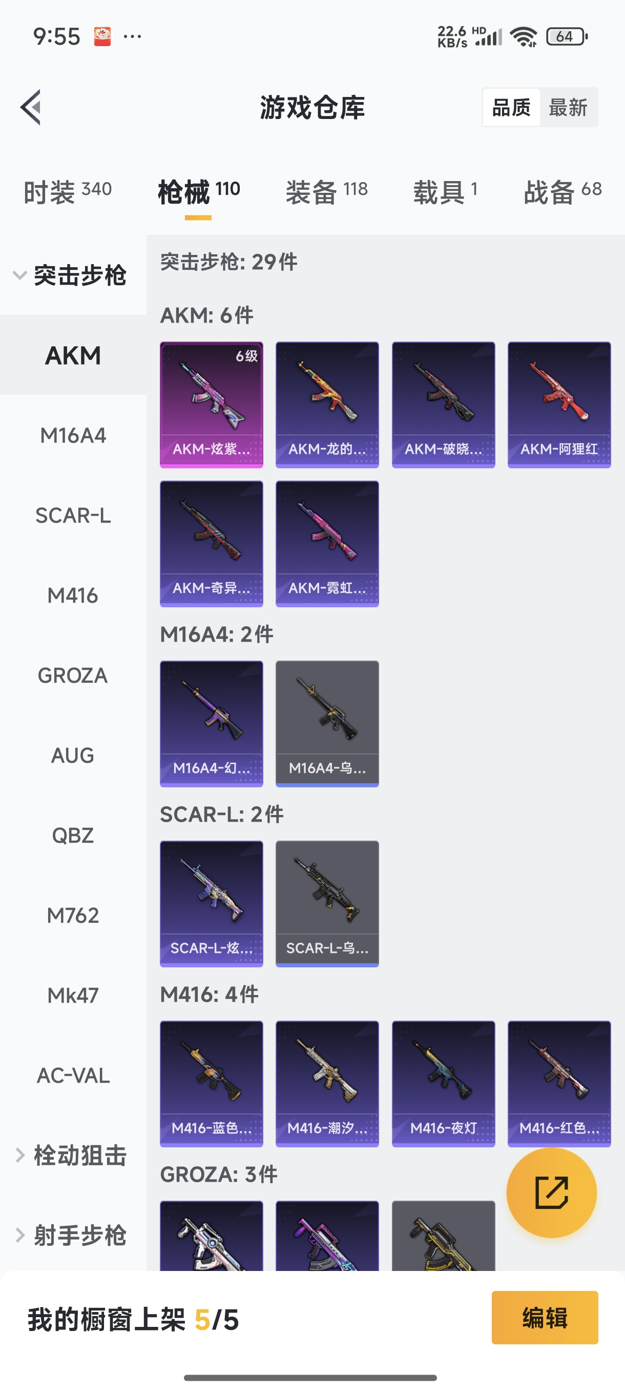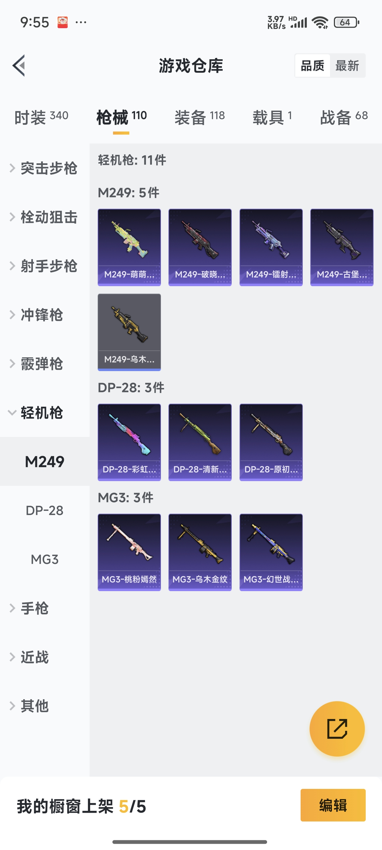 【安卓QQ】95套装-132枪皮-1载具 零号机款机体服 黄螳螂 SCAR-L-锦绣绵绵 团圆交子 瑞龙福将 极速红龙 黑色刀锋 M762-瑞龙福将【苹果QQ】122套装-159枪皮-0载具 奇异狩猎者 2号机款机体服 梦幻火箭 音爆索尼克 浪漫波比 M762-甜蜜誓约 M416-五爪金龙 UMP45-相思残雪 黄族统领飞行器 金曜白虎 新侠客行 街舞达人 街舞之王 仓鼠灰灰 团圆交子 瑞龙福将 摩登艾咪