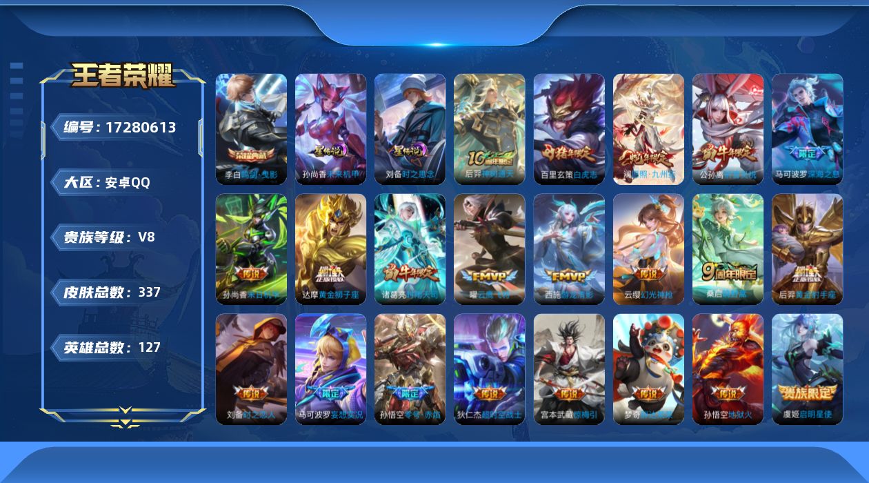 营地号349226875-【QQ(安卓)】贵族9-贵族积分10万-129英雄-299皮肤-203铭文安卓QQ/永恒钻石/299皮肤/129英雄/4典藏/0珍品无双/1无双/2珍品传说/18传说/90史诗/10稀有英雄 【2 珍品传说】怪盗基德 马可波罗,江户川柯南 鲁班七号, 【4 典藏皮肤】鸣剑·曳影 李白,倪克斯神谕 武则天,无限飓风号 夏侯惇,最初的交响 伽罗, 【1 无双皮肤】器灵·螭龙剑 曜, 【18 传说皮肤】启明星使 虞姬,零号·赤焰 孙悟空,云鹰飞将 曜,凤求凰 李白,遇见胡旋 貂蝉,仲夏夜之梦 貂蝉,地狱之眼 宫本武藏,祈雪灵祝 公孙离,时雨天司 诸葛亮,黄金射手座 后羿,黄金狮子座 达摩,久胜战神 干将莫邪,愿照·九州拓 澜,神树通天 后羿,幻光神枪 云缨,愿照·山河定 司空震,愿照·岁时盈 虞姬,鸣野蒿 桑启, 【90 史诗皮肤】奔雷神使 牛魔,电玩小子 鲁班七号,白昼王子 嬴政,紫霞仙子 露娜,银河之约 李元芳,匿光追影者 镜,云端筑梦师 庄周,暗影游猎 马可波罗,冰霜恋舞曲 干将莫邪,德古拉伯爵 刘邦,心灵战警 亚瑟,五谷丰年 鬼谷子,鬼剑武藏 宫本武藏,百相守梦 黄忠,星夜王子 白起,寅虎·心曲 杨玉环,无限星赏官 公孙离,遇见飞天 杨玉环,摇滚巨星 嬴政,冰锋战神 关羽,修罗 橘右京,拒霜思 嫦娥,魅力维加斯 妲己,乐园奇幻夜 钟馗,偶像歌手 王昭君,女仆咖啡 妲己,白蛇 大乔,舞动绿茵 蔡文姬,繁星吟游 蔡文姬,暗夜贵公子 嬴政,鹰眼统帅 狄仁杰,胡桃异想国 米莱狄,大圣娶亲 孙悟空,李小龙 裴擒虎,纤云弄巧 云中君,金属风暴 墨子,玄嵩 庄周,特工魅影 百里守约,猫狗日记 孙策,原初追逐者 百里玄策,逐浪之夏 李元芳,未来纪元 赵云,时之彼端 妲己,黎明之约 雅典娜,石田雨龙 后羿,鸭鸭历险记 刘禅,魔术师 狄仁杰,龙之律动 狂铁,唤灵魅影 貂蝉,皇家上将 赵云,冰冠公主 雅典娜,功夫厨神 程咬金,梁祝 上官婉儿,天才门将 刘禅,圣诞恋歌 貂蝉,云间偶戏 元歌,水晶猎龙者 花木兰,一生所爱 露娜,御风骁将 吕布,圣诞狂欢 吕布,魅语 不知火舞,器灵·浮梦炉 赵怀真,地狱岩魂 廉颇,茶境仙 孙膑,冰雪圆舞曲 甄姬,火炮绅士 黄忠,青蛇 小乔,默契交锋 花木兰,月团寄思 沈梦溪,航海奇遇记 老夫子,千年之狐 李白,节奏热浪 阿轲,万灵启世 女娲,心灵骇客 安琪拉,箭羽风息 伽罗,乱世虎臣 张飞,万物之道 弈星,谪仙醉月 李白,绅士熊喵 刘禅,缤纷独角兽 小乔,陌上桑 艾琳,百相守梦 百里守约,蓝屏警告 典韦,真爱魔法 干将莫邪,水果甜心 孙尚香,狂想玩偶喵 蒙犽,化蝶舞 阿轲,幽灵船长 曹操,乘风破浪 夏侯惇,暗隐猎兽者 兰陵王