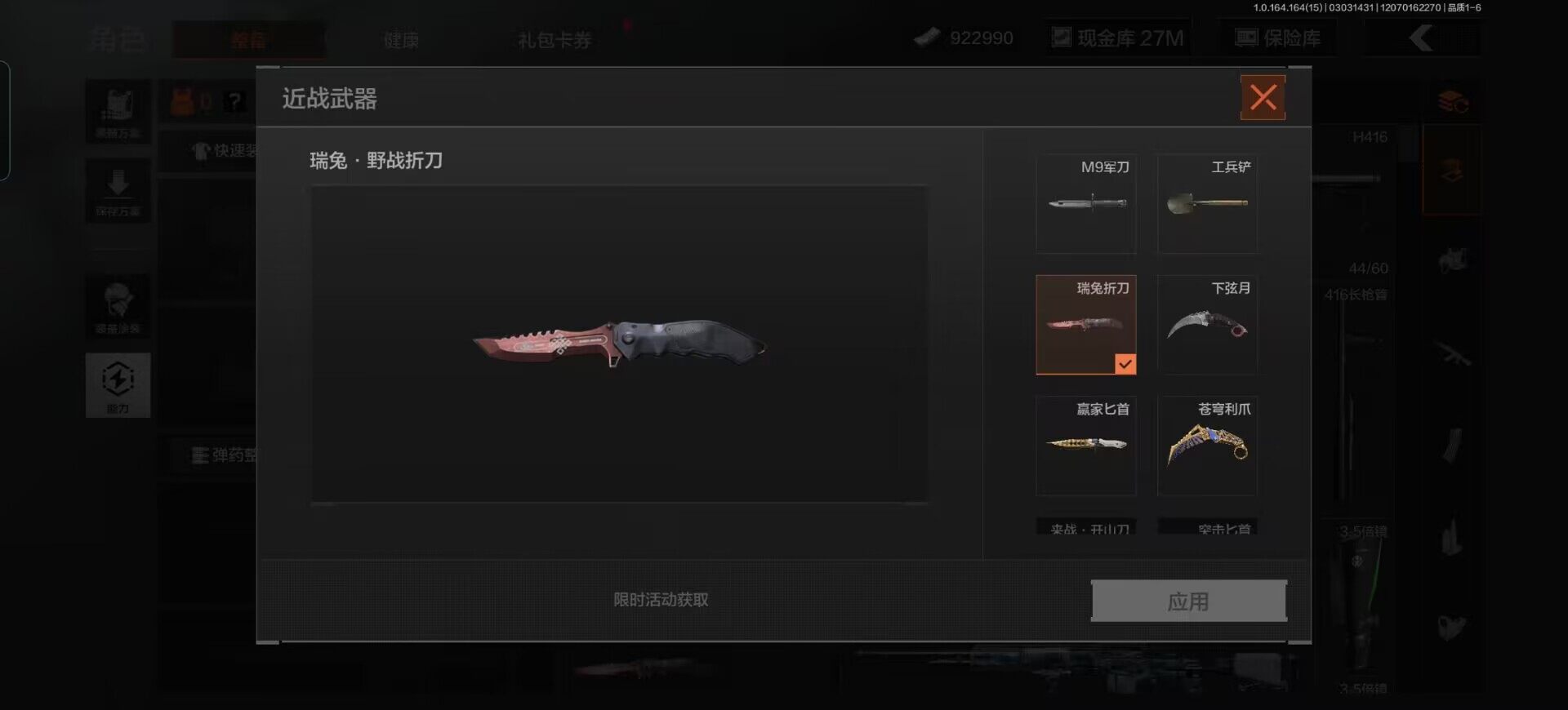 [16536194]库存价值70.4 5近战武器 2金套装 8金枪皮 可修改实名 【柯恩币数量】710794现金库43m 【角色装扮(金)】白蔷薇·斯黛拉,机车朋克战衣 【近战武器】热能武器·补牢,工兵铲,急袭弯刀,来战·开山刀,下弦月 【金色枪皮】包络战术·AKM,战术大师·AN94,旧王圣谕·QBZ191,告丧夜曲·AR57,玉擎天工·MP5,利齿风暴·MPX,旗帜·AEK,骑士之剑·VSS 【紫色枪皮】利齿风暴·T79,猩红羽翼·VSS,利齿风暴·T03,鱼跃丹青·MCX,骤羽尖啸·MPX,竞技·MDR,边缘矢量·AR57,边缘矢量·MPX,德尔塔小队·H416,火力倾泻·AKM,棱光裂变·莫辛,高塔之内·VSS,高塔之内·P90,火力倾泻·AUG,棱光裂变·AKM,骑士之剑·Groza,格勒涂装·AK12,粉绒臻选·AN94,粉绒臻选·AR30,秘域鎏金·RPK16,战术大师·AK74N,战术大师·Suomi,潜渊蛇鳞·M4A1,战术大师·SJ16,巡林客·T951,无声暗月·AX50,危崖敌影·MPX,骑士之剑·AKS74U,涂绘猎人·AR57,敬伙伴·M16,07式林地迷彩·QBZ191 【角色装扮(紫)】王国卫队礼装,和平先锋作战套装,财团之手作战套装,万众狂欢套装,都市夜影套装