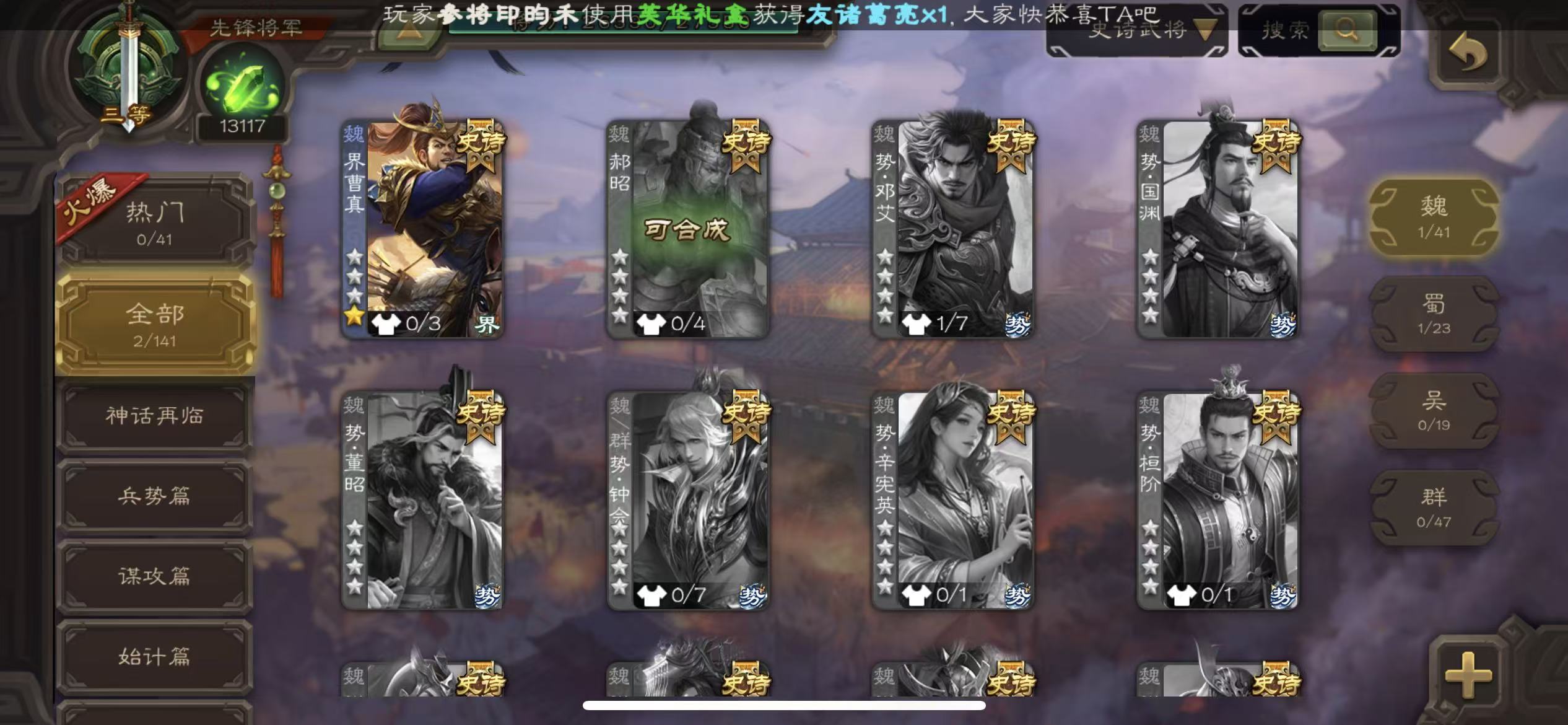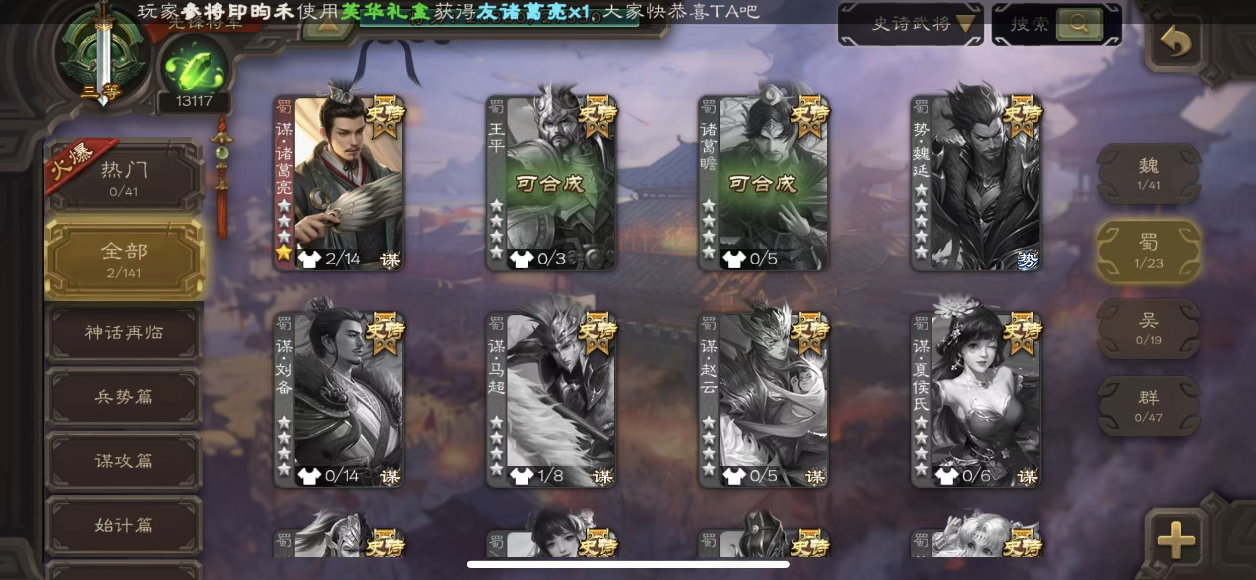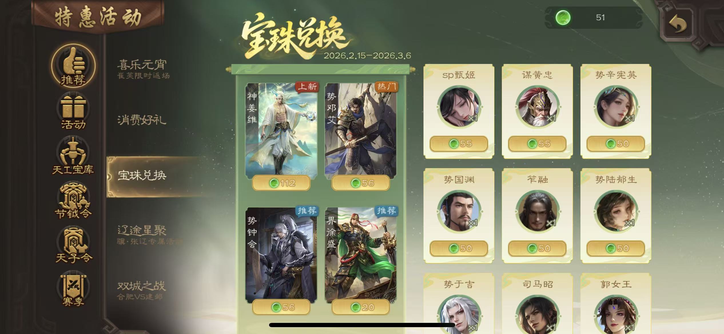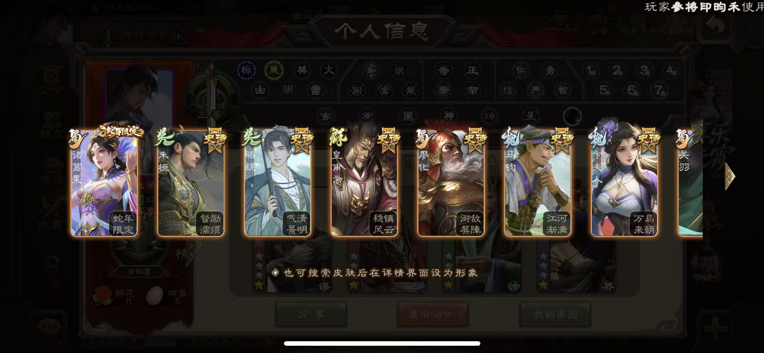 商品描述:先锋谋诸葛亮51宝珠(可换小鸟势幸宪英势国渊势陆郁生司马昭等其一)9万羽毛1.3万将魂三卡