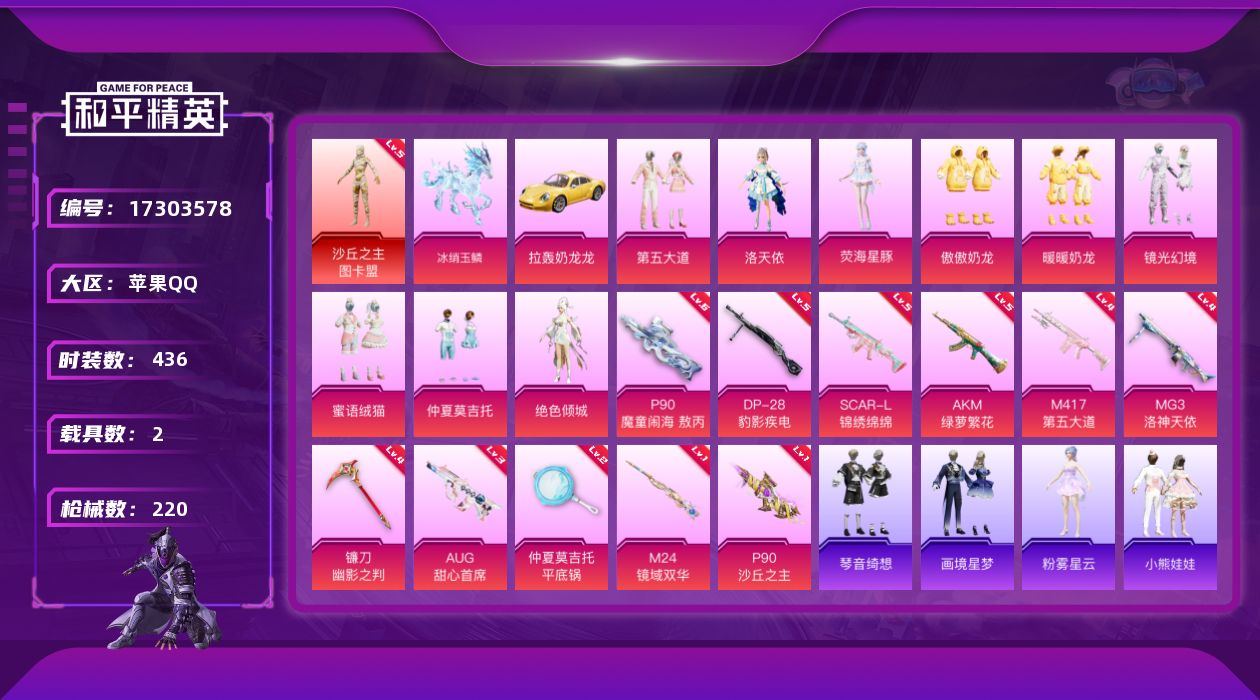 商品描述:[17303578]【特价出售】苹果Q-1红装2载具9粉装12特效枪1热门125套装220枪皮 78504热力值 13印记 历史无敌战神 【1红装】 沙丘之主-图卡盟 (5级) 【2载具】 拉轰奶龙龙 冰绡玉鳞 【9粉装】 绝色倾城 蜜语绒猫 暖暖奶龙 傲傲奶龙 洛天依 荧海星豚 镜光幻境 仲夏莫吉托 第五大道 【12特效枪】 SCAR-L-锦绣绵绵 (5级) P90-魔童闹海敖丙 (6级) M416-灵猫魔法师 (3级) P90-沙丘之主 (1级) AKM-绿萝繁花 (5级) DP-28-豹影疾电 (5级) AUG-甜心首席 (3级) M24-镜域双华 (1级) M417-第五大道 (4级) MG3-洛神天依 (4级) 平底锅-仲夏莫吉托 (2级) 镰刀-幽影之判 (4级) 【1热门】 龟仙人 【4飞行器】 绝色倾城飞行器 甜心首席飞行器 镜光幻境飞行翼 星夜魔法师飞行翼