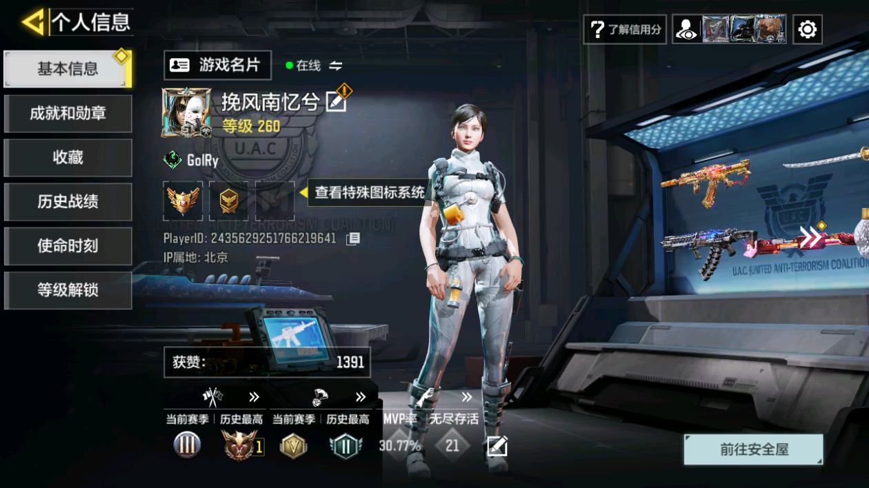 [14832631]400级 2神话 9传说 261史诗 段位铂金 可二次 可修改实名 【神话枪械】:AK117-熔岩,USS9-焕光跃迁【传说枪械】:M4-皇家黑魂,S36-甜心诱惑,FFAR 1-星彩乐手,Locus-红色彗星,Fennec-阿克西斯奇迹,AK47-火箭炮,RPD-一路悠扬,电棍-永恒炽热,CR56-回音律动