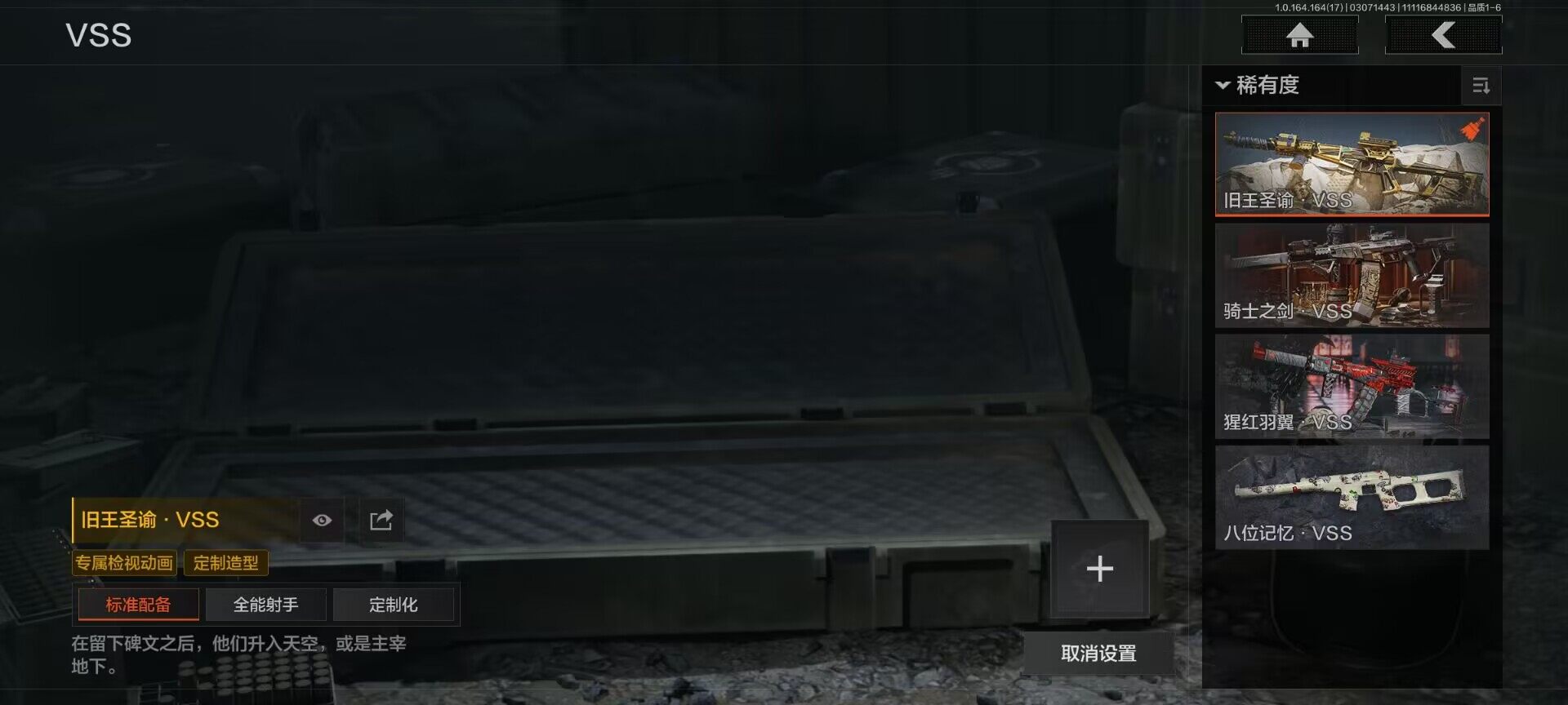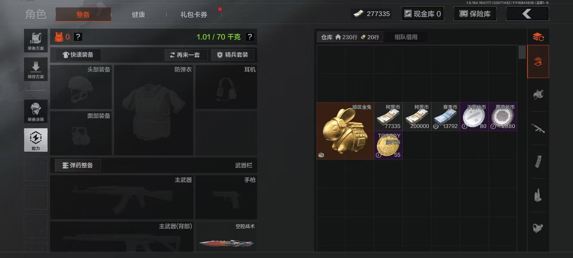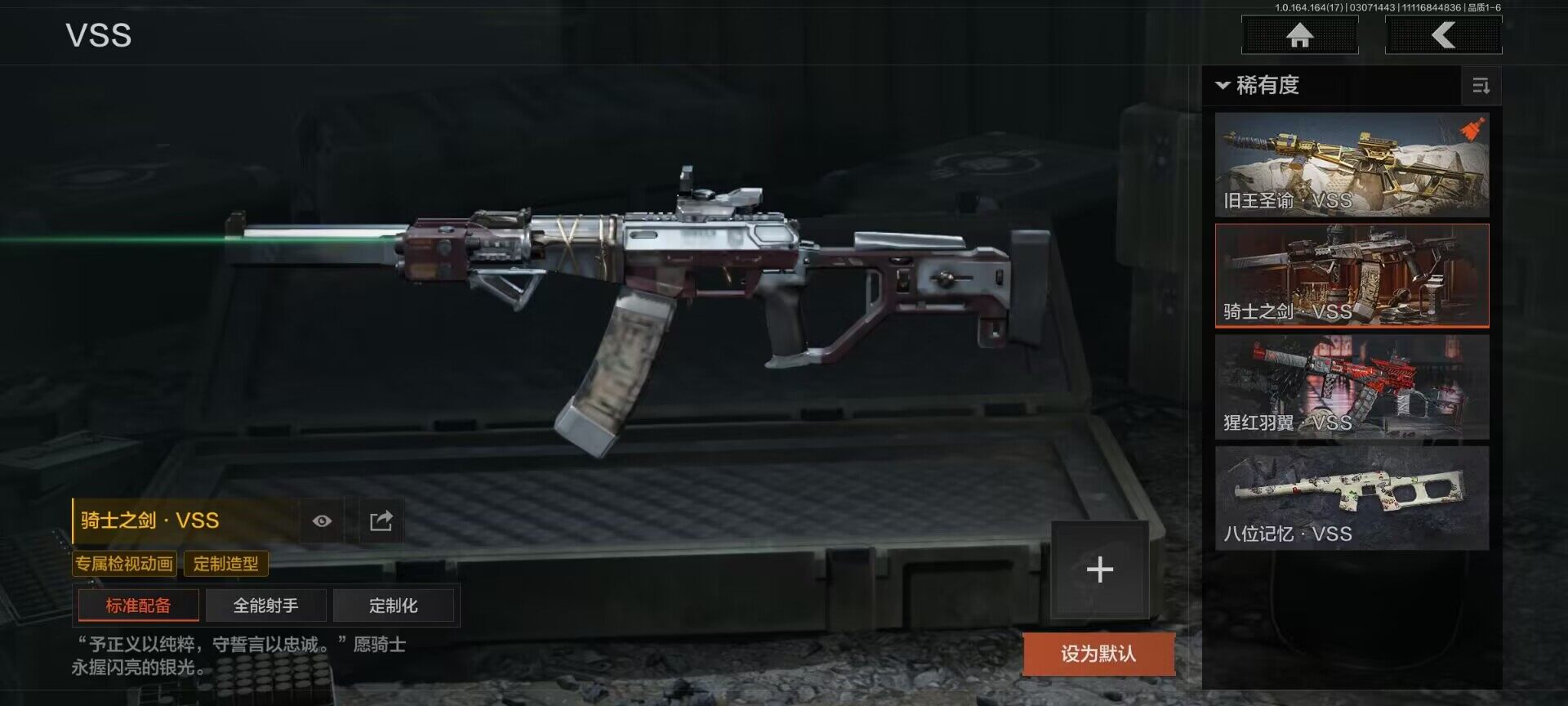【AQD234】等级:30/段位:暗区传说/柯恩币:277335/空腔战术/套金客莫雷尔/旧王圣谕VSS/骑士之剑VSS/近卫荣誉RPK16/告丧夜曲AUG/包络战术AKM/战术大师AN94/镀火熔金H416/赤帽要塞AR57/战术大师AEK/芭斯特
