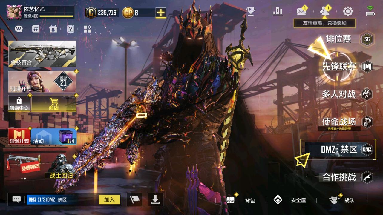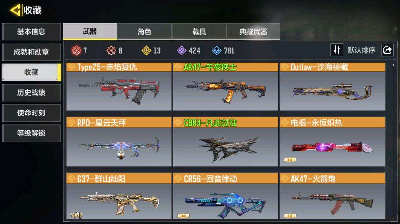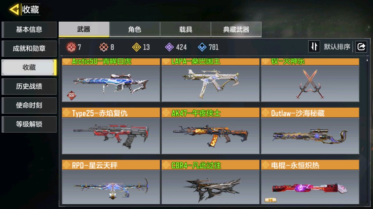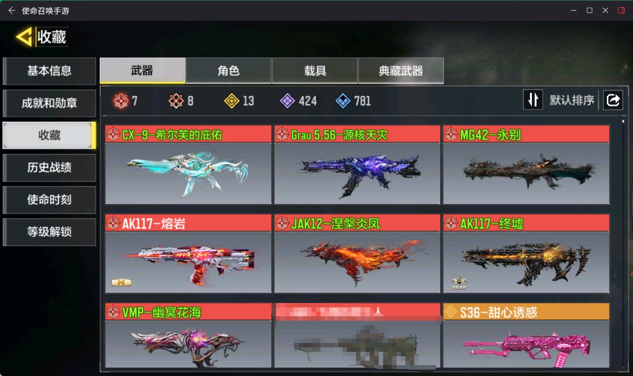 [14142115]400级 7神话 2典藏 22传说 736史诗 段位无 可二次 可修改实名 【典藏枪械】:HG40-灵魂羁绊·典藏,SKS-粒子震击·典藏【神话枪械】:SMG5-潮海汐月,MG42-永别,Grau 5.56-源核天灾,FFAR 1-无境空刃,M13-黑耀星辰,Kilo141-暗夜奏鸣曲,Switchblade X9-瞬影斩决【传说枪械】:HDR-狂笑终章,PKM-共生体,S36-甜心诱惑,M4-皇家黑魂,AN94-毁灭浪潮,Type25-赤焰复仇,电锯-狂暴小丑,SA80-狂暴冲锋,AK47-火箭炮,FFAR 1-星彩乐手,CR56-回音律动,电棍-永恒炽热,G37-群山灿阳,DRH-蝮蛇潜渊,Outlaw-艳阳时刻,JAK12-聚能封锁,50GS-路阻且长,HBR3-蜜蜂工厂,Maddox-晶流梦魇,PKM-麋鹿,Thumper-惊魂火炮