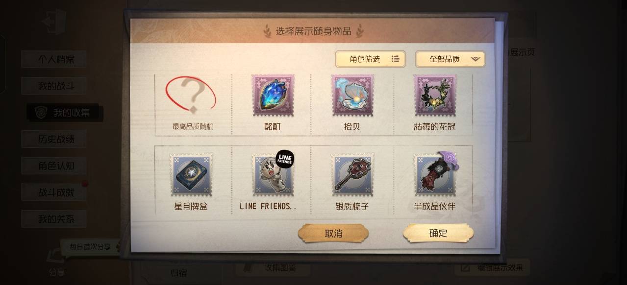 随身物品: 酷丁 拾贝 枯萎的花冠 星月牌盒 银质梳子 LINE FRIENDS 半成品伙伴