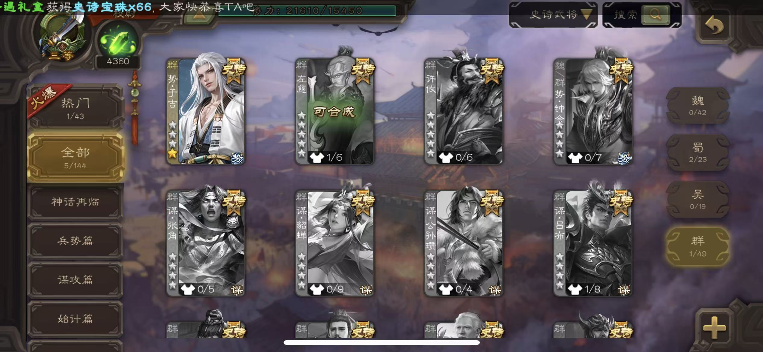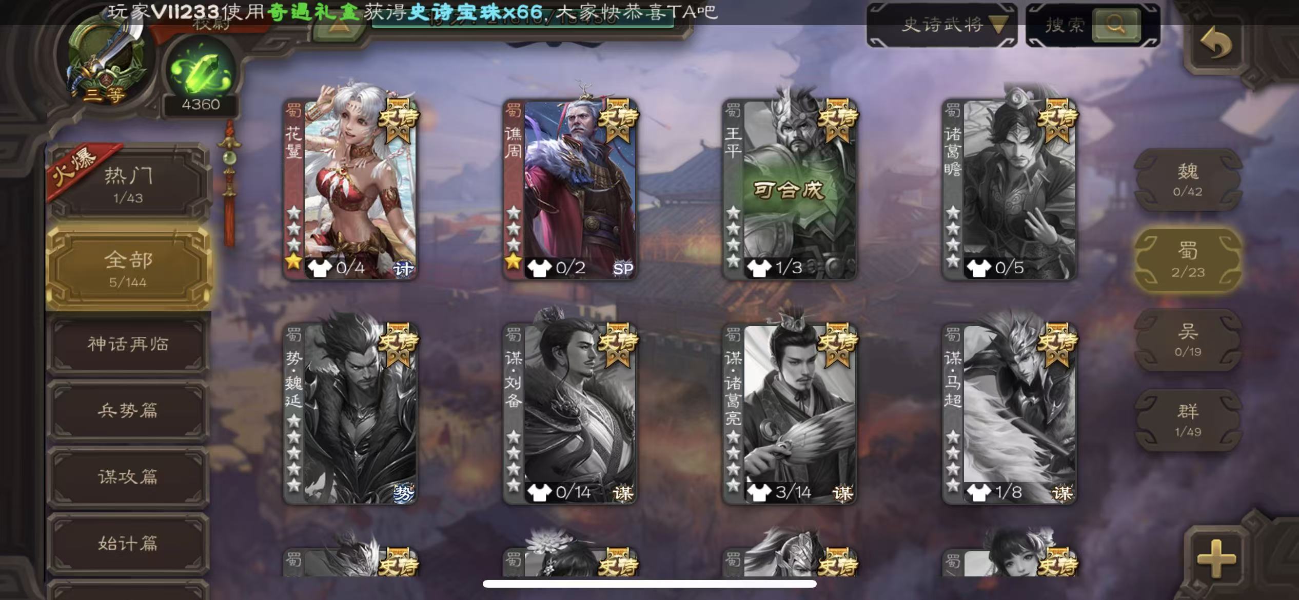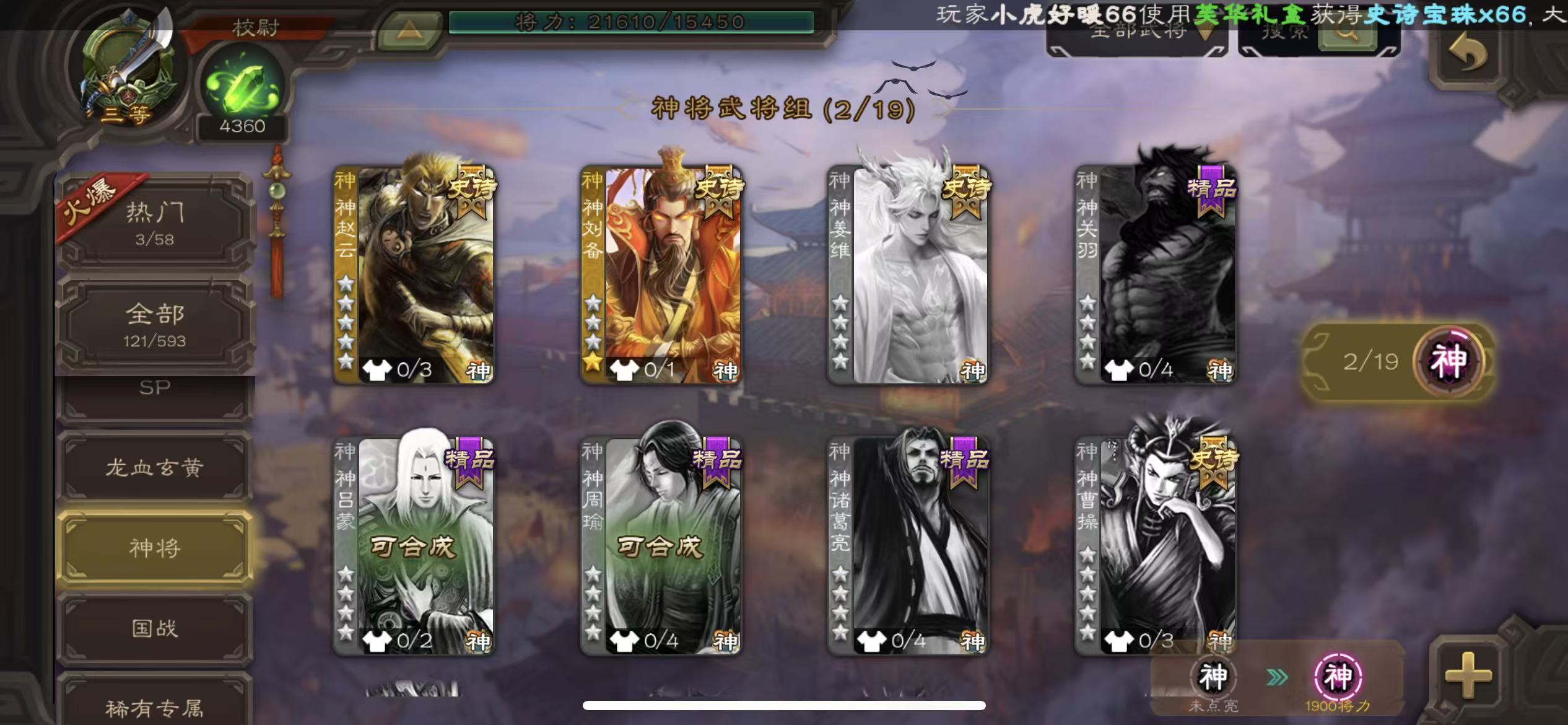 商品描述:校尉势于吉花花谯周神赵云神刘备4300将魂,有白马的动皮肤三卡