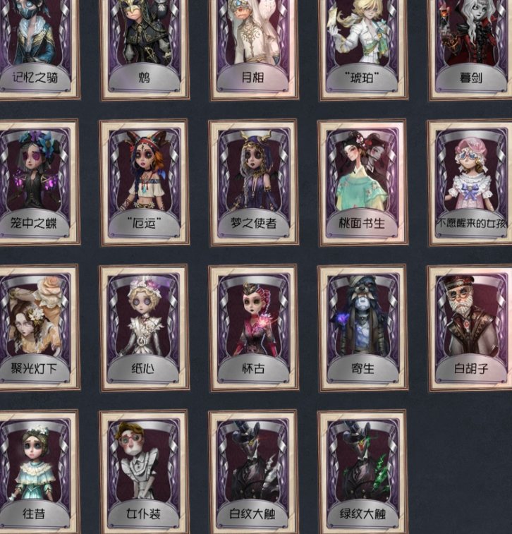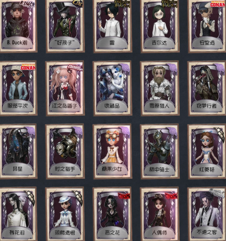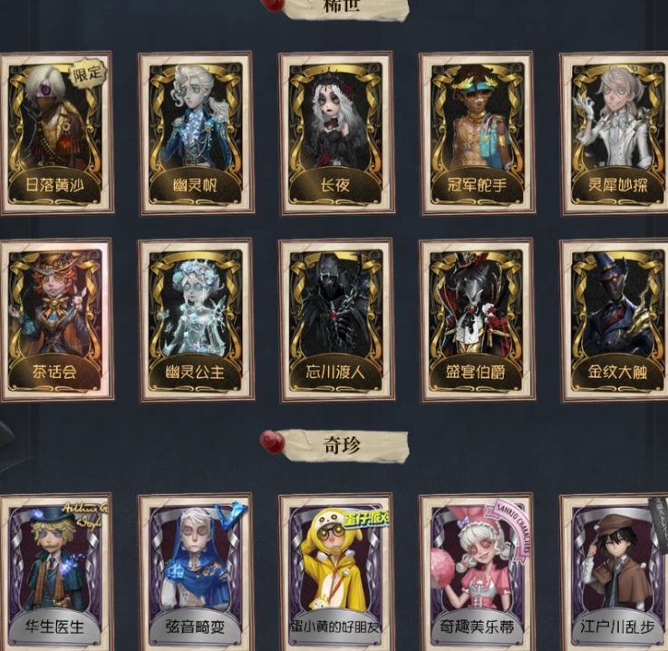 【稀世时装】10,日落黄沙/幽灵帆/长夜/冠军舵手/灵犀妙探/茶话会/幽灵公主/忘川渡人/盛宴伯爵/金纹大触 【奇珍时装】64,华生医生/弦音畸变/蛋小黄的好朋友/奇趣美乐蒂/江户川乱步/B.Duck潮/“好孩子”/雷/吉尔达/安室透/服部平次/江之岛盾子/收藏品/雪原猎人/窃梦行者/异星/时之猎手/糖果少女/林中骑士/红菱艳/残花泪/琼楼遗恨/恶之花/人偶师/不速之客/芳泽霞/坂本龙司/QUEEN/新岛真/“膨化”/吟游诗人/年岁/天使向导/裁纸机/电解/奶酪/“亡灵”/黑玫瑰/狡/ACE/雀舌/骨笛/“向导”/缄默者/羽蛇/记忆之骑/鸩/月相/“琥珀”/暮剑/笼中之蝶/“厄运”/梦之使者/桃面书生/不愿醒来的女孩/聚光灯下/纸心/怀古/寄生/白胡子/往昔/女仆装/白纹大触/绿纹大触 【随身物品】71,毁誉之印/黄玫瑰之骸/噬魂/虎尾/酩酊/微型护卫/“全熟”/深海祝祷/漂浮/凝固的声音/海之低语/子夜来使/急冻核心/凝结的梦境/纯银子弹/蝶醉/机械之心/催眠仪/星星糖/剪骨钳/幽灵提灯/星象仪/加拉尔/盛宴之杯/玫瑰手杖(蓝)/凝聚之水/不焚之羽/一步之遥 【随从】13,摩尔加纳/Jingle/迷你黄衣/迷你杰克