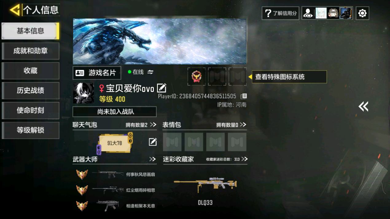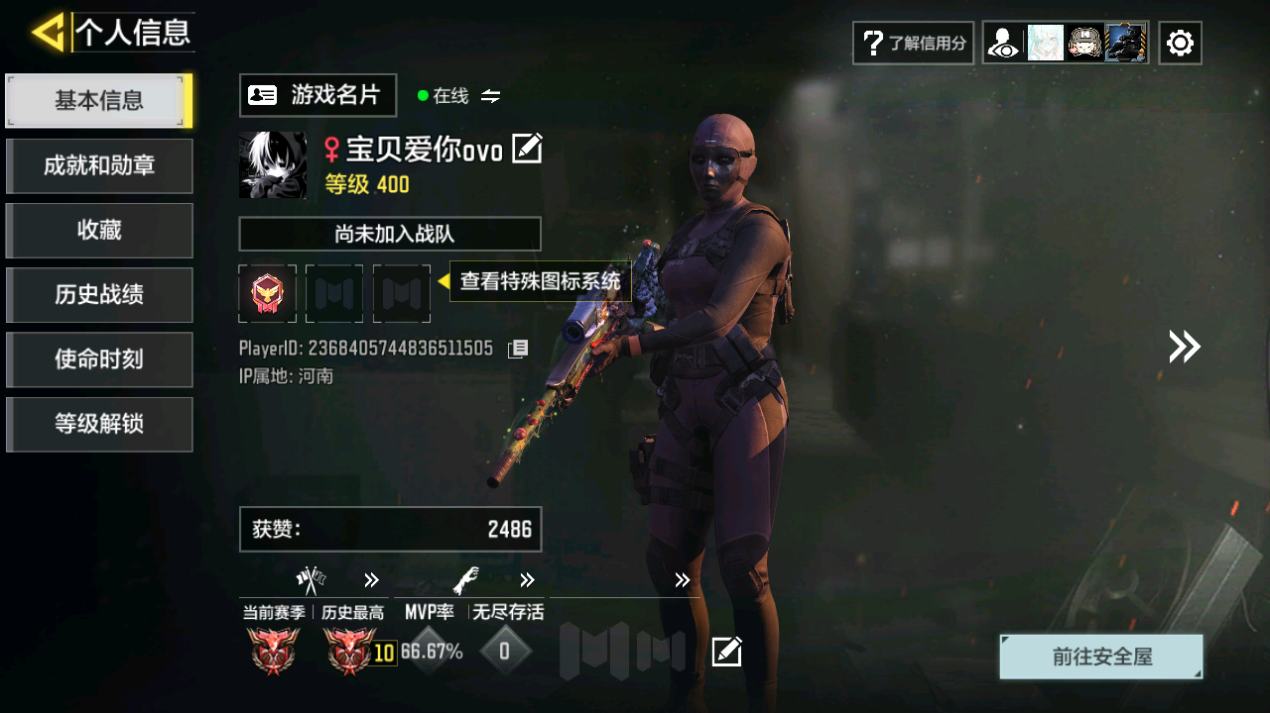 [14832631]400级 2神话 9传说 261史诗 段位铂金 可二次 可修改实名 【神话枪械】:AK117-熔岩,USS9-焕光跃迁【传说枪械】:M4-皇家黑魂,S36-甜心诱惑,FFAR 1-星彩乐手,Locus-红色彗星,Fennec-阿克西斯奇迹,AK47-火箭炮,RPD-一路悠扬,电棍-永恒炽热,CR56-回音律动