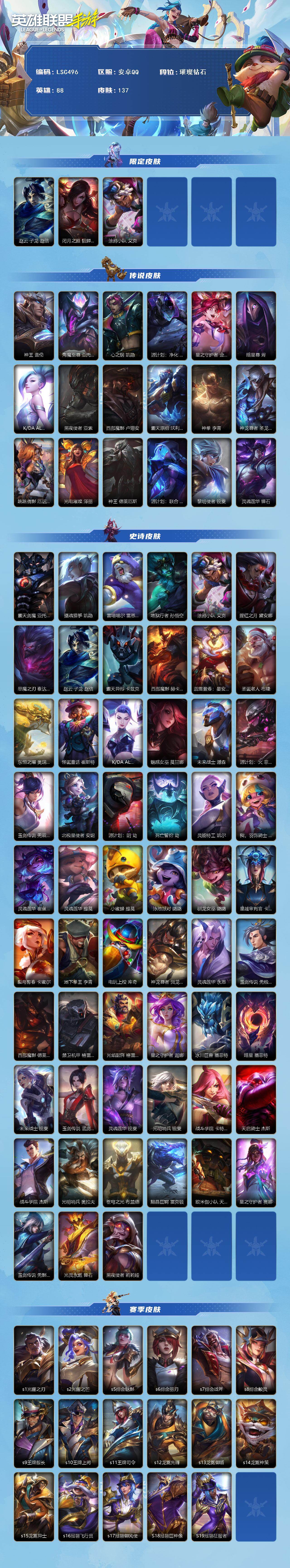 商品描述:【LSC496】88英雄/137皮肤/18传说/璀璨钻石/赵云 子龙 赵信/闭月之颜 貂蝉 卡特琳娜/涂鸦小队 艾克/神王 盖伦/海魔至尊 亚托克斯/心之钢 凯隐/源计划:净化 薇恩/星之守护者 金克丝/暗星尊 烬/K/DA ALL OUT 萨勒芬妮/黑夜使者 亚索/西部魔影 卢锡安/霸天原祖 沃利贝尔/神拳 李青/神龙尊者 圣龙 李青/跳跳倩影 厄运小姐/光电璀璨 泽丽/神王 德莱厄斯/源计划:联合 艾希/黎明使者 锐雯/灵魂莲华 锤石/霸天剑魔 亚托克斯/摄魂猎手 凯隐/雷喵喵尔 雷恩加尔/地狱行者 孙悟空/腥红之月 黛安娜/恶魔之刃 泰达米尔/霸天异形 卡兹克/西部魔影 赫卡里姆/蕊雪
