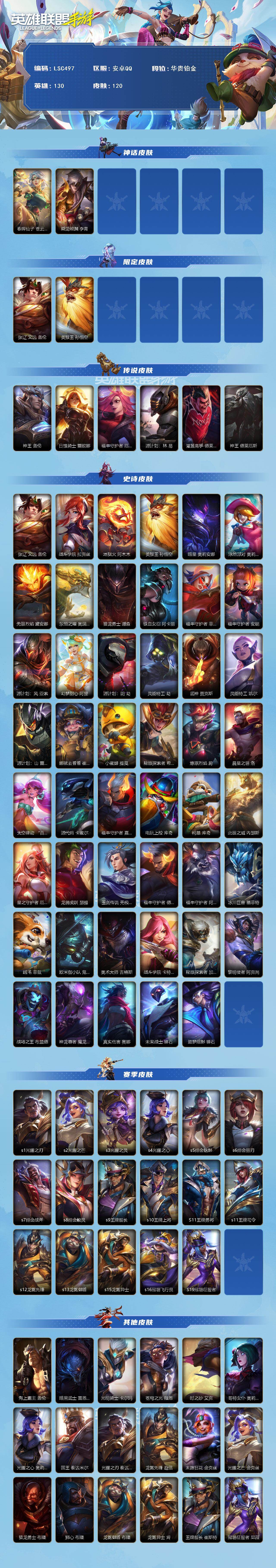 商品描述:【LSC497】130英雄/120皮肤/华贵铂金/春晖仙子 苍云缥缈 卡莎/乘龙破渊 李青/张辽 文远 盖伦/美猴王 孙悟空/神王 盖伦/日蚀骑士 蕾欧娜/福牛守护者 厄运小姐/源计划:林 易/灌篮高手 德莱厄斯/神王 德莱厄斯/战斗学院 拉克丝/地狱火 阿木木/暗星 奥莉安娜/泳池派对 奥莉安娜/无限烈焰 黛安娜/东恒之曜 奥瑞利安·索尔/猎龙勇士 潘森/铁血女忍 阿卡丽/福牛守护者 菲奥娜/福牛守护者 安妮/源计划:风 亚索/幻梦甜心 阿狸/源计划:阴 劫/灵能特工 劫/武神 贾克斯/灵能特工 凯尔/源计划:山 蕾欧娜/娜就去看看 崔丝塔娜/小蜜蜂 提莫/秘旅探索者 希瓦娜/燎原烈焰 蔚