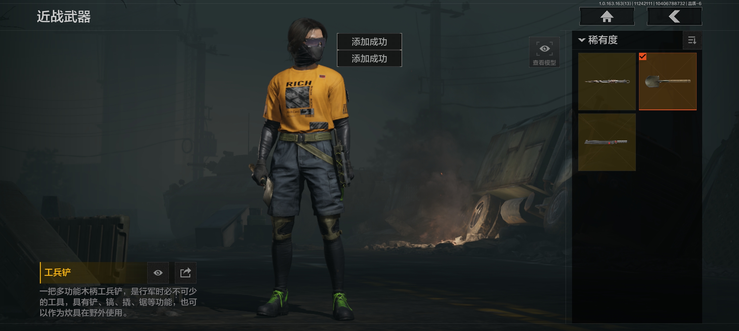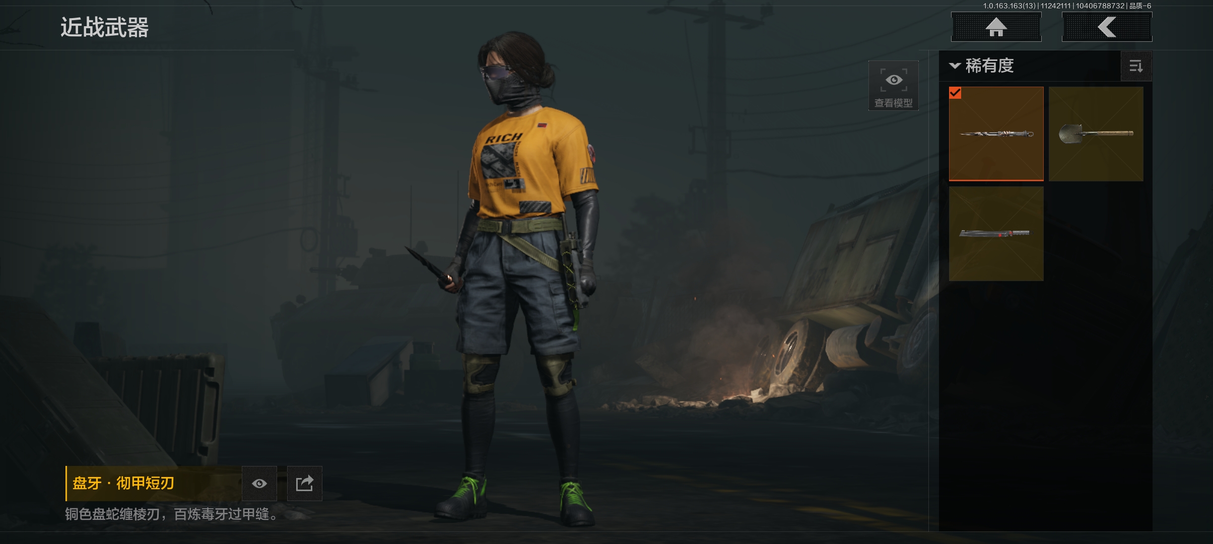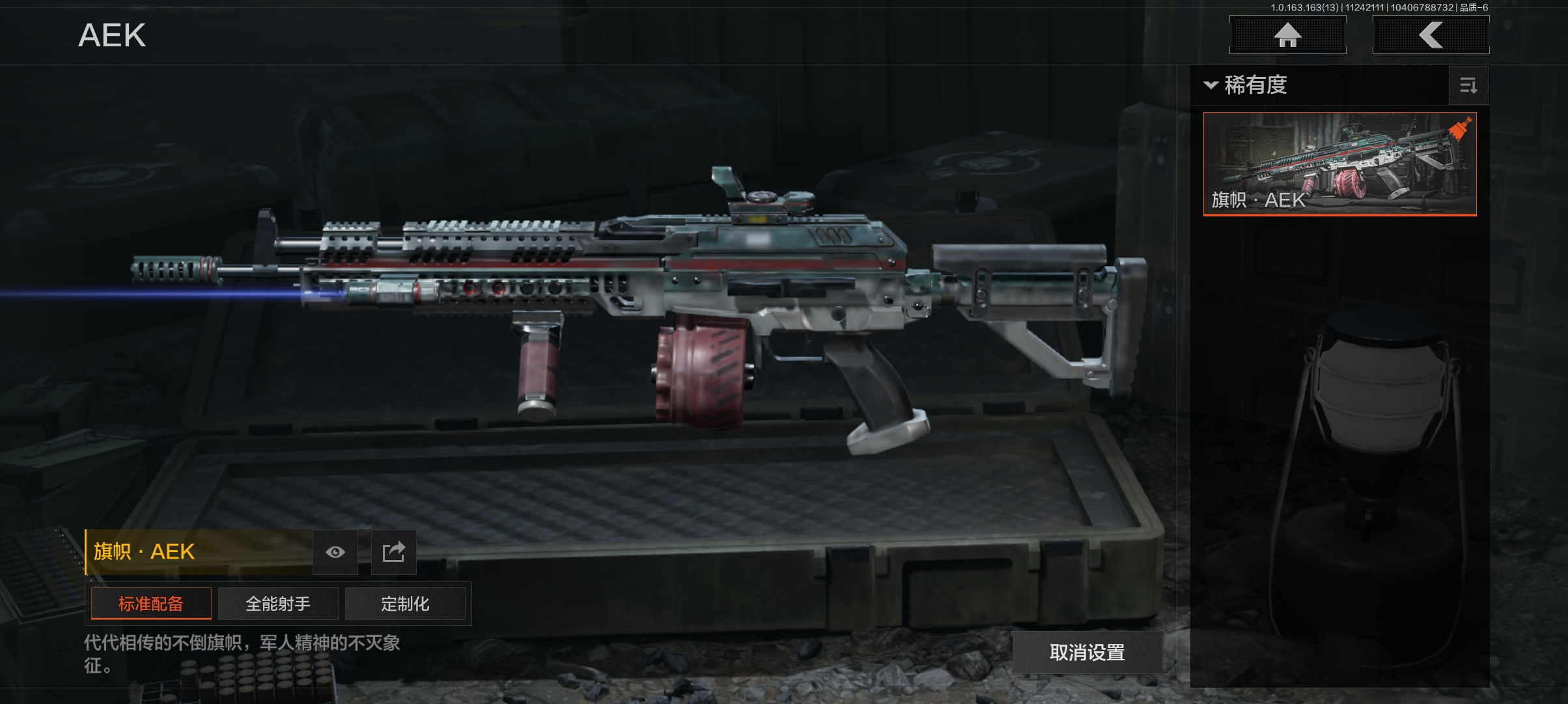 商品描述:DSTW1631【仓库价值85.3M 工兵铲,开山刀,盘牙卸甲短刃,4金枪】安卓Q-等级30-科恩币2275k 【枪皮】 告丧夜曲·AR57 棱光裂变·QBU191 旗帜·AEK 骑士之剑·VSS 玄戈梨花·VSS 【刀皮】 盘牙·彻甲短刃 来战·开山刀 工兵铲