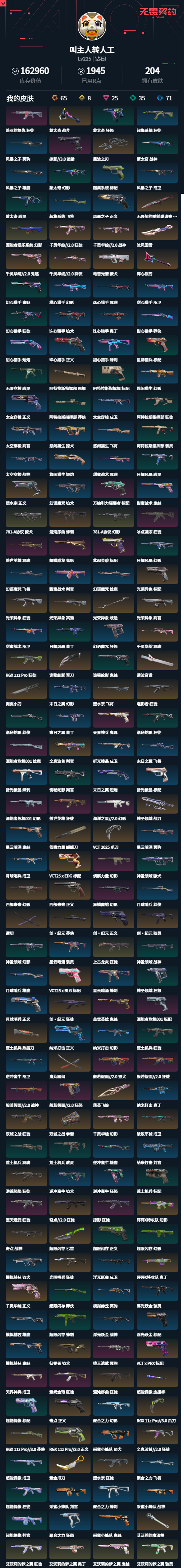 HK649/162960皮肤总价值/23刀皮/181枪皮(热门枪皮21狂徒9幻影6正义5鬼魅4冥驹2骇灵7标配2戍卫4獠犬1蜂刺2判官1雄鹿1飞将3莽侠2奥丁3战神);【套装】: 千灵华绽2.0套装/ 创纪元套装/ 光荣异象套装/ 显卡3.0套装/ 双城之战2.0套装/ 艾沃莉的梦之翼套装/ 般若假面2.0套装;【刀皮】:近战武器-VCT2025爪刀/近战武器-双城之战拳套/近战武器-显卡3.0爪刀/近战武器-闪耀之星荧光棒/近战武器-鬼丸国纲/近战武器-剥皮小刀/近战武器-艾沃莉的魔法棒/近战武器-紫金爪刀/近战武器-超限闪存匕首/近战武器-侦察力量蝴蝶刀/近战武器-黑波之刃/近战武器-落英飞旋/近战武器-荒土机兵热能刀/近战武器-诡秘蛇影军刀/近战武器-谐波音谱/近战武器-神圣领域战刀/近战武器-镭切/近战武器-光荣异象歧途/近战武器-阿特拉斯指挥部甩棍/近战武器-碎心裂刃/近战武器-流风回雪/近战武器-无畏契约季前邀请赛悲悯之刃/近战武器-蒙太奇战斧;【枪皮】:标配-VCT25xBLG/标配-VCT25xEDG/标配-VCTxPRX/狂徒-双城之战/标配-光荣异象/鬼魅-千灵华绽2.0/正义-显卡3.0/正义-奇点/正义-塑水宗/正义-千灵华绽/正义-创纪元/正义-西部未来/骇灵-创纪元/蜂刺-混沌序曲/判官-全息波普/判官-光荣异象/狂徒-全息波普2.0/狂徒-奇点2.0/狂徒-塑水宗/狂徒-光明哨兵/狂徒-洪荒怒焰/狂徒-混沌序曲/狂徒-创纪元/狂徒-噬影者/狂徒-RGX11zPro/狂徒-光荣异象/狂徒-千灵华绽2.0/幻影-砰砰X特攻队/幻影-千灵华绽/幻影-西部未来/戍卫-破败军械/獠犬-归零者/獠犬-电音光谱/冥驹-千灵华绽/冥驹-光荣异象/飞将-塑水宗/莽侠-显卡3.0/莽侠-创纪元/莽侠-千灵华绽2.0/奥丁-砰砰X特攻队/战神-奇点/战神-千灵华绽2.0/鬼魅-艾沃莉的梦之翼/骇灵-艾沃莉的梦之翼/狂徒-艾沃莉的梦之翼/狂徒-上古龙炎/幻影-781-A协议/幻影-源能者娱乐系统/獠犬-781-A协议/奥丁-艾沃莉的梦之翼/标配-紫阙金琅/标配-源能者危机001/标配-万铀引力辐爆者/鬼魅-盖世英雄/鬼魅-耀鳞威龙/鬼魅-天界神兵/狂怒-般若假面2.0/追猎-掠影3.0/雄鹿-源能者危机001/狂徒-掠影/狂徒-盖亚的复仇/狂徒-紫阙金琅/狂徒-堕天遗武/狂徒-冰点凝冻/狂徒-盖世英雄/狂徒-般若假面2.0/幻影-侦察力量/幻影-源能者危机001/幻影-异鳞魔蛇/幻影-海洋之星2.0/戍卫-天界神兵/獠犬-般若假面2.0/冥驹-堕天遗武/冥驹-盖世英雄/战神-般若假面2.0/标配-星际猎兵/鬼魅-诡秘蛇影/狂怒-蒙太奇/骇灵-蒙太奇/骇灵-无限竞技/判官-诡秘蛇影/狂徒-诡秘蛇影/幻影-蒙太奇/莽侠-诡秘蛇影/战神-蒙太奇/标配-超集系统/正义-风暴之子/雄鹿-风暴之子/狂徒-超集系统/戍卫-风暴之子/冥驹-风暴之子/飞将-超集系统/狂徒-幻心猎手/狂徒-阿特拉斯指挥部/狂徒-荒土机兵/狂徒-超能偶像/幻影-日耀风暴/幻影-神圣领域/幻影-超限闪存/戍卫-超能偶像/獠犬-神圣领域/冥驹-荒土机兵/莽侠-阿特拉斯指挥部/莽侠-超限闪存/正义-超限闪存/鬼魅-幻心猎手/标配-阿特拉斯指挥部/标配-荒土机兵/标配-超能偶像/狂怒-神圣领域/骇灵-阿特拉斯指挥部/骇灵-日耀风暴/骇灵-荒土机兵/蜂刺-超限闪存/判官-超能偶像/奥丁-日耀风暴/战神-神圣领域/幻影-甜心猎手/幻影-悠闲猫生/幻影-末日之翼/幻影-纳米打击/幻影-聚合之力/戍卫-甜心猎手/戍卫-太空穿梭/戍卫-甜蜜战术/戍卫-折光棱晶/戍卫-月球哨兵/戍卫-逆冲蛮牛/戍卫-浮光跃金/獠犬-诛心猎手/獠犬-悠闲猫生/獠犬-幻语魔咒/獠犬-逆冲蛮牛/獠犬-模拟赫兹/獠犬-采蜜小蜂队/冥驹-诛心猎手/冥驹-甜蜜战术/冥驹-星云暗涌/冥驹-模拟赫兹/莽侠-甜心猎手/莽侠-月球哨兵/飞将-悠闲猫生/飞将-幻语魔咒/飞将-末日之翼/飞将-聚合之力/正义-诛心猎手/正义-太空穿梭/正义-月球哨兵/正义-纳米打击/鬼魅-甜蜜战术/鬼魅-星云暗涌/鬼魅-模拟赫兹/鬼魅-采蜜小蜂队/标配-折光棱晶/标配-浮光跃金/短炮-甜心猎手/短炮-悠闲猫生/短炮-末日之翼/狂怒-幻语魔咒/狂怒-逆冲蛮牛/狂怒-聚合之力/骇灵-星云暗涌/骇灵-浮光跃金/蜂刺-甜心猎手/蜂刺-折光棱晶/蜂刺-星云暗涌/蜂刺-聚合之力/判官-太空穿梭/判官-甜蜜战术/判官-纳米打击/判官-采蜜小蜂队/雄鹿-幻语魔咒/雄鹿-月球哨兵/雄鹿-逆冲蛮牛/雄鹿-模拟赫兹/奥丁-诛心猎手/奥丁-末日之翼/奥丁-纳米打击/战神-太空穿梭/战神-浮光跃金/战神-采蜜小蜂队;