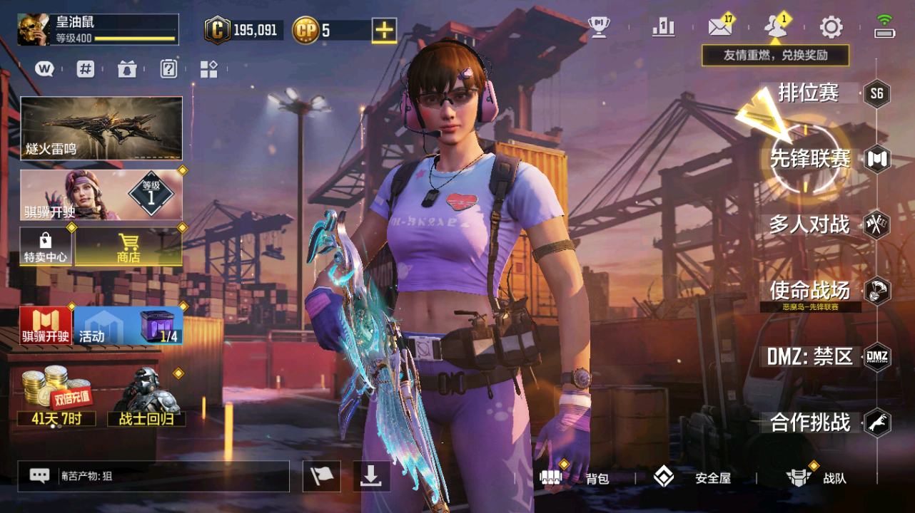 [14832631]400级 2神话 9传说 261史诗 段位铂金 可二次 可修改实名 【神话枪械】:AK117-熔岩,USS9-焕光跃迁【传说枪械】:M4-皇家黑魂,S36-甜心诱惑,FFAR 1-星彩乐手,Locus-红色彗星,Fennec-阿克西斯奇迹,AK47-火箭炮,RPD-一路悠扬,电棍-永恒炽热,CR56-回音律动