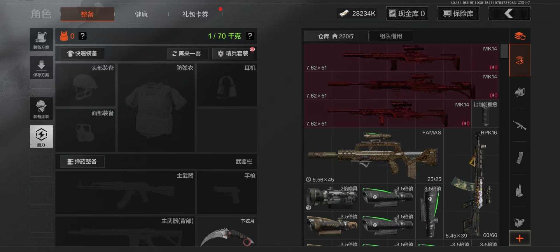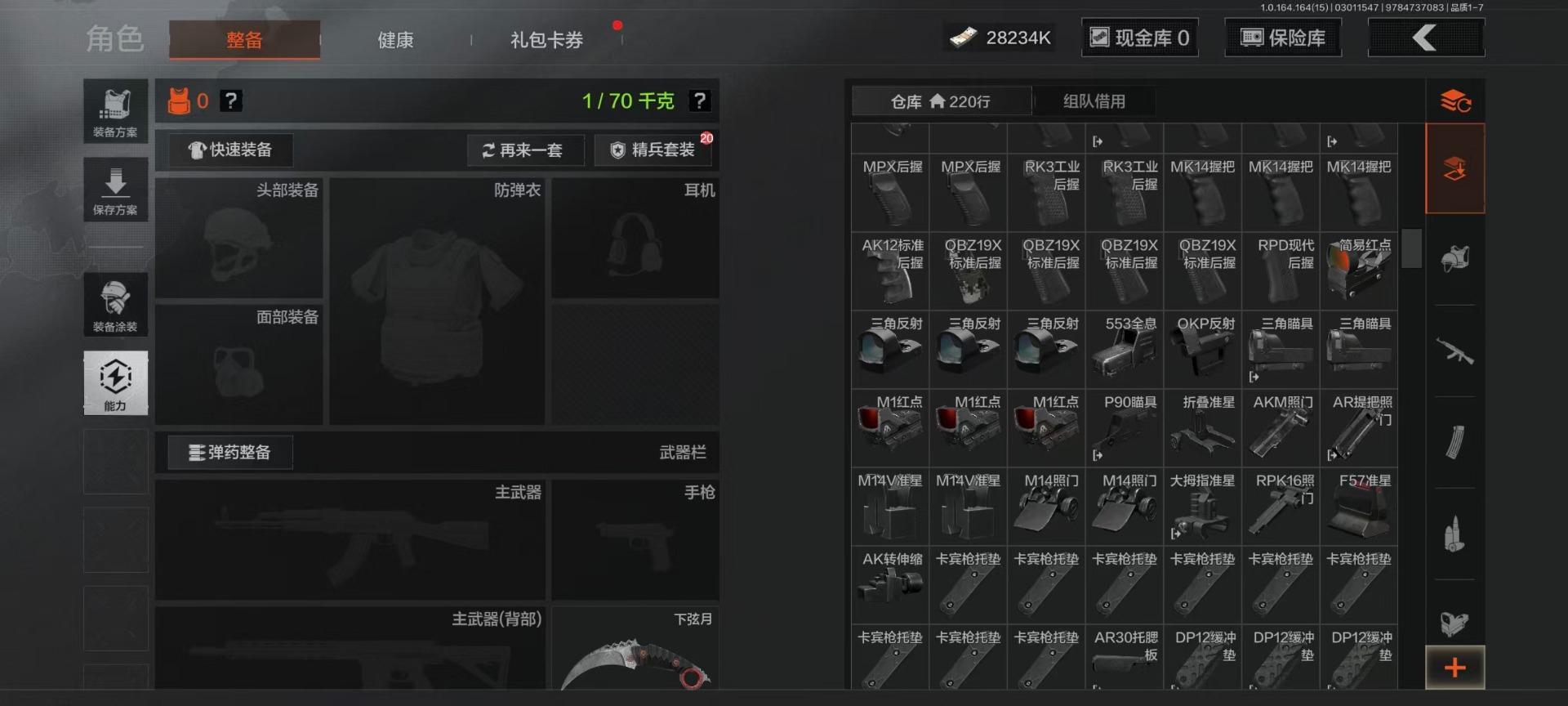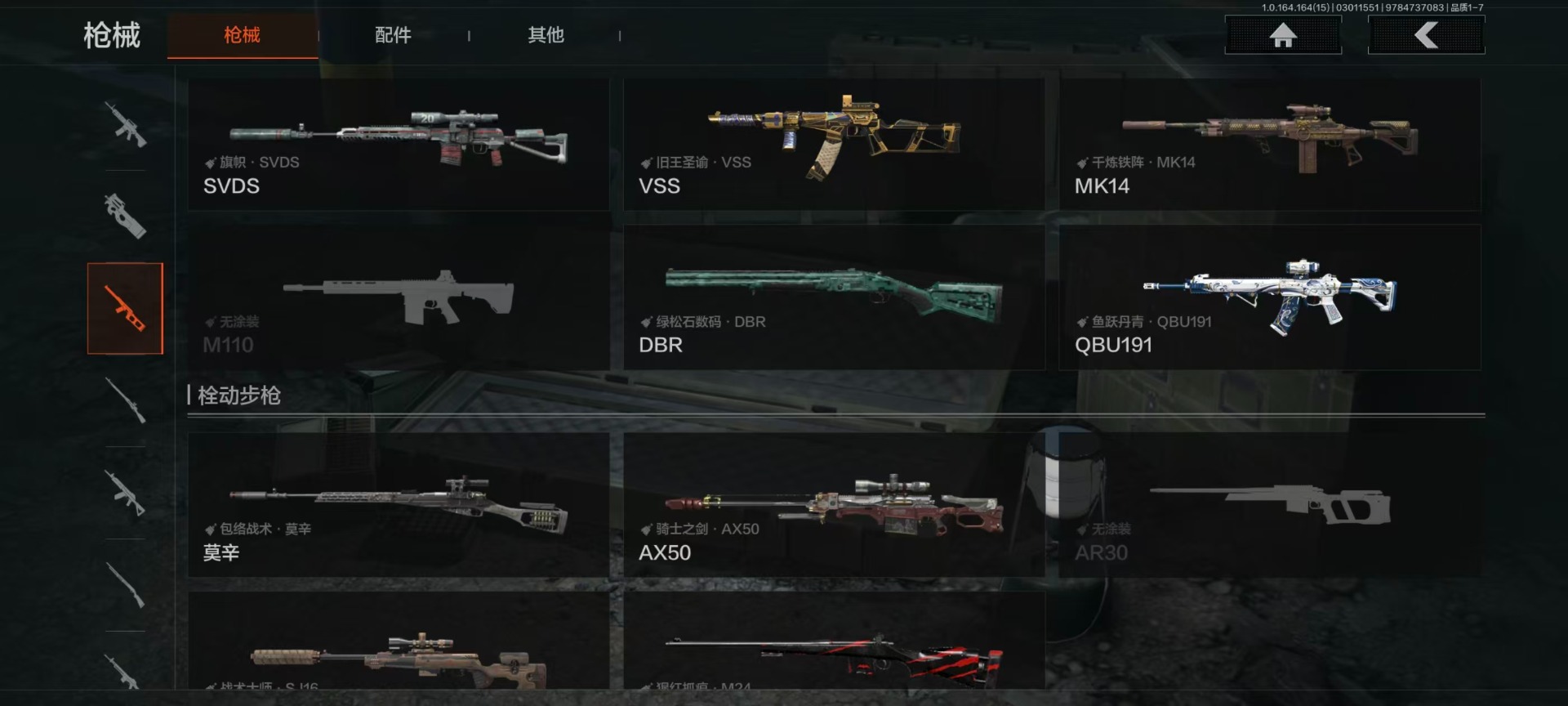 【AQZG1612】等级:30/段位:暗区传说/仓库价值(百万):54.6/柯恩币:284238/角弓得控手套/急袭弯刀/胜利军刀/盘牙彻甲短刃/赢家匕首/蝮蛇/冥河/苍白隐者伪装服/深潜行者II/钢铁壁垒作战服/机车朋克战衣/冰河碎影MK14/骑士之剑VSS/钢铁真理QBZ191/竞技FAL/诸星之子FAL/林中人FAL/蓝色咆哮H416/冬夜AK12/棱光裂变QBU191[17467567]库存价值36.7 3近战武器 10金枪皮 可修改实名 【柯恩币数量】1.1m 【近战武器】突击匕首,工兵铲,涂鸦利刃 【金色枪皮】地脉深处·ACE31,包络战术·AKM,战术大师·AN94,旧王圣谕·VSS,镀火熔金·H416,旧王圣谕·QBZ191,旗帜·AEK,利齿风暴·MPX,告丧夜曲·AR57,骑士之剑·VSS 【紫色枪皮】伦琴计量·SCAR,鱼跃丹青·QBU191,鱼跃丹青·DT MDR,鱼跃丹青·AK102,典礼武备·14,猩红羽翼·VSS,火力倾泻·AUG,棱光裂变·AKM,利齿风暴·T79,利齿风暴·T03,粉绒臻选·AN94,包络战术·莫辛,动感舞步·ACE31,包络战术·AK74N,宝石籽料·T951,宝石籽料·S12K,宝石籽料·AR15,宝石籽料·FAMAS,宝石籽料·P90,宝石籽料·MPX,战术大师·Suomi,战术大师·SVDS,旗帜脉冲·M110,骑士之剑·Groza,涂鸦·MPX,涂鸦·G18C,最后防线·AEK 【角色装扮(紫)】王国卫队礼装,等高线运动套装,和平先锋作战套装,财团之手作战套装,台风IV竞技运动服