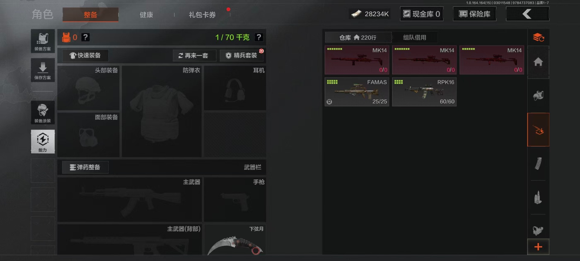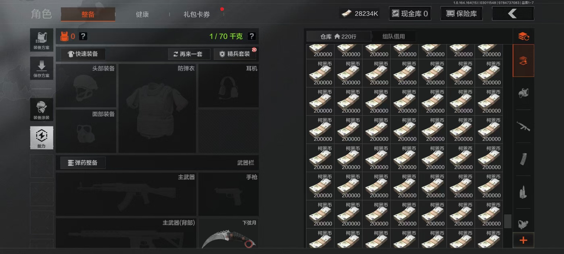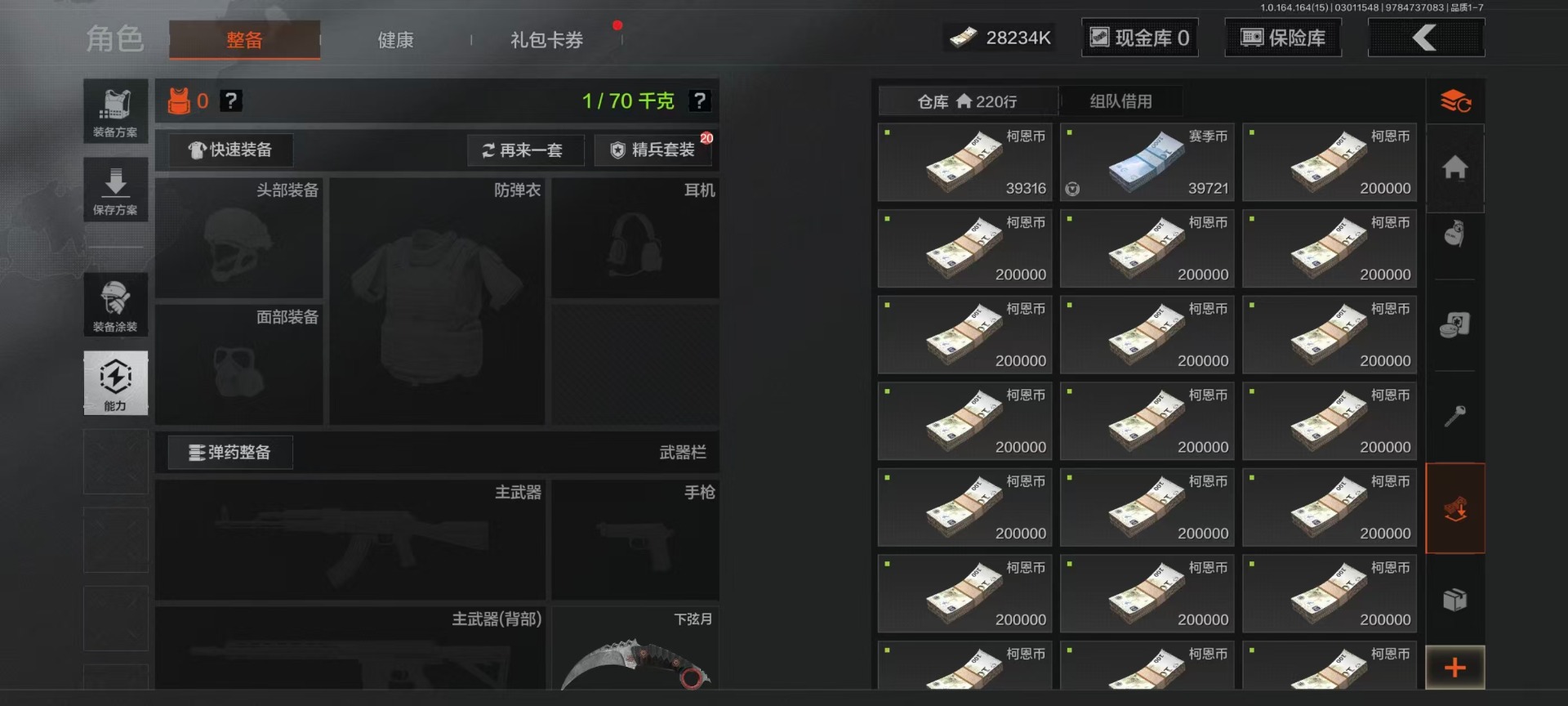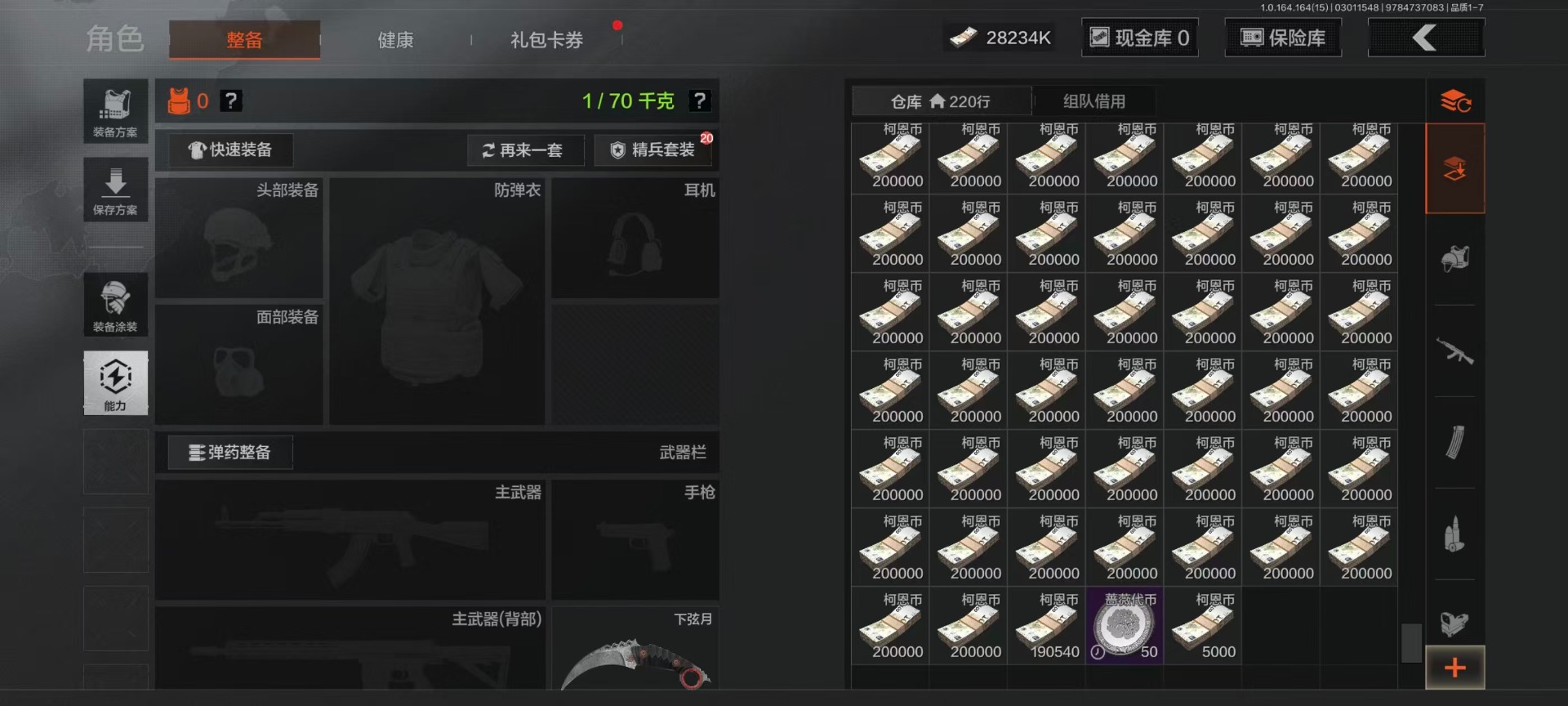 [17410385]库存价值4.9 3近战武器 4金枪皮 可修改实名 【柯恩币数量】2310k 【近战武器】突击匕首,空腔战术,工兵铲 【金色枪皮】战术大师·AN94,利齿风暴·MPX,告丧夜曲·AR57,告丧夜曲·AUG 【紫色枪皮】正在骇入·M16,火力倾泻·AUG,棱光裂变·AK74N,棱光裂变·ACE31,火力倾泻·AKM,竞技·MDR,利齿风暴·T79,骤羽尖啸·AK12,宝石籽料·MPX,战术大师·Suomi,战术大师·SKS,战术大师·SVDS,战术大师·SJ16,骑士之剑·沙漠之鹰,白狼连队·VSS,全地形数码·M110,骑士之剑·14,炎夏浪花·H416,湖冰倒影·MP5,涂绘猎人·AR57,07式林地迷彩·QBZ191,玄戈梨花·T03,玄戈梨花·MPX 【角色装扮(紫)】高地武士套装,王国卫队礼装