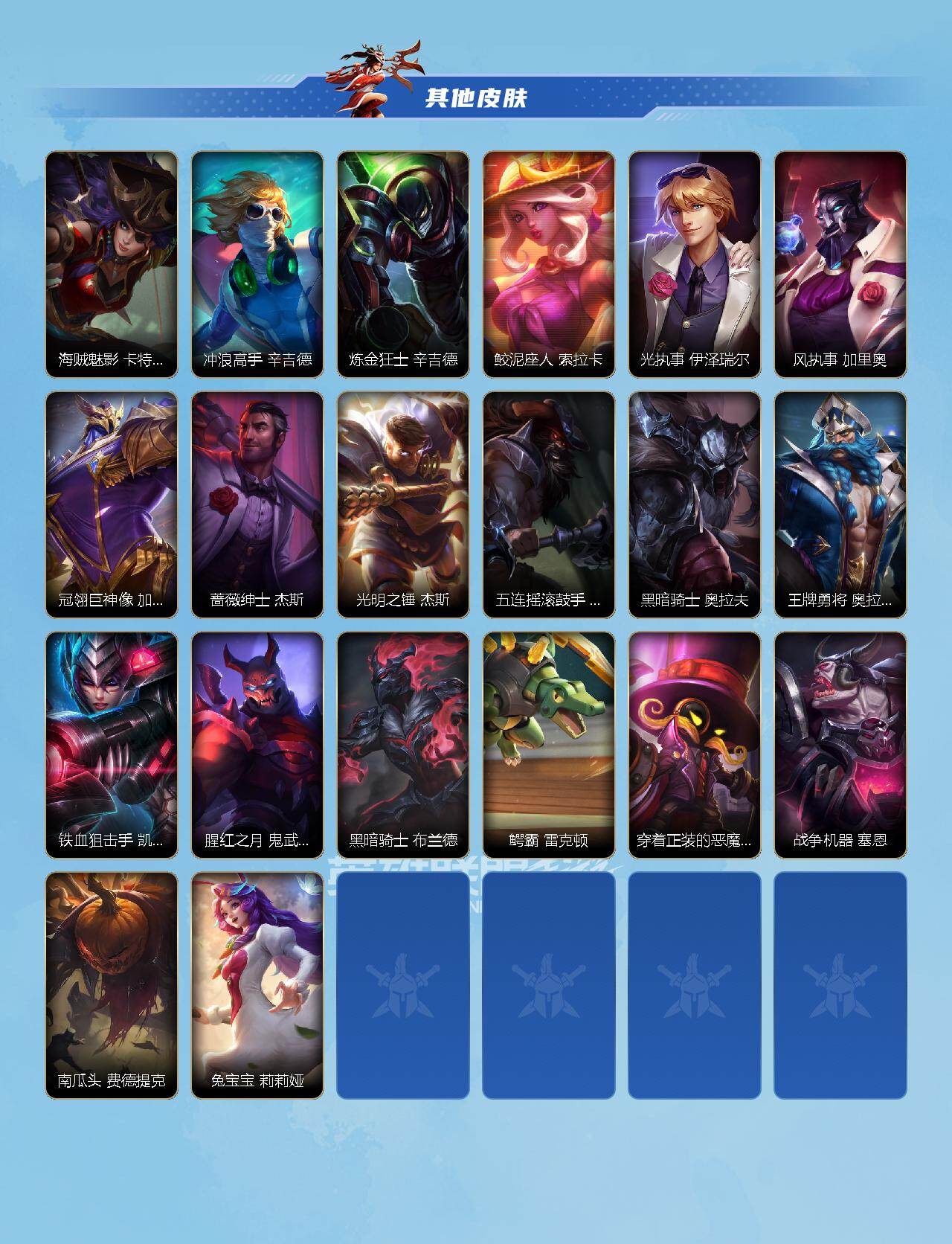 商品描述:【LSC502】135英雄/392皮肤/华贵铂金/桃映暖春 灼灼芳菲 拉克丝/夜星流火 金克丝/渔帆满载 亚索/黎明使者 破晓之殇 佛耶戈/天命豪赌 瑟提/巡游踏云霄! 墨菲特/涂鸦小队 斑斓艺术 布兰德/水晶玫瑰 永恩/山海绘卷 烬/山海绘卷 沃利贝尔/神王 盖伦/海魔至尊 亚托克斯/心之钢 凯隐/源计划:净化 薇恩/光明哨兵 薇恩/真实伤害 艾克/北极星神 黛安娜/暗星尊 烬/青花瓷 奥瑞利安·索尔/春晖神裔 辛德拉/星域游侠 崔斯特/水晶玫瑰 卡莎/春晖神女 莫甘娜/魔女 伊芙琳/星之守护者 阿卡丽/太空律动 “猫猫”布里和里茨 布里茨/源计划:超体 莫德凯撒/黑夜使者 亚索/神龙尊者
