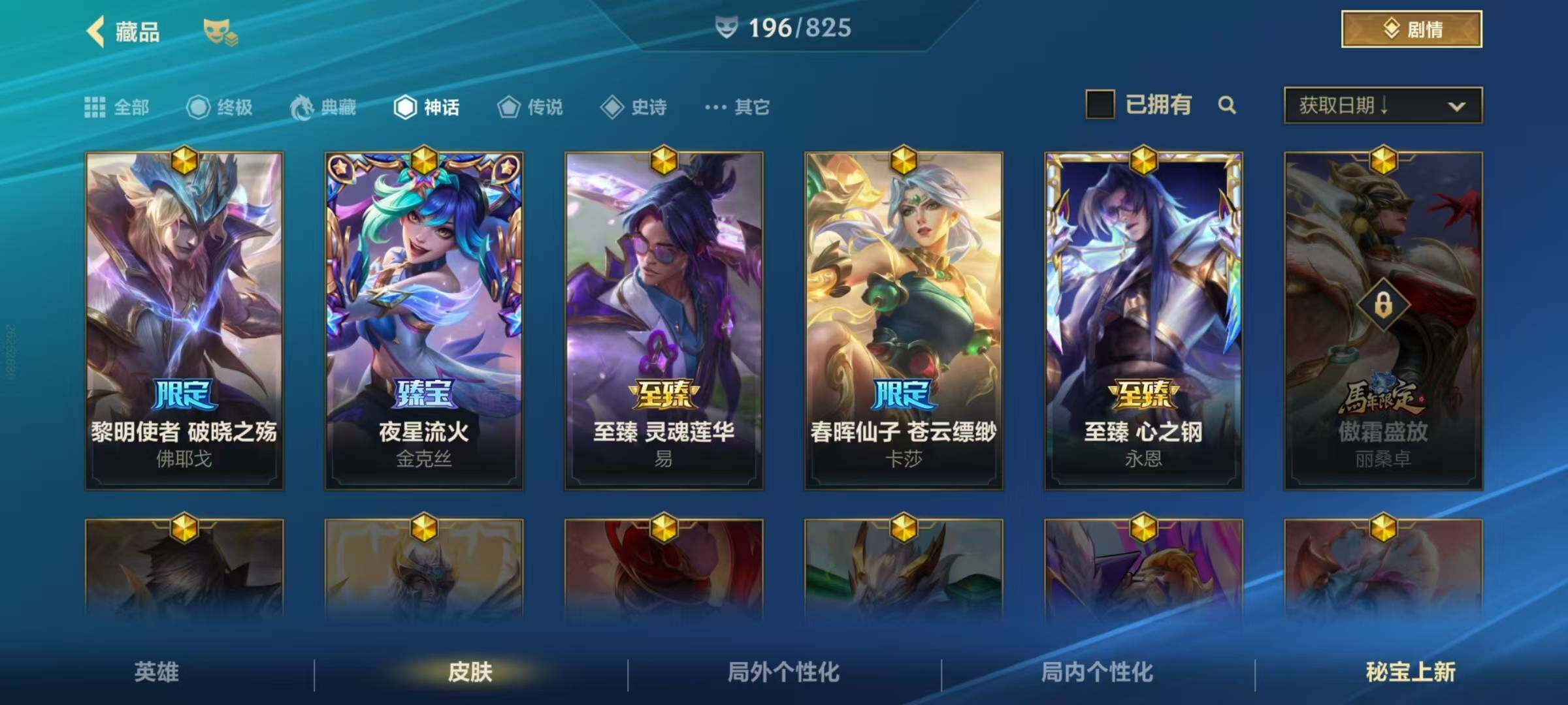 C安卓微信区:可二次实名 回城特效紫气东来 英雄133 皮肤409 11神话35传说238史诗 傲世宗师 至臻喵喵魅影金克丝 黎明使者破晓之殇佛耶戈 夜星流火金克丝 乘龙破渊李青 冠星耀辰盖伦 海克斯科技嘉文四世 龙的传人李青 龙吟九霄李青 摄魂使者薇恩 无与伦比易 战斗学院白金学长伊泽瑞尔安卓微信区:可二次实名 英雄131 皮肤378 1终极4神话31传说194史诗 华贵铂金Ⅰ 【终极皮肤】1 寻道世尊永恩 【典藏皮肤】0 【神话皮肤】4 夜星流火金克丝 满弓镇魂箭无虚发韦鲁斯 海克斯科技阿利斯塔 灰烬骑士派克