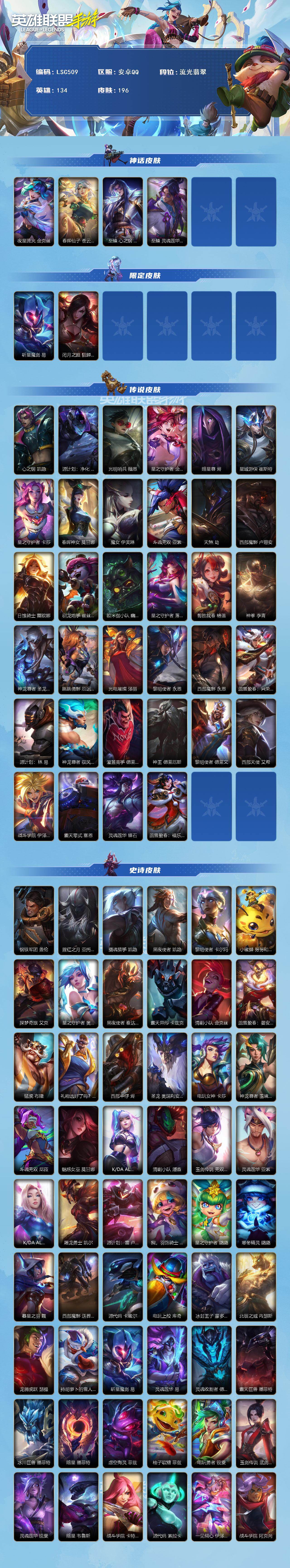 商品描述:【LSC509】134英雄/196皮肤/5神话/34传说/流光翡翠/夜星流火 金克丝/春晖仙子 苍云缥缈 卡莎/至臻 心之钢 永恩/至臻 灵魂莲华 易/斩星魔剑 易/闭月之颜 貂蝉 卡特琳娜/心之钢 凯隐/源计划:净化 薇恩/光明哨兵 薇恩/星之守护者 金克丝/暗星尊 烬/星域游侠 崔斯特/星之守护者 卡莎/春晖神女 莫甘娜/魔女 伊芙琳/斗魂无双 亚索/天煞 劫/西部魔影 卢锡安/日蚀骑士 蕾欧娜/驯龙炮手 崔丝塔娜/欧米伽小队 幽灵特工 提莫/星之守护者 落 霞/剪胜裁春 格温/神拳 李青/神龙尊者 圣龙 李青/跳跳倩影 厄运小姐/光电璀璨 泽丽/黎明使者 永恩/西部魔影 永恩/蕊雪盈春