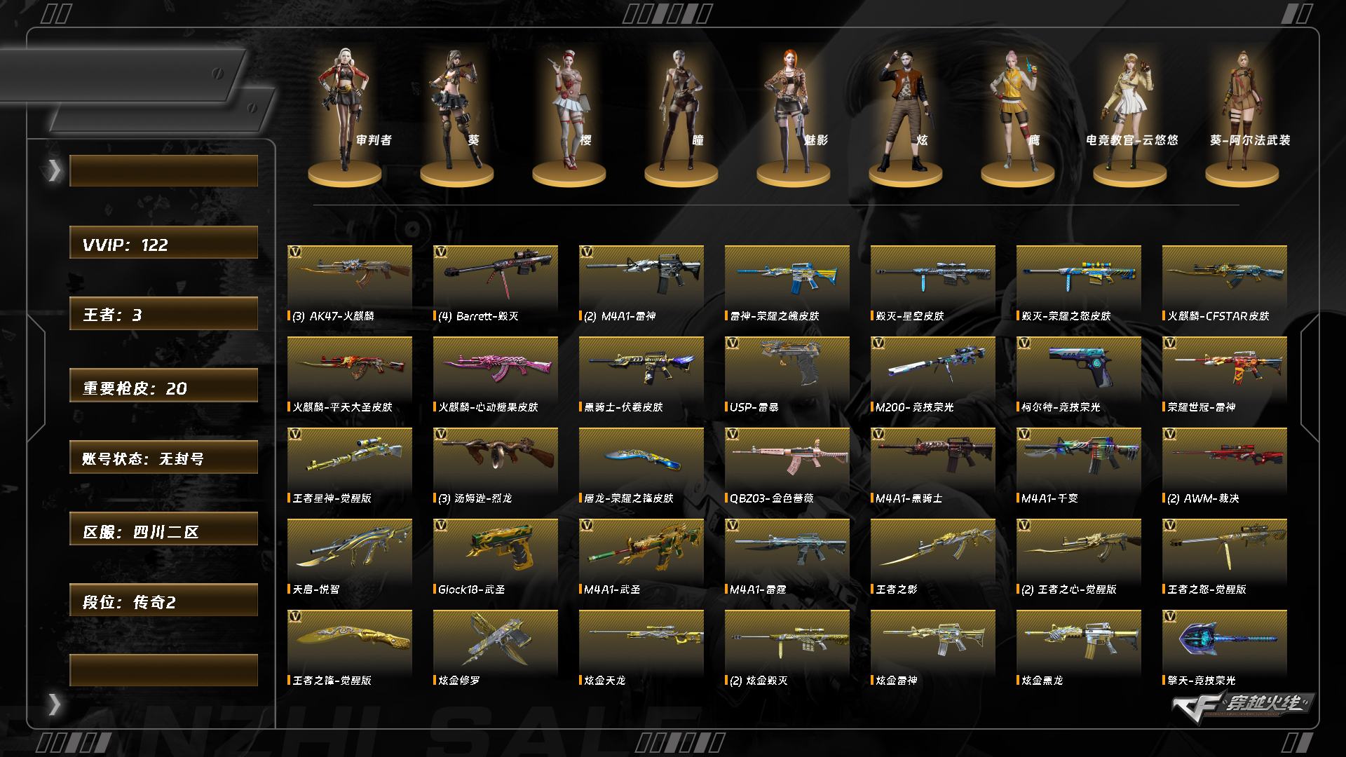 FWX5424/西部/陕西一区/可排位/102V/幻神/王者幻神/6修罗/COP堕天神/破空枪刃夜魔/4烈龙/2盘龙/朱雀/QBZ金色蔷薇/裁决/雷神/火麒麟/毁灭/黑骑士/黑龙/黑武士/火麒麟绝迹/火麒麟灵狐/王者春/【四防】/王者葵貂蝉/【四防】/凌霄/零/审判者/炫/王者救世主/新海豹突击队/修道士/职业选手/绝迹语音包/黑骑士音/火麒麟音效卡/毁灭音效卡/极光音效卡/黑龙音效卡/毁灭AG/火麒麟CFS2018/雷神宠儿/黑龙361/荣耀之锋/雷神荣耀之魄/火麒麟冠军之心/火麒麟AG无影霓裳/详情看下图