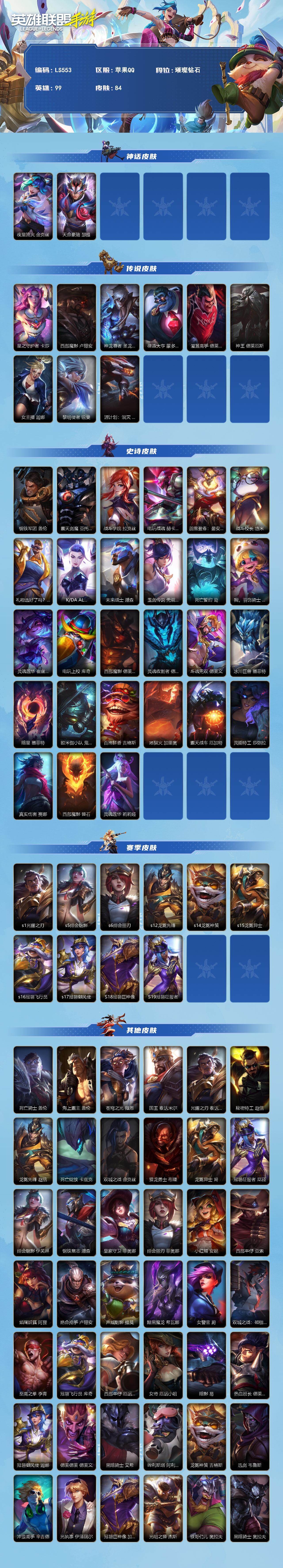 商品描述:【LS553】99英雄/84皮肤/璀璨钻石/夜星流火 金克丝/天命豪赌 瑟提/星之守护者 卡莎/西部魔影 卢锡安/神龙尊者 圣龙 李青/律政大亨 蒙多医生/灌篮高手 德莱厄斯/神王 德莱厄斯/女主播 迦娜/黎明使者 锐雯/源计划:泯灭 雷克顿/钢铁军团 盖伦/霸天剑魔 亚托克斯/战斗学院 拉克丝/电玩战魂 赫卡里姆/蕊雪盈春:晏安 赫卡里姆/战斗校长 悠米/礼物选好了吗? 布隆/K/DA ALL OUT 卡莎/未来战士 潘森/玉剑传说 无双 菲奥娜/死亡誓约 劫/我,羽饰骑士 崔丝塔娜/灵魂莲华 崔丝塔娜/电玩上校 库奇/西部魔影 德莱厄斯/灵魂收割者 德莱文/斗魂无双 德莱文/冰川巨兽 墨