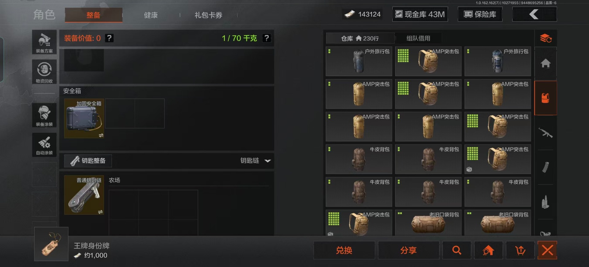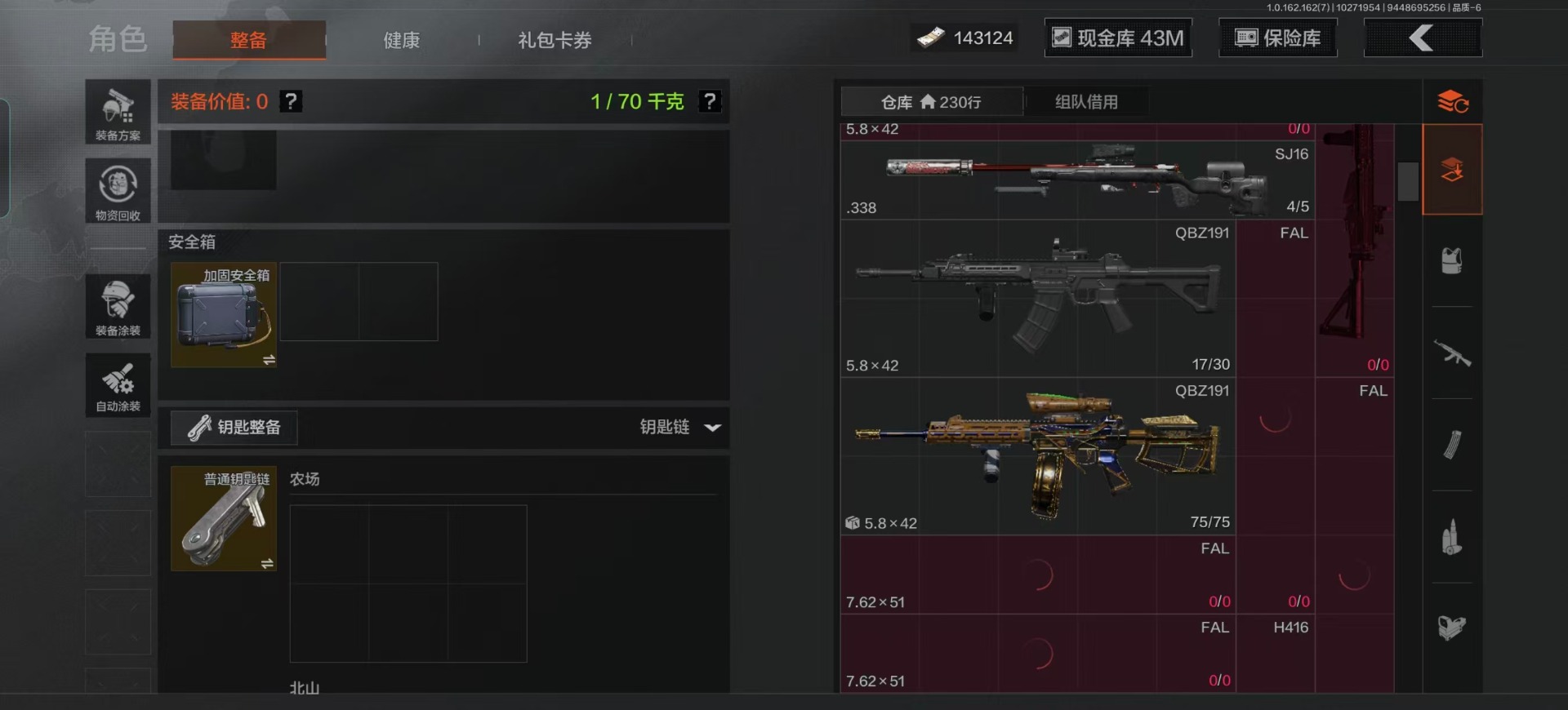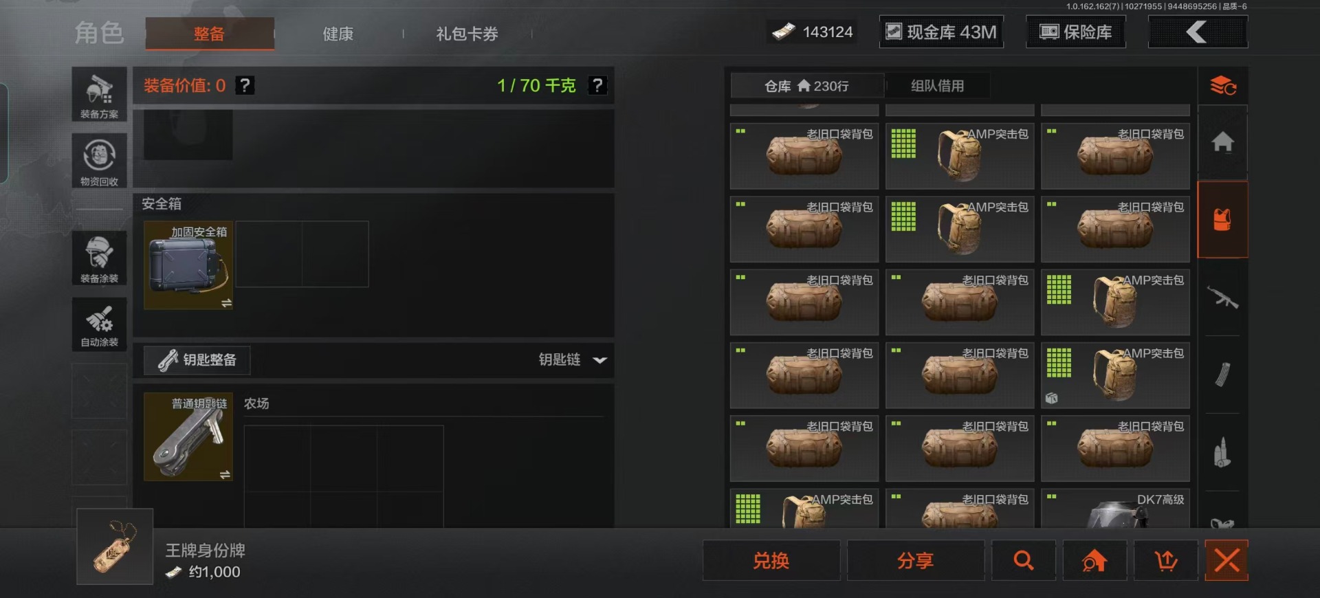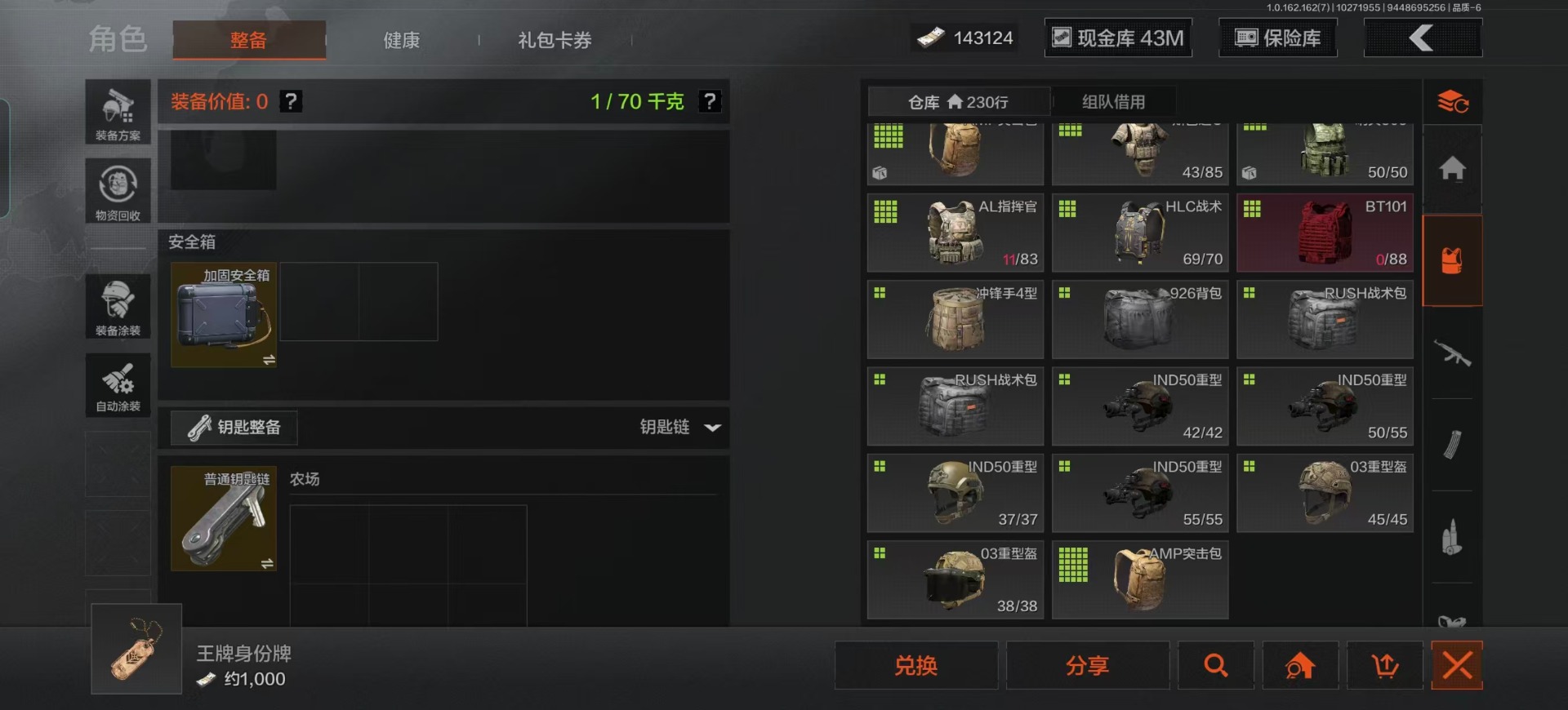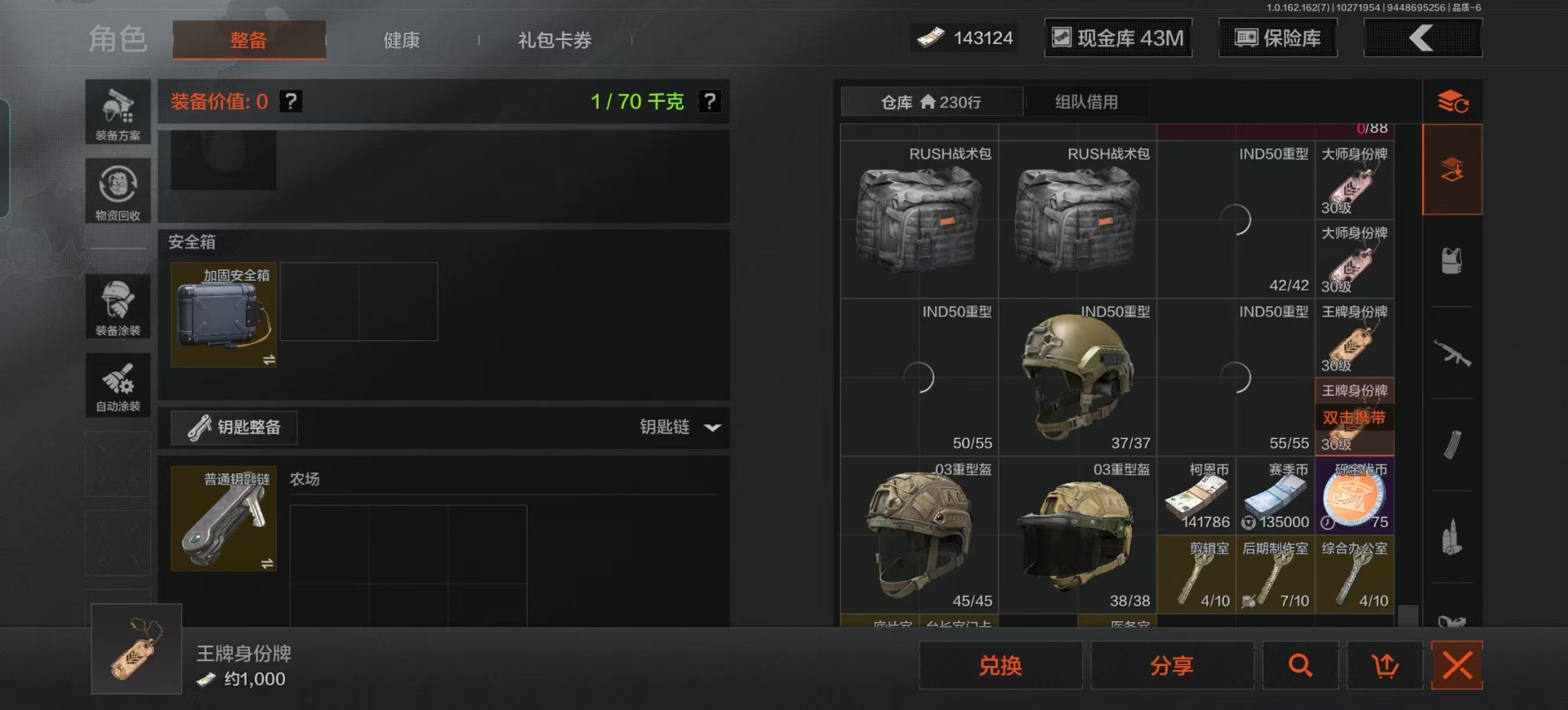 库存价值13.7 1近战武器 7金枪皮 可修改实名 【柯恩币数量】:1848【近战武器】:下弦月【金色枪皮】:告丧夜曲·AUG,旗帜·AEK,棱光裂变·QBU191,告丧夜曲·AR57,旧王圣谕·QBZ191,旧王圣谕·VSS,战术大师·AK102【紫色枪皮】:旗帜·SVDS,棱光裂变·ACE31,棱光裂变·AK74N,棱光裂变·AK102,棱光裂变·AKM,最后防线·AEK,禁止访问·UMP45,北国内卫·AN94,骑士之剑·SJ16,竞技·AUG,炎夏浪花·H416,快乐游戏·M110,典礼武备·M249,典礼武备·14,典礼武备·GROZA,猩红羽翼·VSS,无声暗月·AR57,竞技·M4A1,逆火·MDR,极恶·AUG,湖冰倒影·MP5,缟兵玄墨·MPX,07式林地迷彩·QBZ191,轰炸·AX50,娜迦·RPK16,涂绘猎人·AR57【角色装扮(紫)】:都市夜影套装