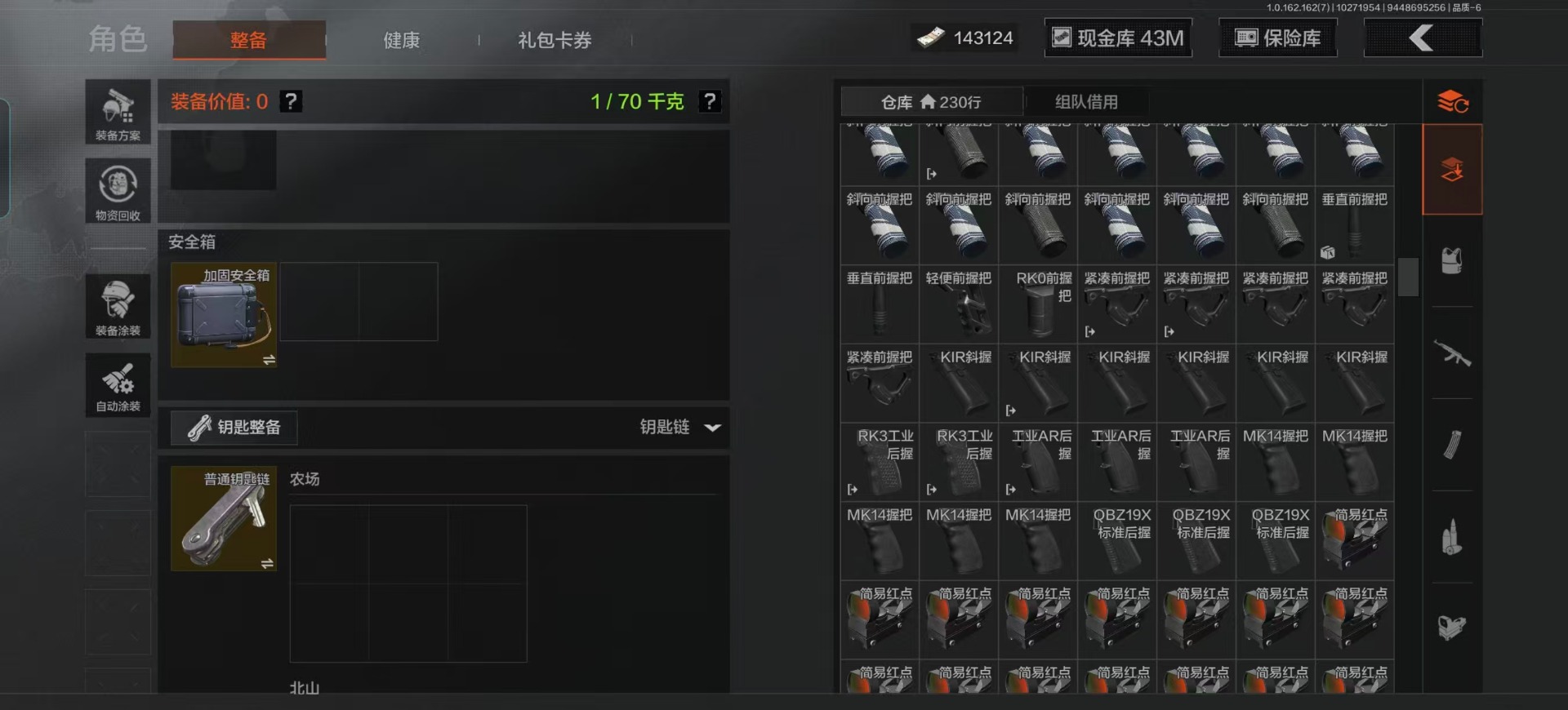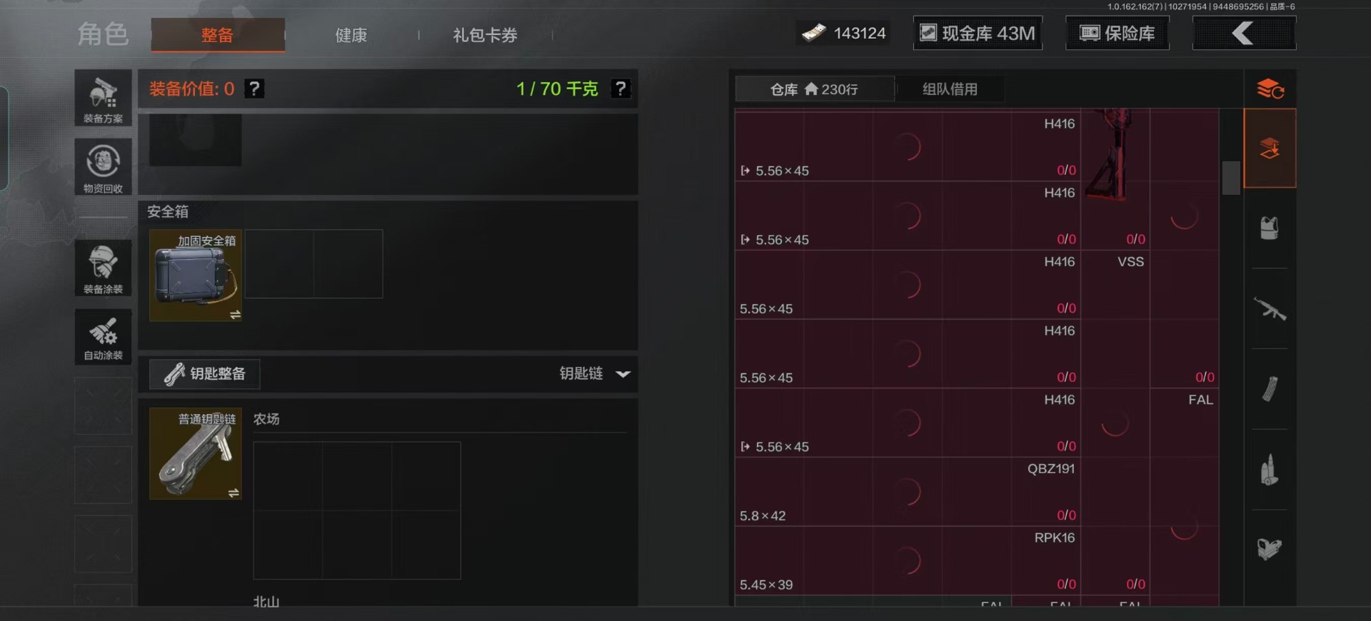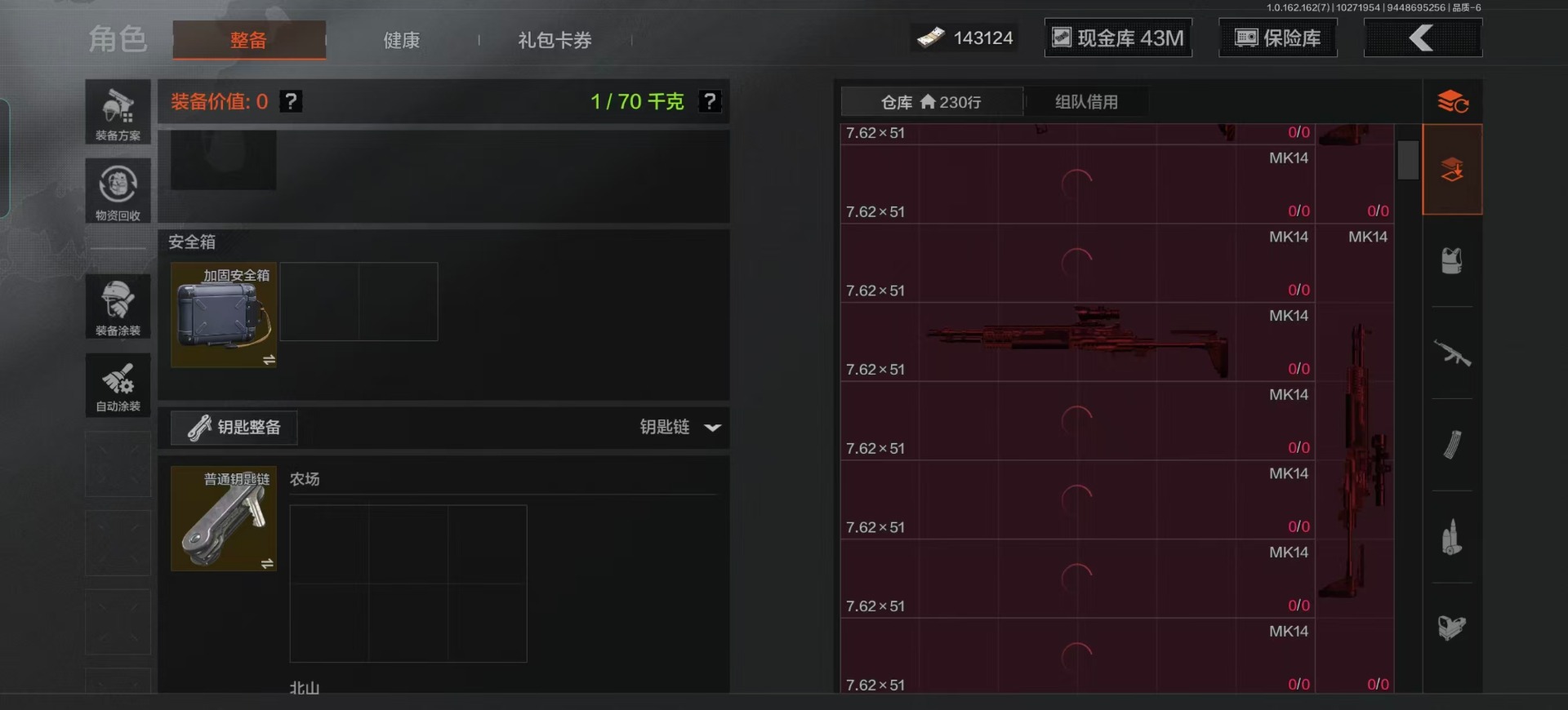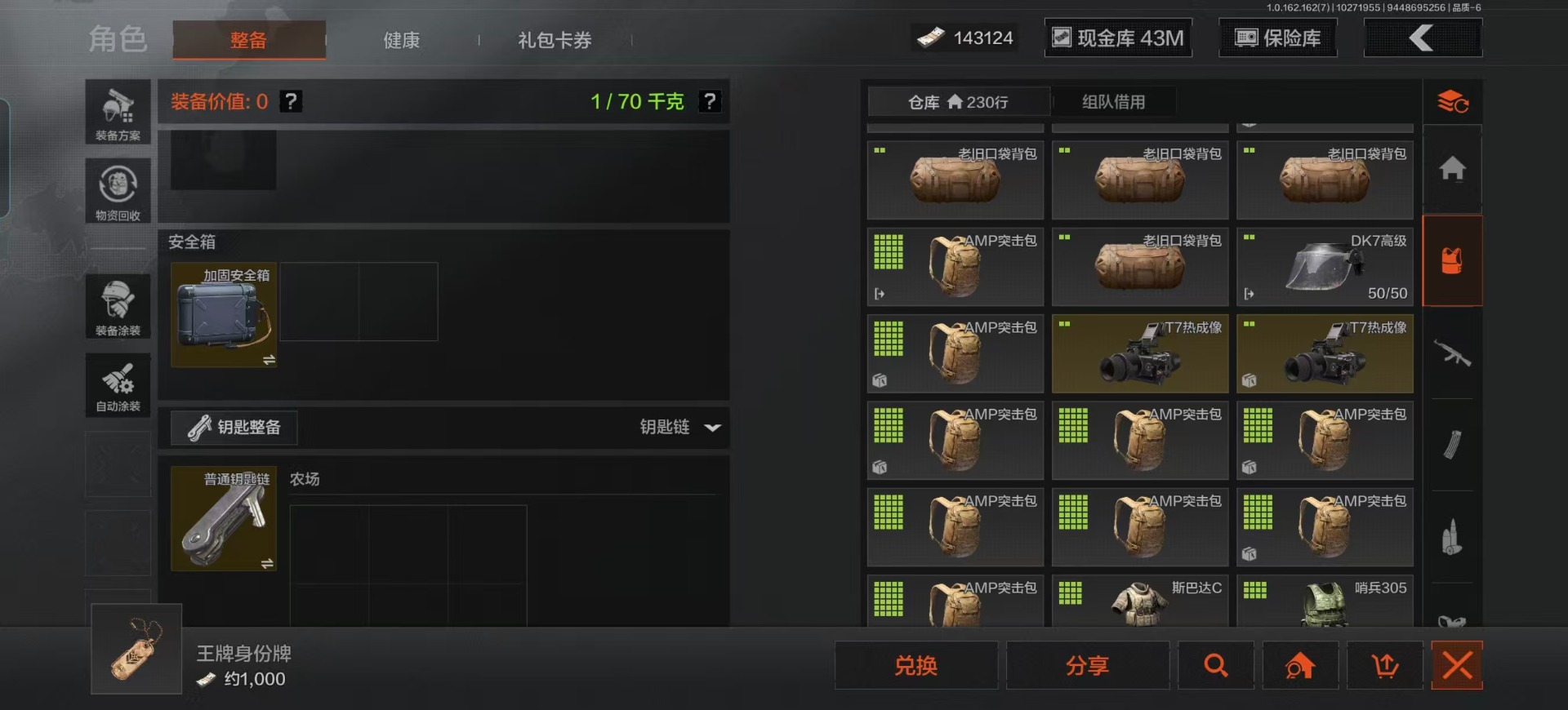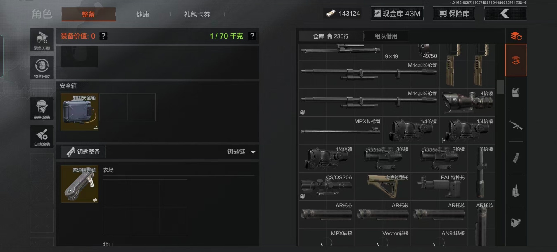 库存价值13.7 1近战武器 7金枪皮 可修改实名 【柯恩币数量】:1848【近战武器】:下弦月【金色枪皮】:告丧夜曲·AUG,旗帜·AEK,棱光裂变·QBU191,告丧夜曲·AR57,旧王圣谕·QBZ191,旧王圣谕·VSS,战术大师·AK102【紫色枪皮】:旗帜·SVDS,棱光裂变·ACE31,棱光裂变·AK74N,棱光裂变·AK102,棱光裂变·AKM,最后防线·AEK,禁止访问·UMP45,北国内卫·AN94,骑士之剑·SJ16,竞技·AUG,炎夏浪花·H416,快乐游戏·M110,典礼武备·M249,典礼武备·14,典礼武备·GROZA,猩红羽翼·VSS,无声暗月·AR57,竞技·M4A1,逆火·MDR,极恶·AUG,湖冰倒影·MP5,缟兵玄墨·MPX,07式林地迷彩·QBZ191,轰炸·AX50,娜迦·RPK16,涂绘猎人·AR57【角色装扮(紫)】:都市夜影套装