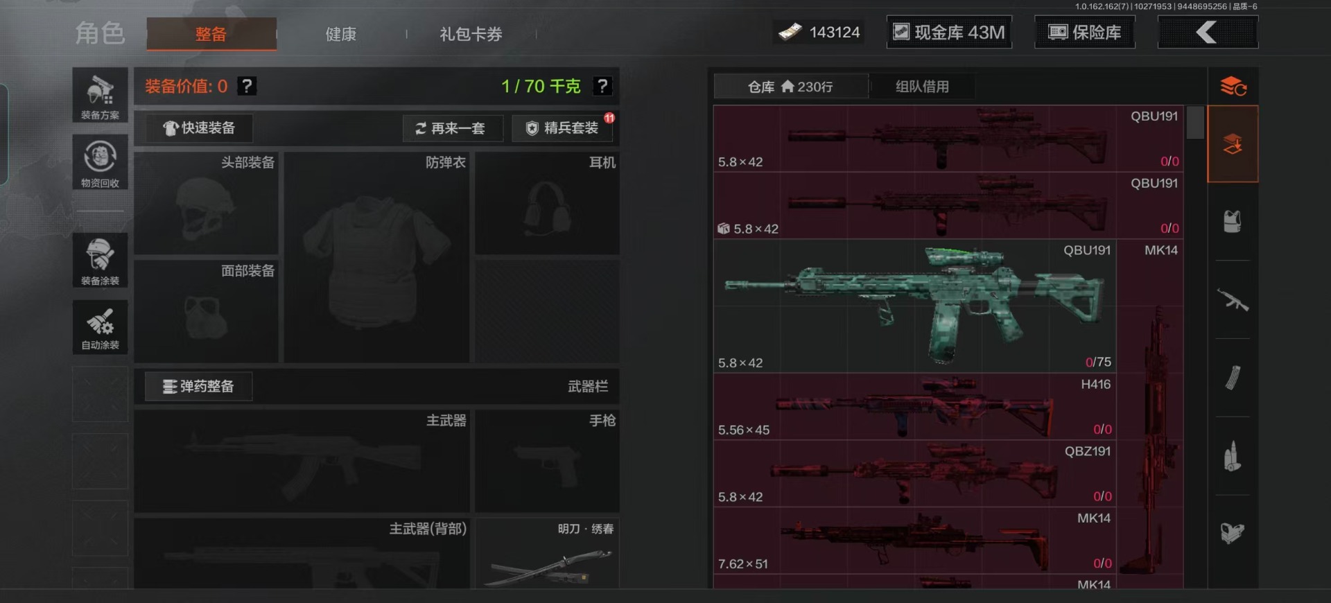 库存价值9.9 5近战武器 1金套装 1金枪皮 可修改实名 【柯恩币数量】:57345【角色装扮(金)】:火绒·塔莉娅【近战武器】:来战·开山刀,瀚星斩铁,工兵铲,涂鸦利刃,裁决手杖剑【金色枪皮】:竞技·FAL【紫色枪皮】:火绒·AK12,棱光裂变·AKM,无畏·USAS12,骑士之剑·SJ16,百锻寒芒·T03,百锻寒芒·T951,竞技·AUG,V·SKS,竞技·MDR,掌中盾·MP5,自喷网格·H416,来战·AK74N,德尔塔小队·M4A1,玄戈梨花·MPX,07式林地迷彩·QBZ191,全地形数码·M110【角色装扮(紫)】:都市夜影套装