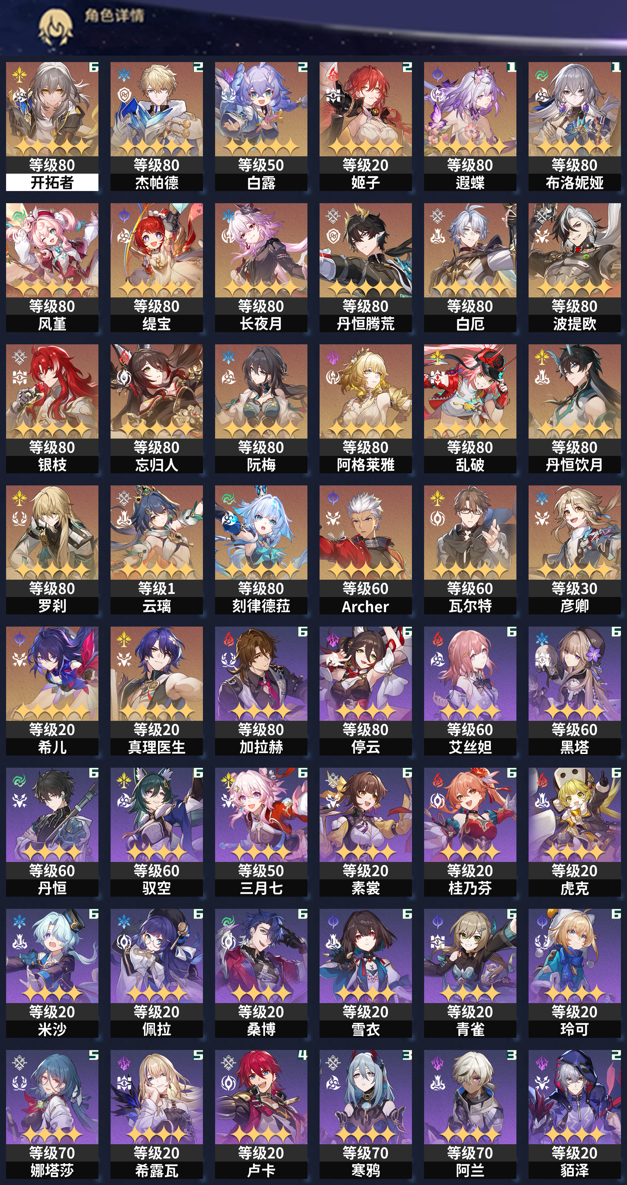 【崩坏·星穹铁道】【LYXQ6871】冒险等级:70,女主,五星数量:36,绑定情况:邮箱__五星角色:杰帕德 * 2命|白露 * 2命|姬子 * 2命|遐蝶 * 1命|布洛妮娅 * 1命|风堇|缇宝|长夜月|丹恒·腾荒|白厄|波提欧|银枝|忘归人|阮·梅|阿格莱雅|乱破|丹恒·饮月|罗刹|云璃|刻律德菈|Archer|瓦尔特|彦卿|希儿|真理医生__五星光锥:记一位星神的陨落 * 5精|比阳光更明亮的|驶向第二次生命|忍法帖·缭乱破魔|金血铭刻的时代|制胜的瞬间|让告别,更美一些|但战斗还未结束|星海巡航|以世界之名|银河铁道之夜,【邮箱未实名】