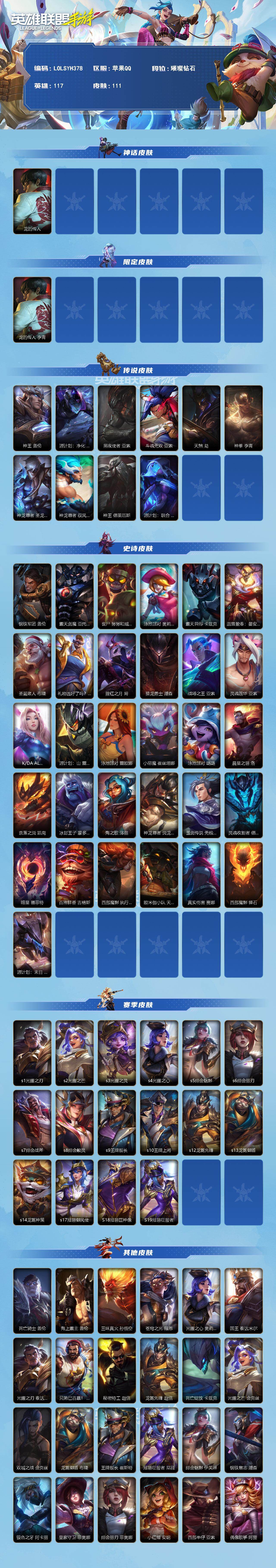 商品描述:【LOLSYH378】117英雄/111皮肤/璀璨钻石/龙的传人 李青/神王 盖伦/源计划:净化 薇恩/黑夜使者 亚索/斗魂无双 亚索/天煞 劫/神拳 李青/神龙尊者 圣龙 李青/神龙尊者 驭风啸龙 易/神王 德莱厄斯/源计划:联合 艾希/钢铁军团 盖伦/霸天剑魔 亚托克斯/丧尸 努努和威朗普/泳池派对 奥莉安娜/霸天异形 卡兹克/蕊雪盈春:晏安 赫卡里姆/圣诞老人 布隆/礼物选好了吗? 布隆/腥红之月 烬/猎龙勇士 潘森/战场之王 亚索/灵魂莲华 亚索/K/DA ALL OUT 阿狸/源计划:山 蕾欧娜/泳池派对 蕾欧娜/小恶魔 崔丝塔娜/泳池派对 璐璐/晨星之翎 洛/奈落之炎 凯南/冰封