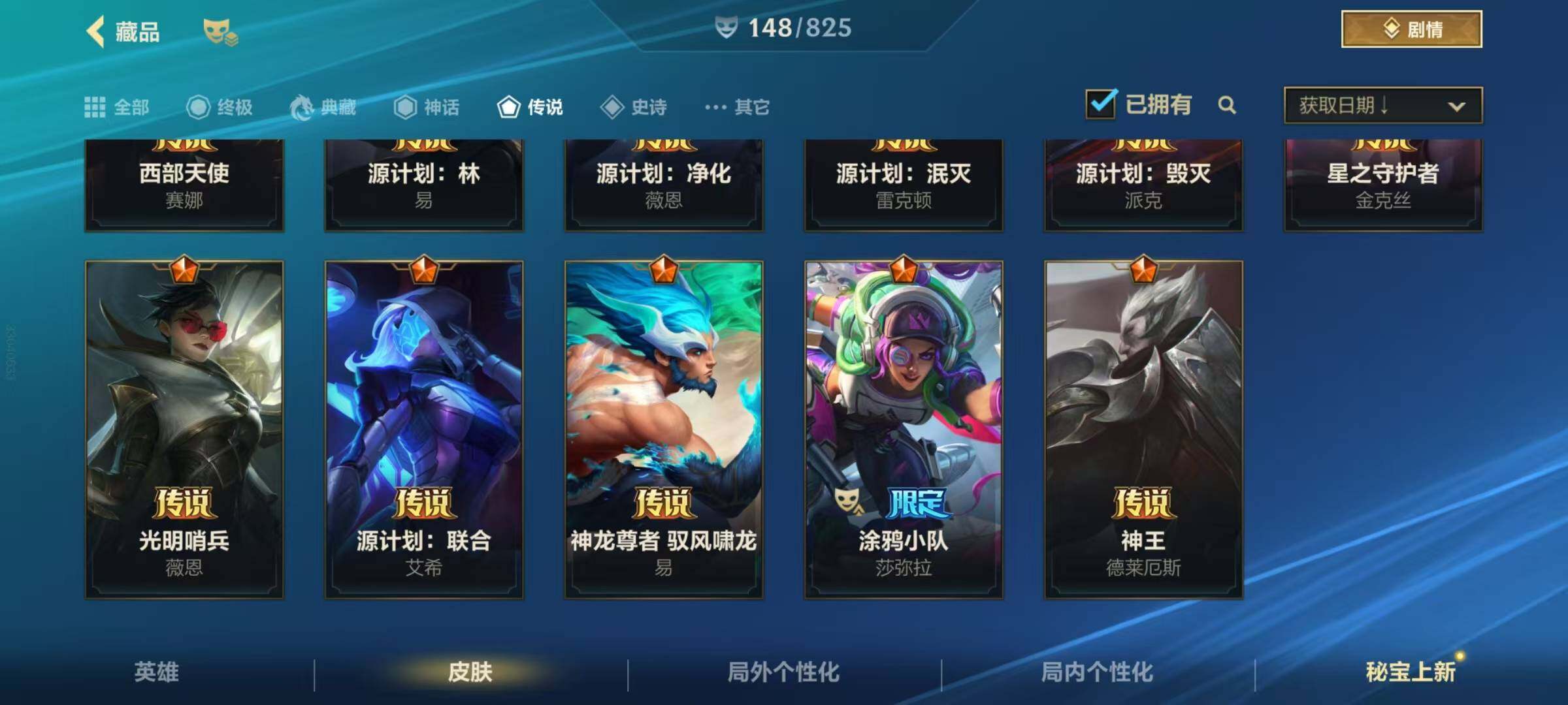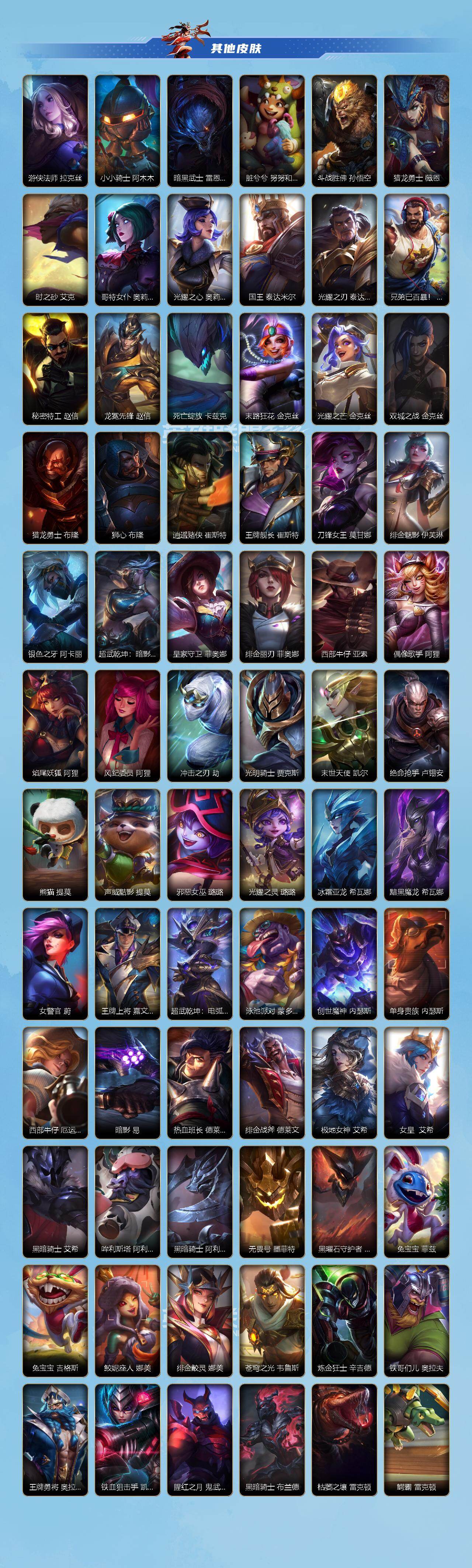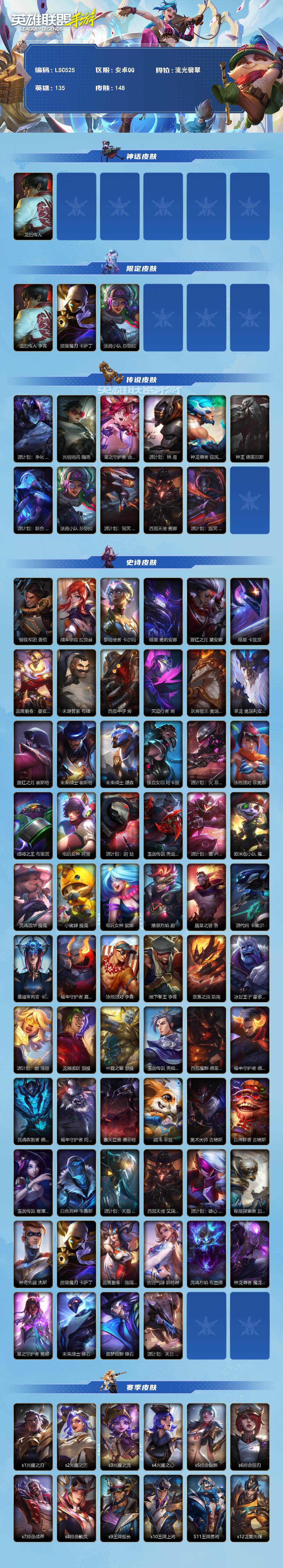商品描述:【LSC525】135英雄/148皮肤/2神话/11传说/63史诗/流光翡翠/龙的传人 李青/掠星魔刃 卡萨丁/涂鸦小队 莎弥拉/源计划:净化 薇恩/光明哨兵 薇恩/星之守护者 金克丝/源计划:林 易/神龙尊者 驭风啸龙 易/神王 德莱厄斯/源计划:联合 艾希/源计划:泯灭 雷克顿/西部天使 赛娜/源计划:毁灭 派克/钢铁军团 盖伦/战斗学院 拉克丝/黎明使者 卡尔玛/暗星 奥莉安娜/腥红之月 黛安娜/暗星 卡兹克/蕊雪盈春:晏安 赫卡里姆/末路管家 布隆/西部牛仔 烬/灭迹行者 烬/灰烬领主 奥瑞利安·索尔/圣龙 奥瑞利安·索尔/腥红之月 崔斯特/未来战士 崔斯特/未来战士 潘森/铁血女忍