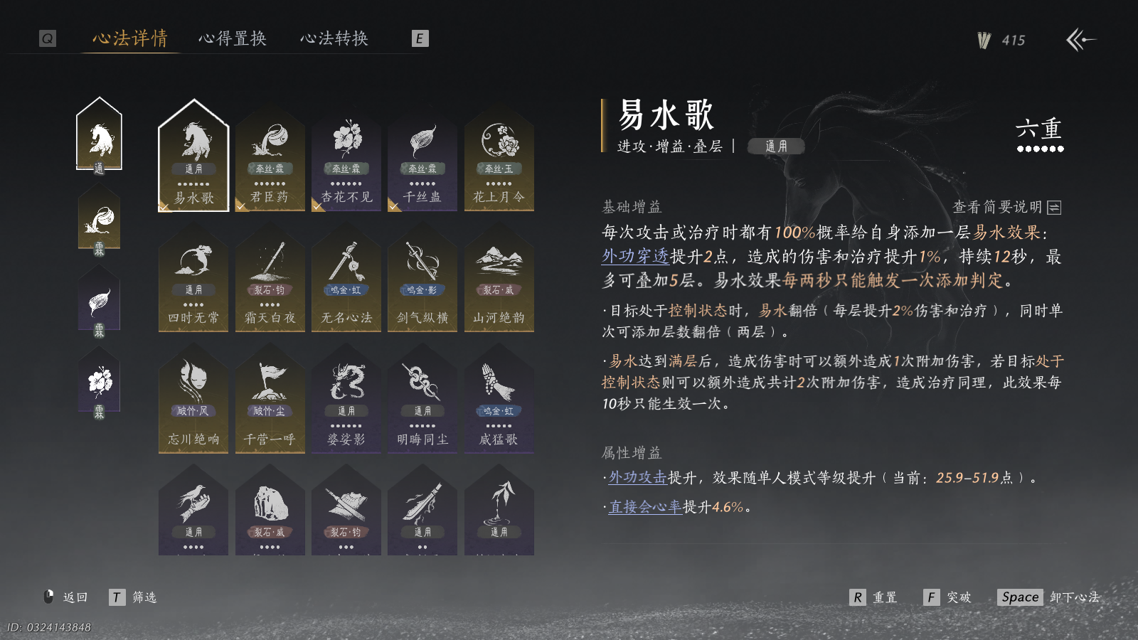【澄心不染金阙翼回配饰,可封装5金伞,幽灵速坐骑,如碎霜天,青丘千岁,月中天阙,瑞鹤仙,将星入命,弄清影,霓裳徊天武学,鳞跃天倾黄龙断戟奇术,4套258时装,心法6666】 风华值73492 武林造诣(鹅)35029 已用八音窍数量12 未用八音窍数量0 等级100 角色性别【文本】女 【绝境】 【无换绑CD】 【未绑定或可换绑】 【未注册】 【不支持人脸包赔】 【女】 【无】 【ios】 【是】 【是】 【否】 稀有套装5 稀有发型1 稀有武器外观1 稀有武学奇术2 稀有坐骑1 套装4 稀有套装:将星入命,瑞鹤仙,如碎霜天,月中天阙,青丘千岁; 稀有发型:弄清影; 稀有武器外观:藏音·北溟有鱼(五金); 稀有武学奇术:黄龙断戟,鳞跃天倾; 稀有坐骑:幽灵速; 套装:青草原,花月天真,夜郎幽问,金滟玉团;