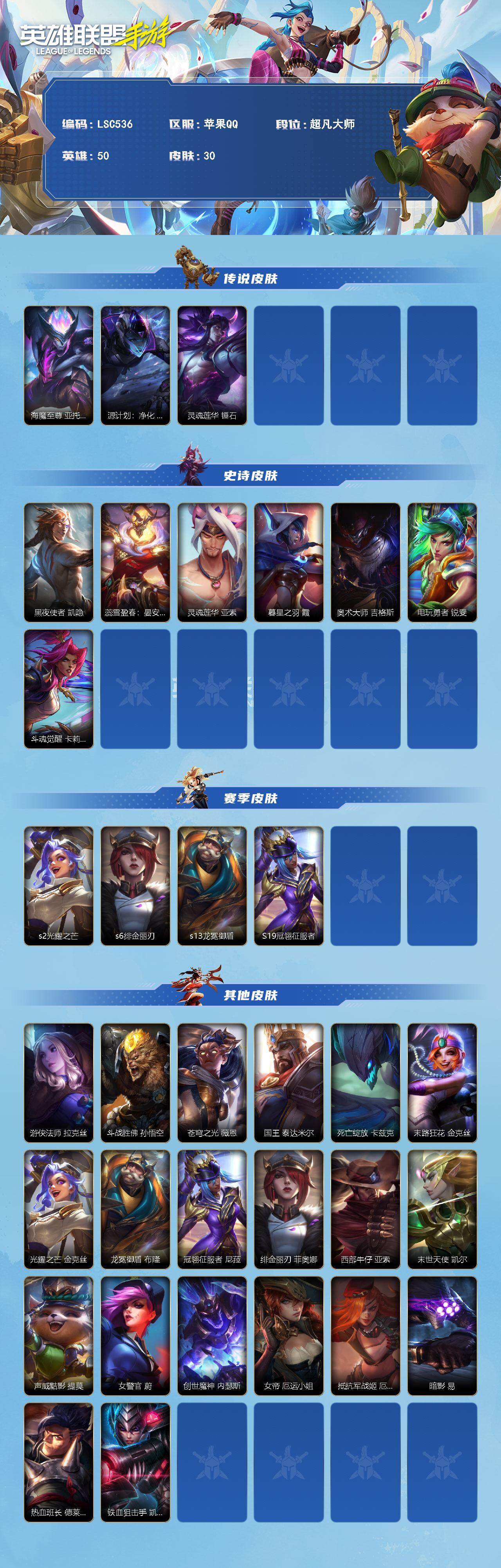 商品描述:【LSC536】50英雄/30皮肤/3传说/7史诗/超凡大师/海魔至尊 亚托克斯/源计划:净化 薇恩/灵魂莲华 锤石/黑夜使者 凯隐/蕊雪盈春:晏安 赫卡里姆/灵魂莲华 亚索/暮星之羽 霞/奥术大师 吉格斯/电玩勇者 锐雯/斗魂觉醒 卡莉丝塔/s2光耀之芒/s6绯金丽刃/s13龙冕御盾/S19冠翎征服者/游侠法师 拉克丝/斗战胜佛 孙悟空/苍穹之光 薇恩/国王 泰达米尔/死亡绽放 卡兹克/末路狂花 金克丝/光耀之芒 金克丝/龙冕御盾 布隆/冠翎征服者 尼菈/绯金丽刃 菲奥娜/西部牛仔 亚索/末世天使 凯尔/声威黠影 提莫/女警官 蔚/创世魔神 内瑟斯/女帝 厄运小姐/抵抗军战姬 厄运小姐/暗