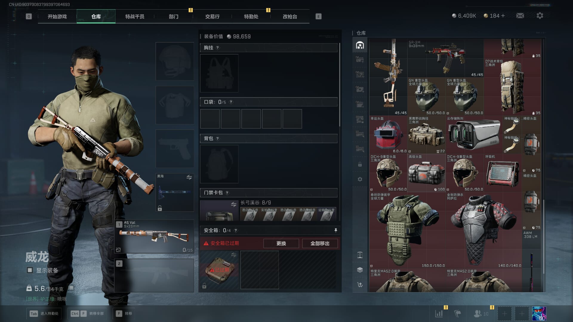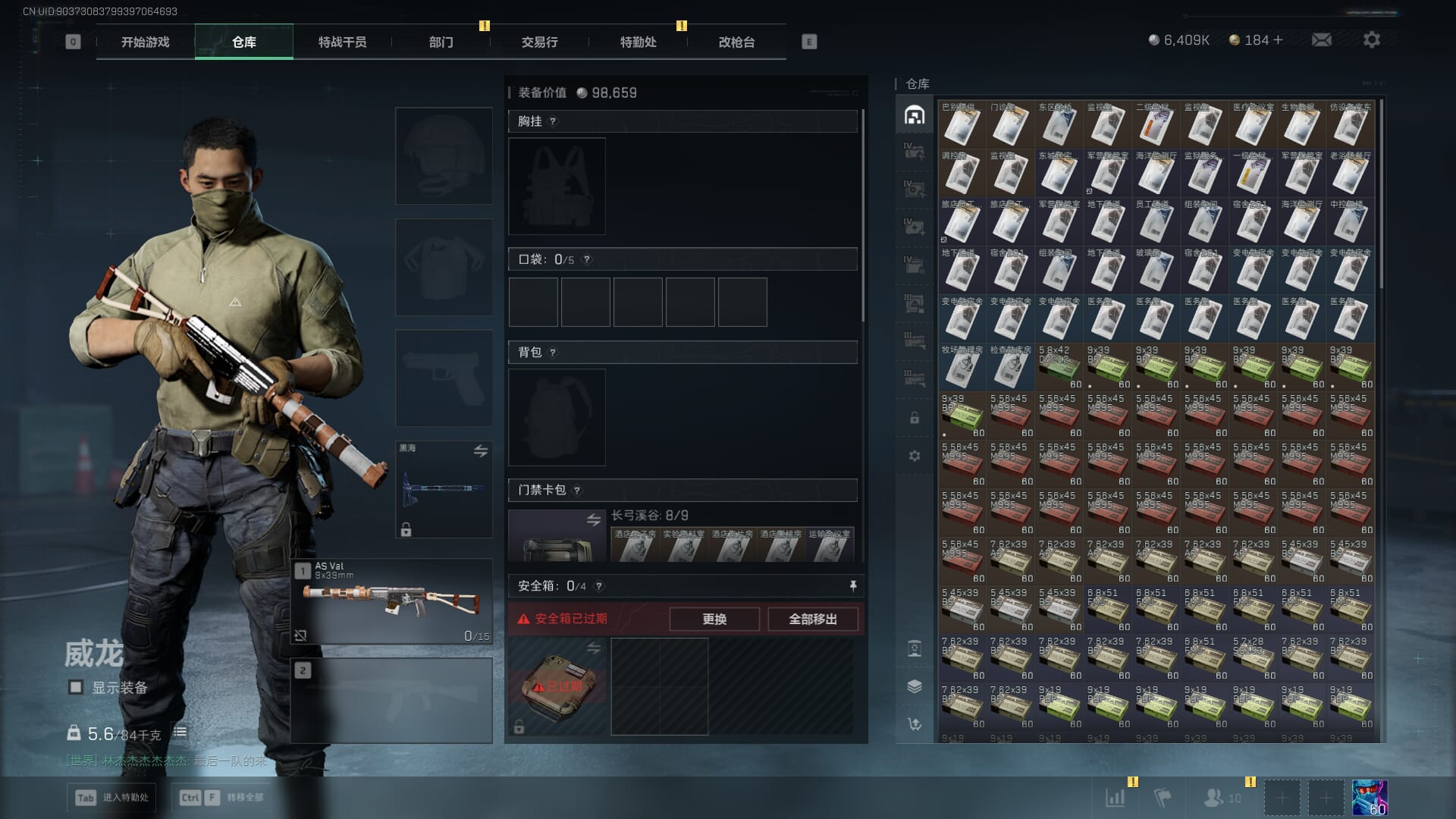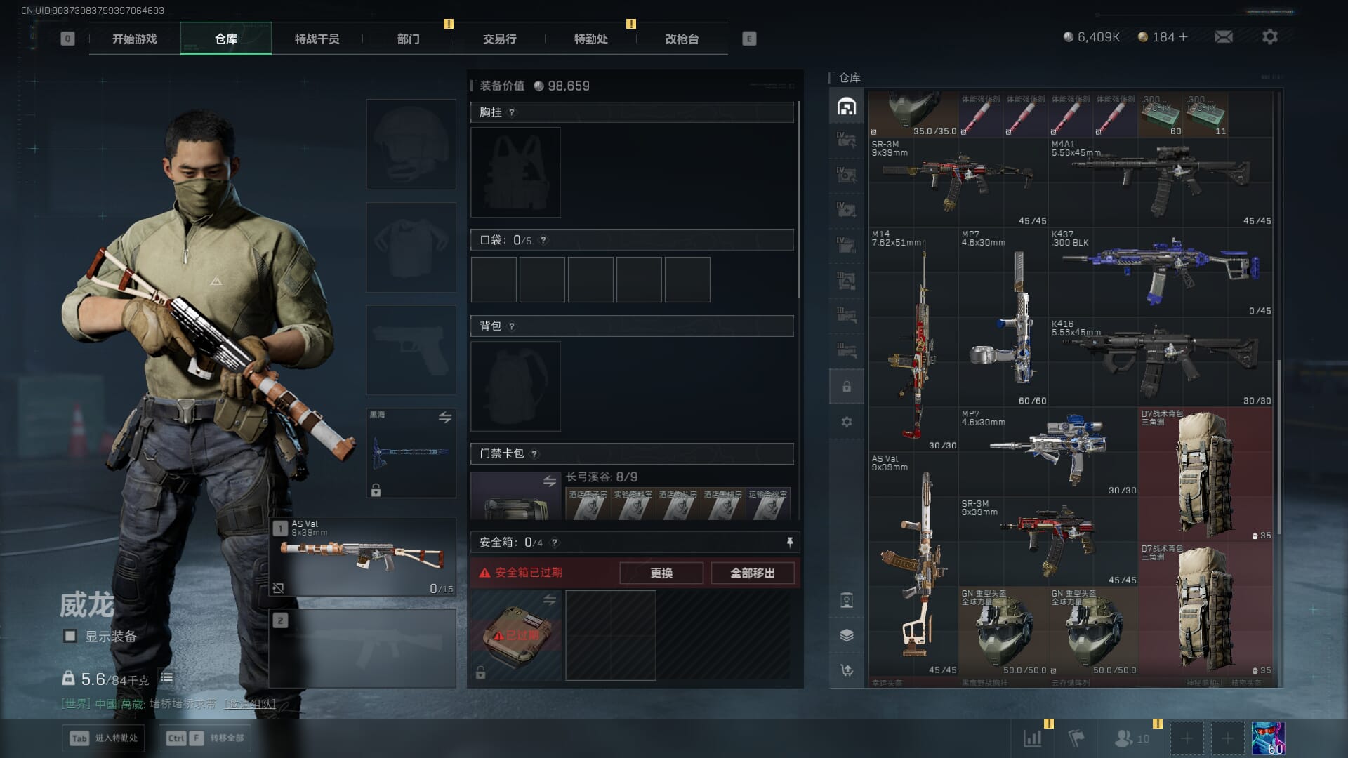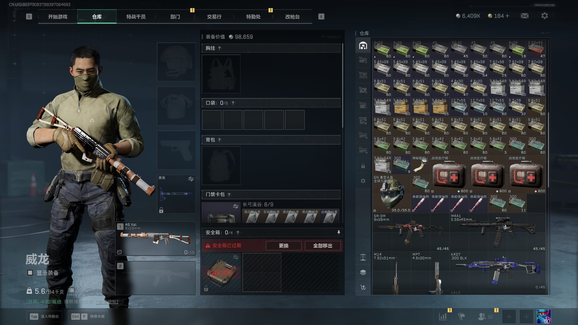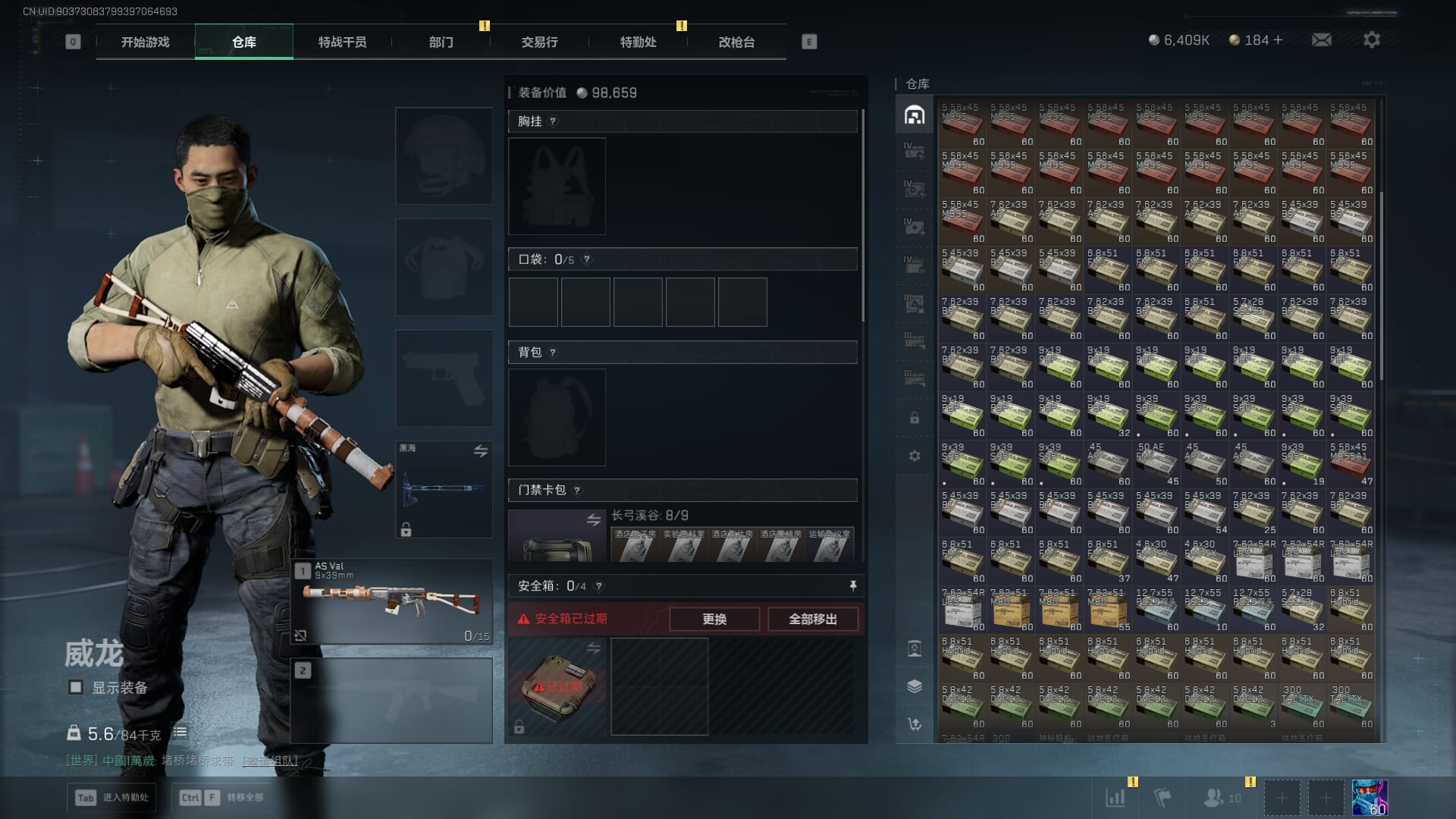 总资产:62.2M,哈夫币:84W,武器皮肤:5,黑鹰_,战场60级:列兵,【安全箱】基础安全箱;【特勤处等级】仓库LV.5,靶场LV.4,训练中心LV.4;【干员皮肤】骇爪维什戴尔,红狼电锯惊魂;【近战武器】近战武器-黑鹰;【步枪皮肤】M4A1突击步枪-阿米娅,SCAR-H战斗步枪-启航,KC17突击步枪-电锯惊魂;【狙击步枪皮肤】R93狙击步枪-维什戴尔;