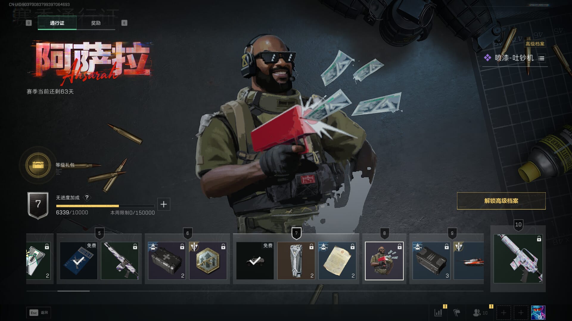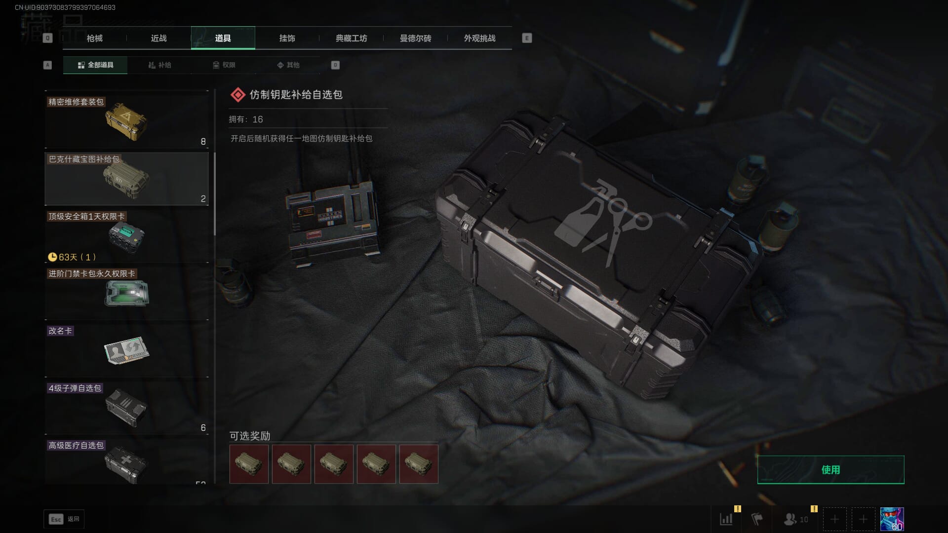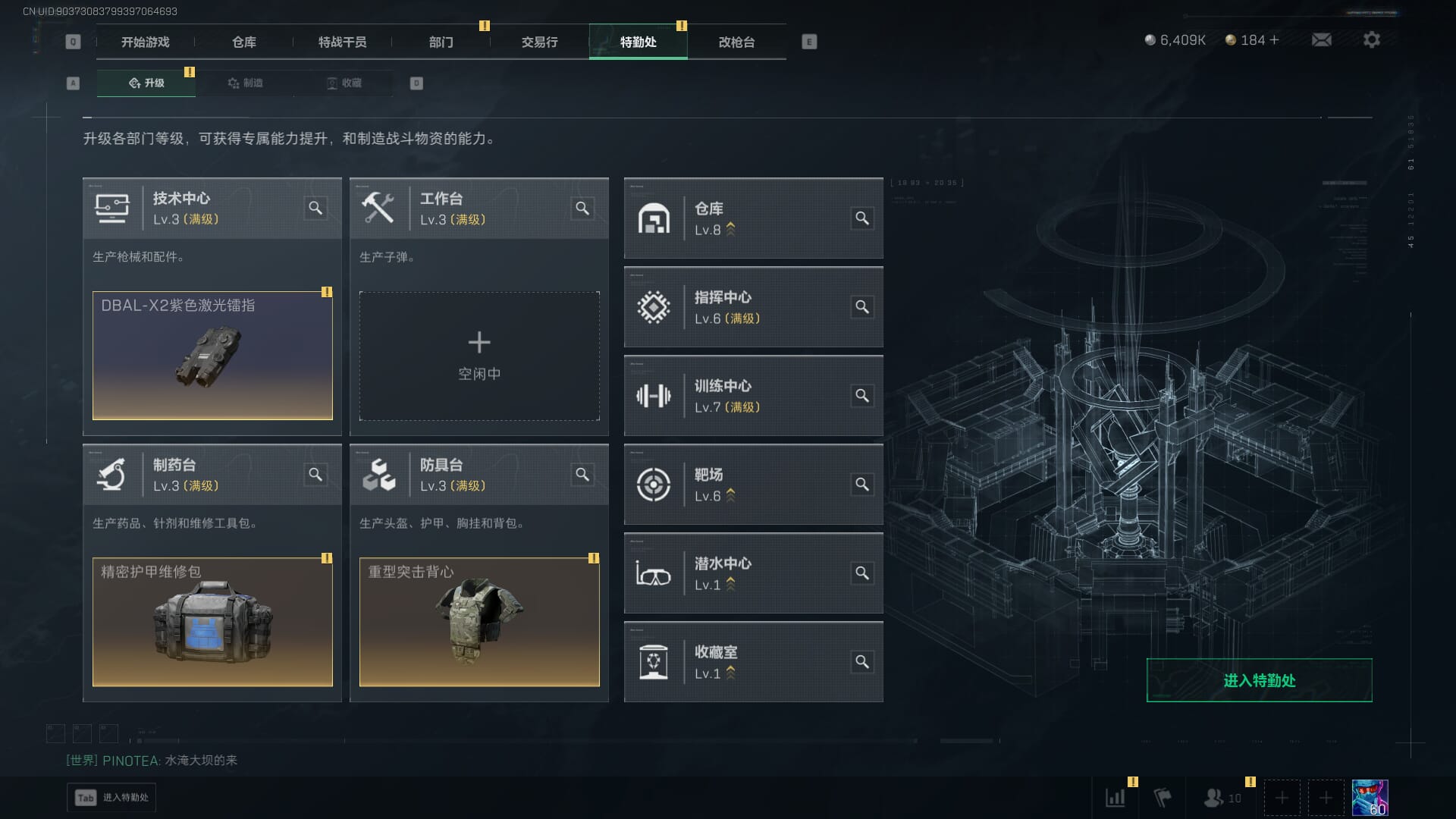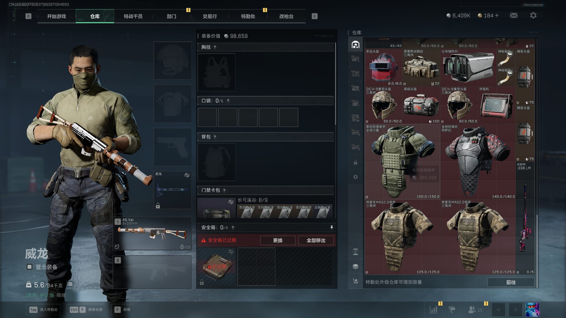 总资产:62.2M,哈夫币:84W,武器皮肤:5,黑鹰_,战场60级:列兵,【安全箱】基础安全箱;【特勤处等级】仓库LV.5,靶场LV.4,训练中心LV.4;【干员皮肤】骇爪维什戴尔,红狼电锯惊魂;【近战武器】近战武器-黑鹰;【步枪皮肤】M4A1突击步枪-阿米娅,SCAR-H战斗步枪-启航,KC17突击步枪-电锯惊魂;【狙击步枪皮肤】R93狙击步枪-维什戴尔;