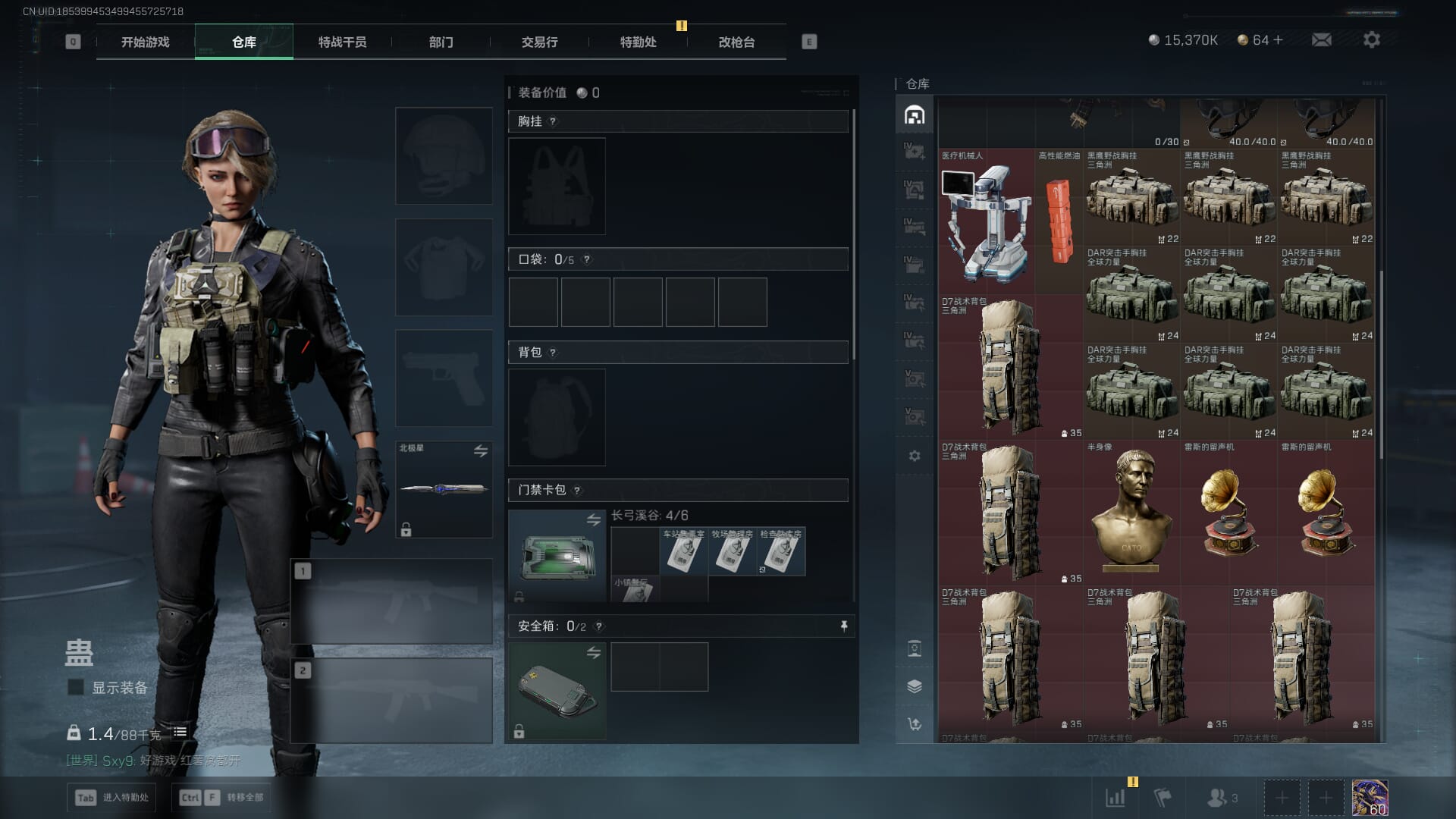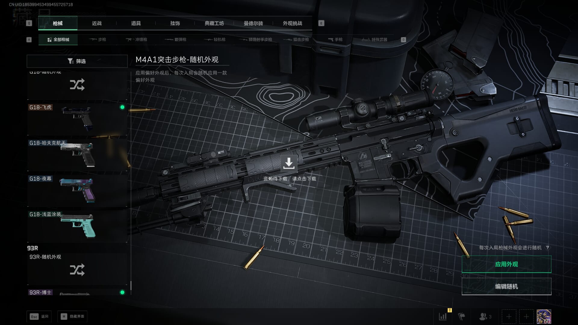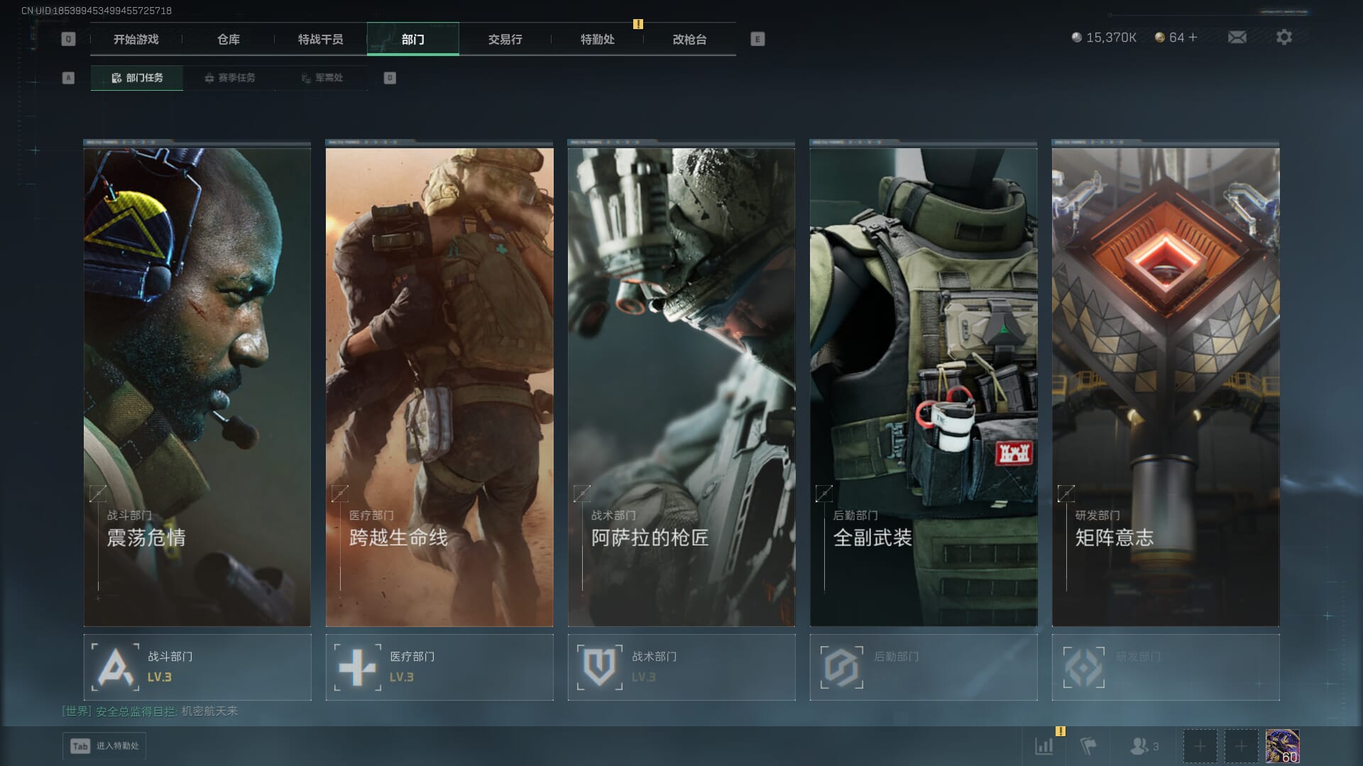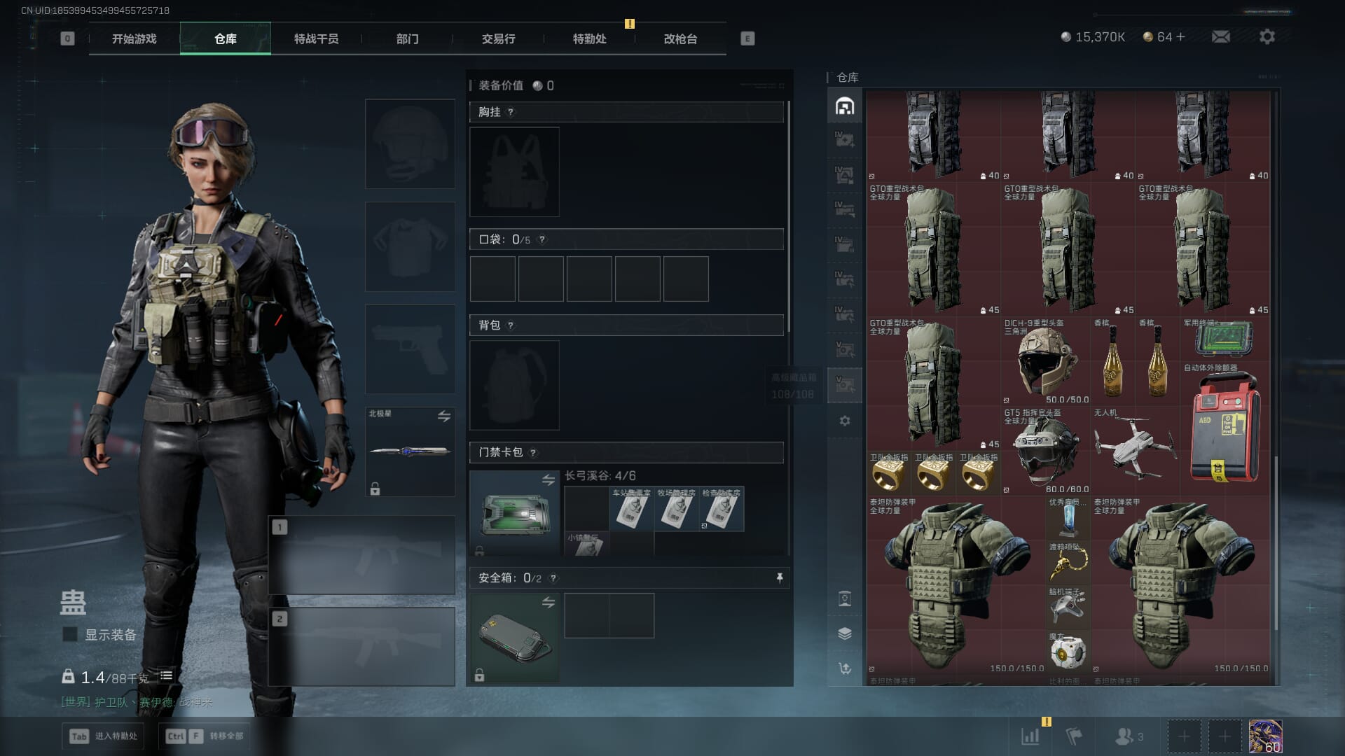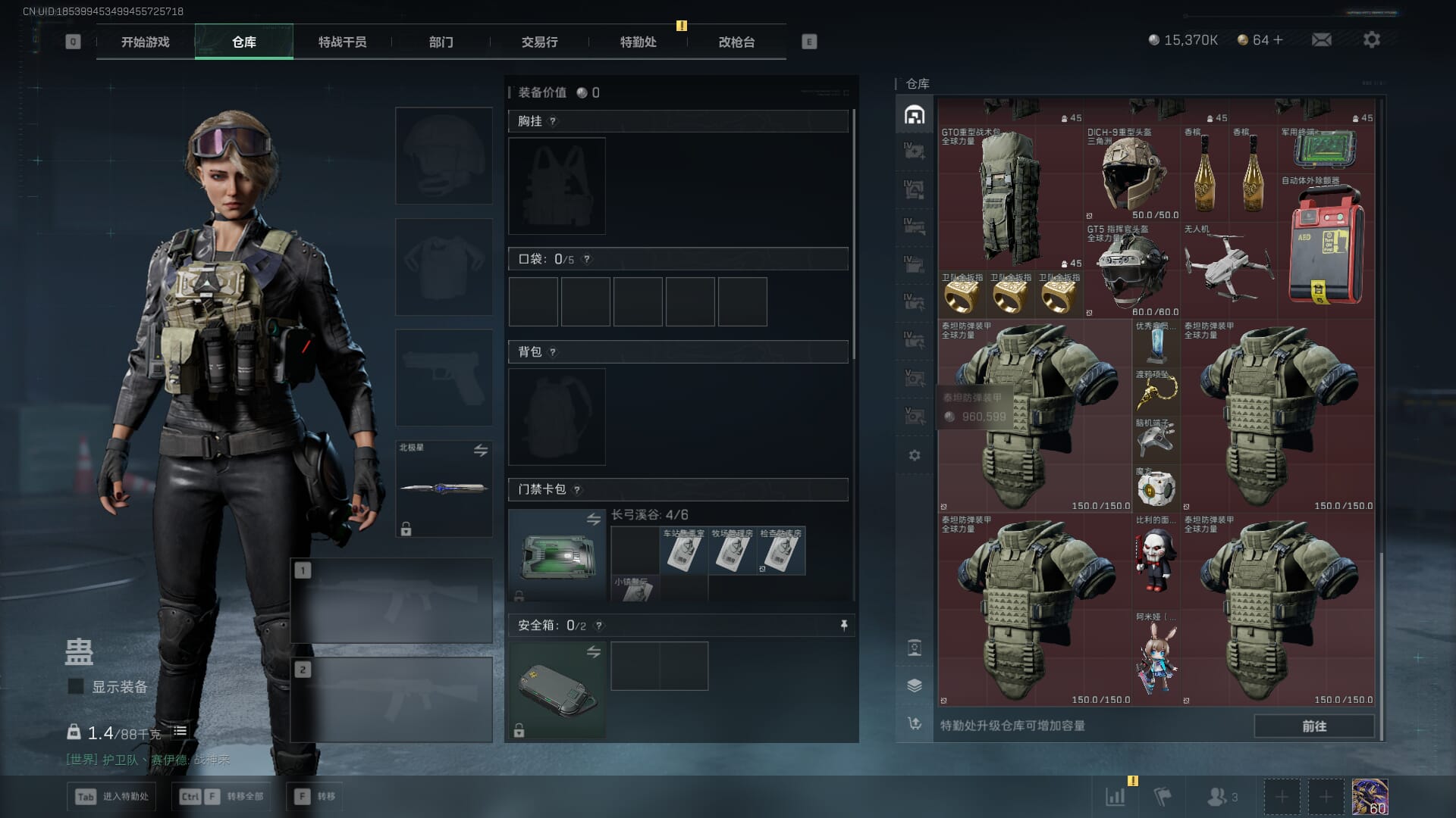 总资产:62.2M,哈夫币:84W,武器皮肤:5,黑鹰_,战场60级:列兵,【安全箱】基础安全箱;【特勤处等级】仓库LV.5,靶场LV.4,训练中心LV.4;【干员皮肤】骇爪维什戴尔,红狼电锯惊魂;【近战武器】近战武器-黑鹰;【步枪皮肤】M4A1突击步枪-阿米娅,SCAR-H战斗步枪-启航,KC17突击步枪-电锯惊魂;【狙击步枪皮肤】R93狙击步枪-维什戴尔;