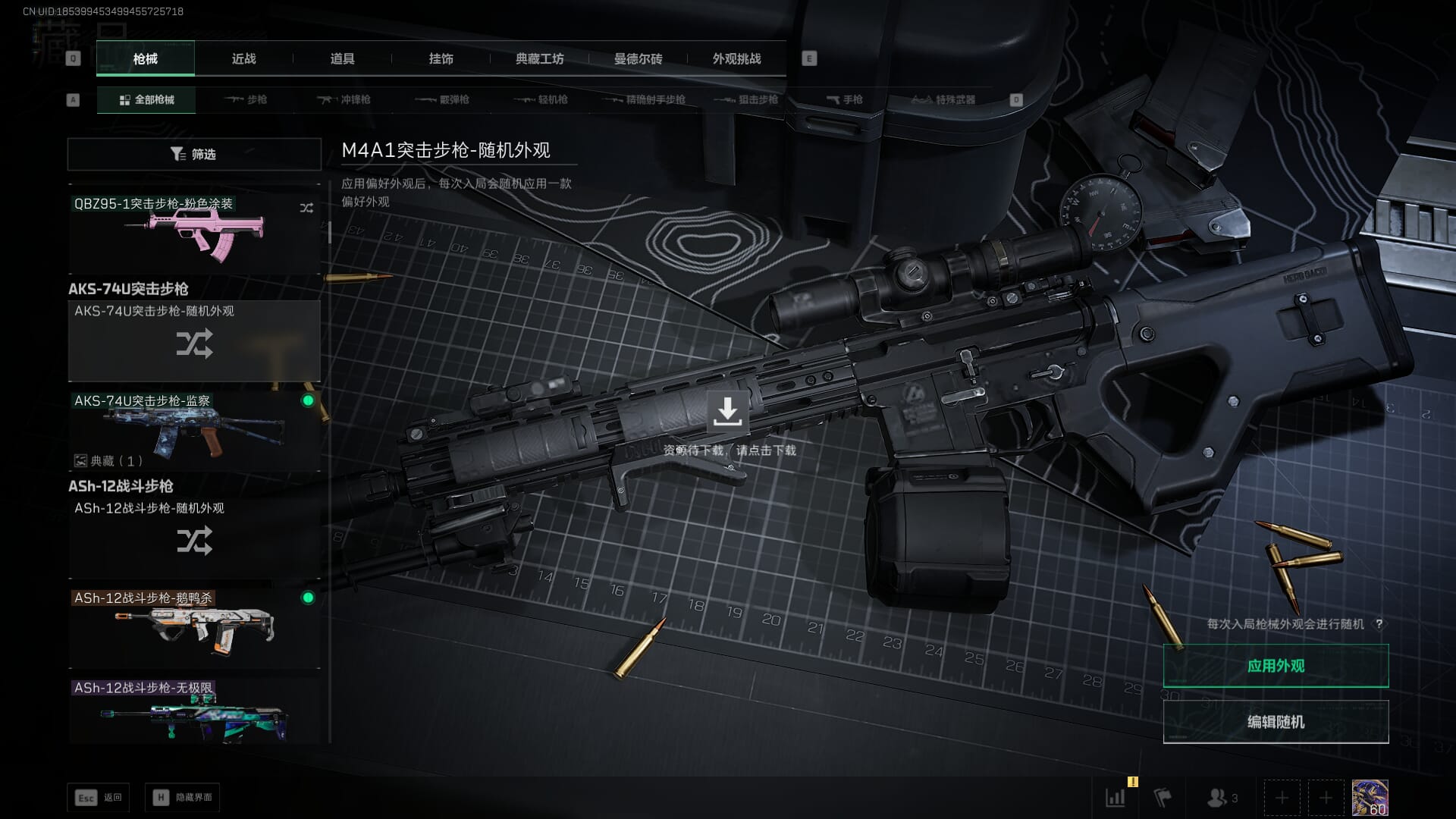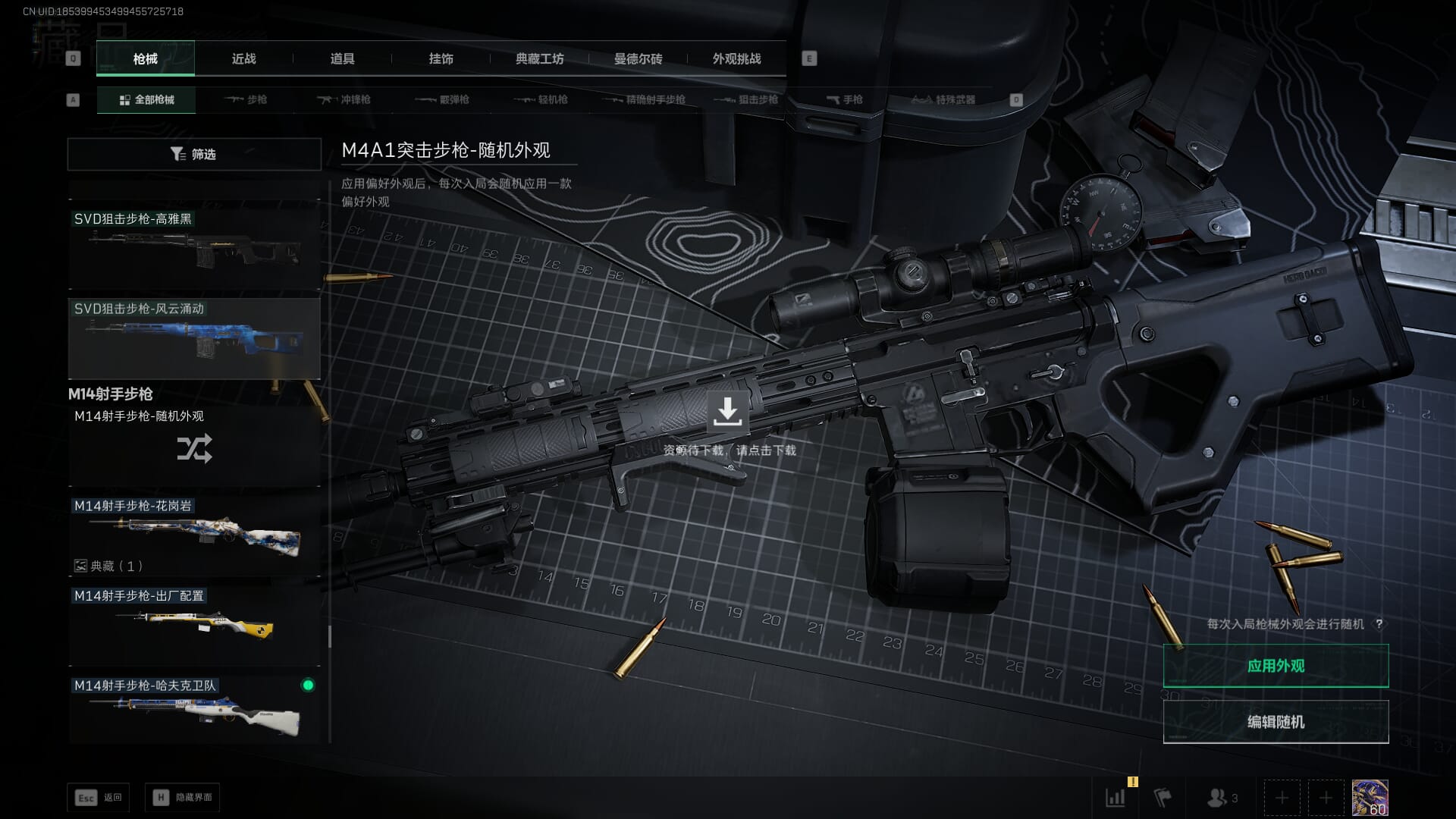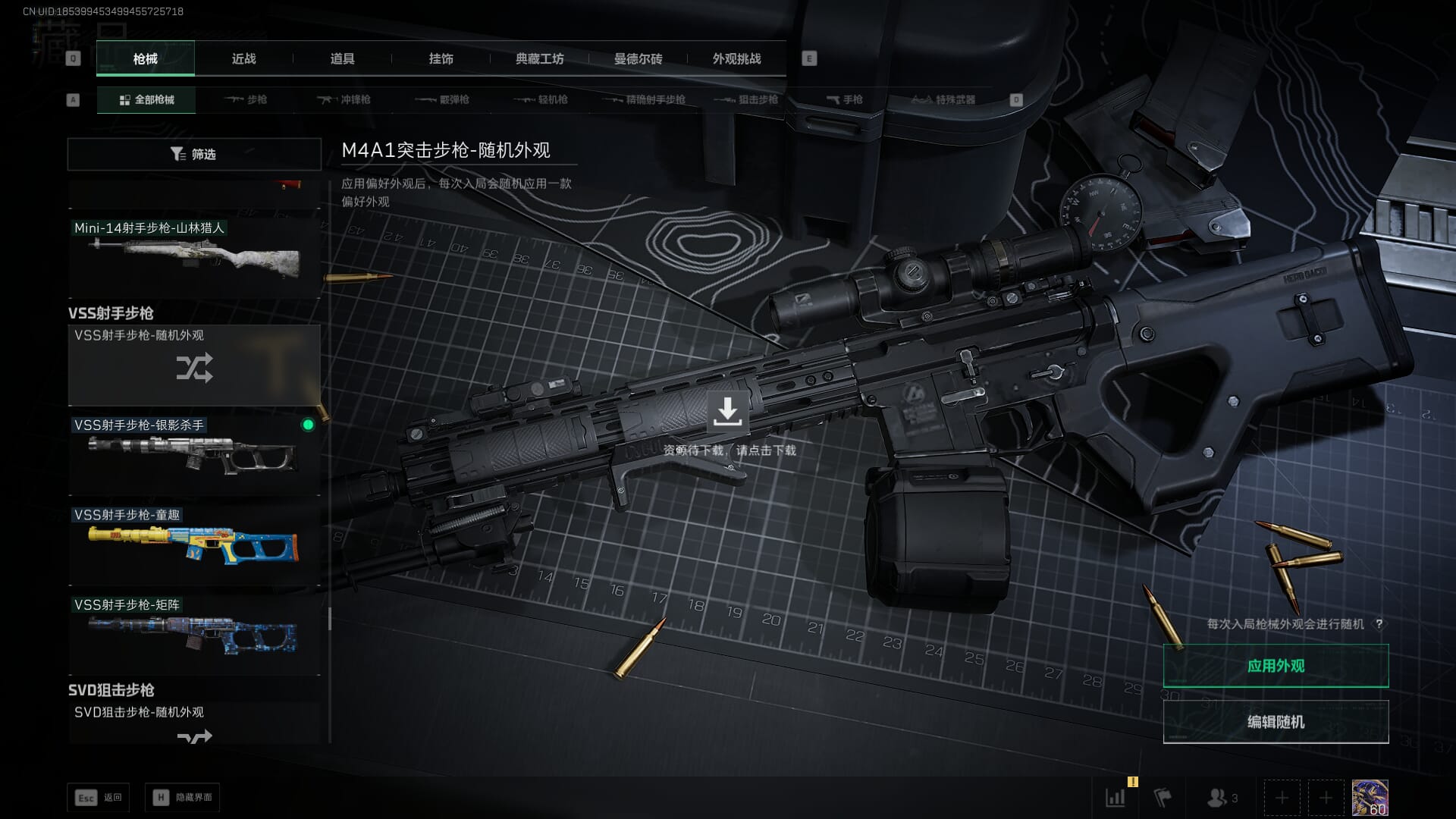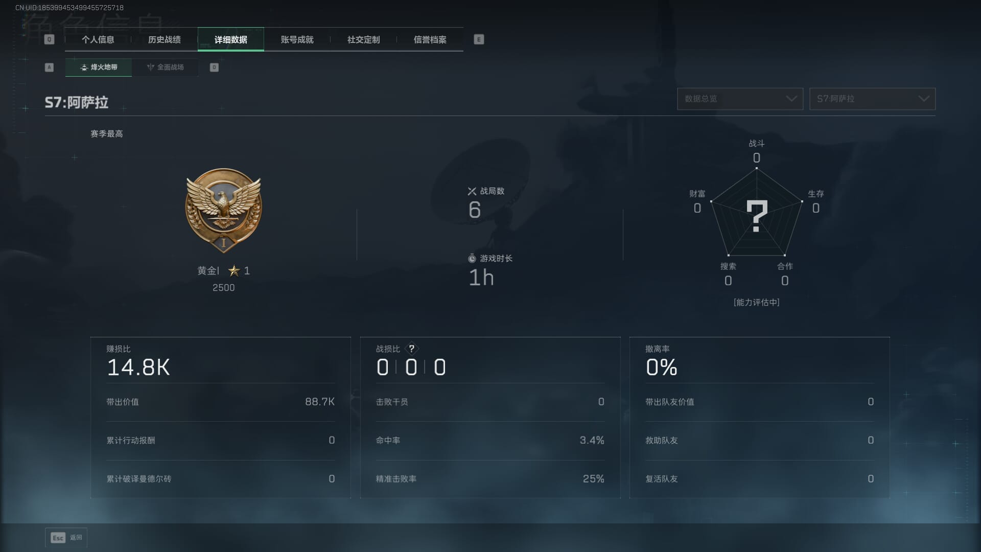 总资产:62.2M,哈夫币:84W,武器皮肤:5,黑鹰_,战场60级:列兵,【安全箱】基础安全箱;【特勤处等级】仓库LV.5,靶场LV.4,训练中心LV.4;【干员皮肤】骇爪维什戴尔,红狼电锯惊魂;【近战武器】近战武器-黑鹰;【步枪皮肤】M4A1突击步枪-阿米娅,SCAR-H战斗步枪-启航,KC17突击步枪-电锯惊魂;【狙击步枪皮肤】R93狙击步枪-维什戴尔;