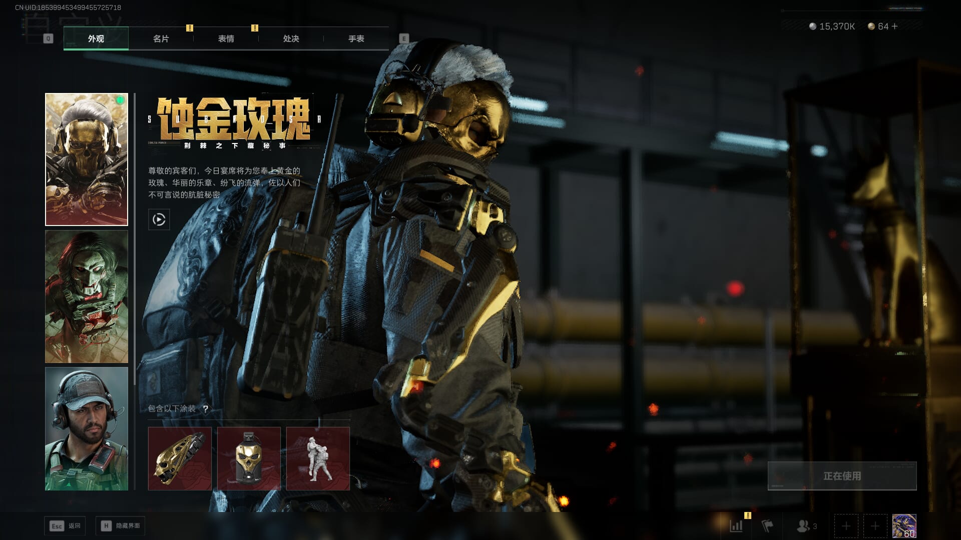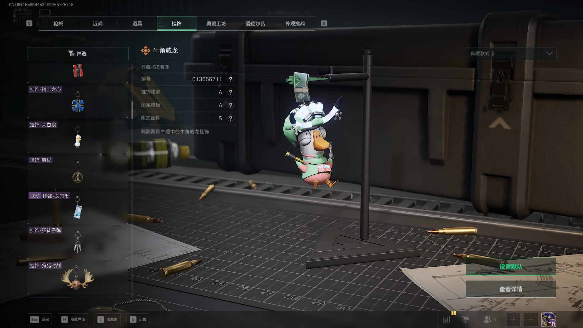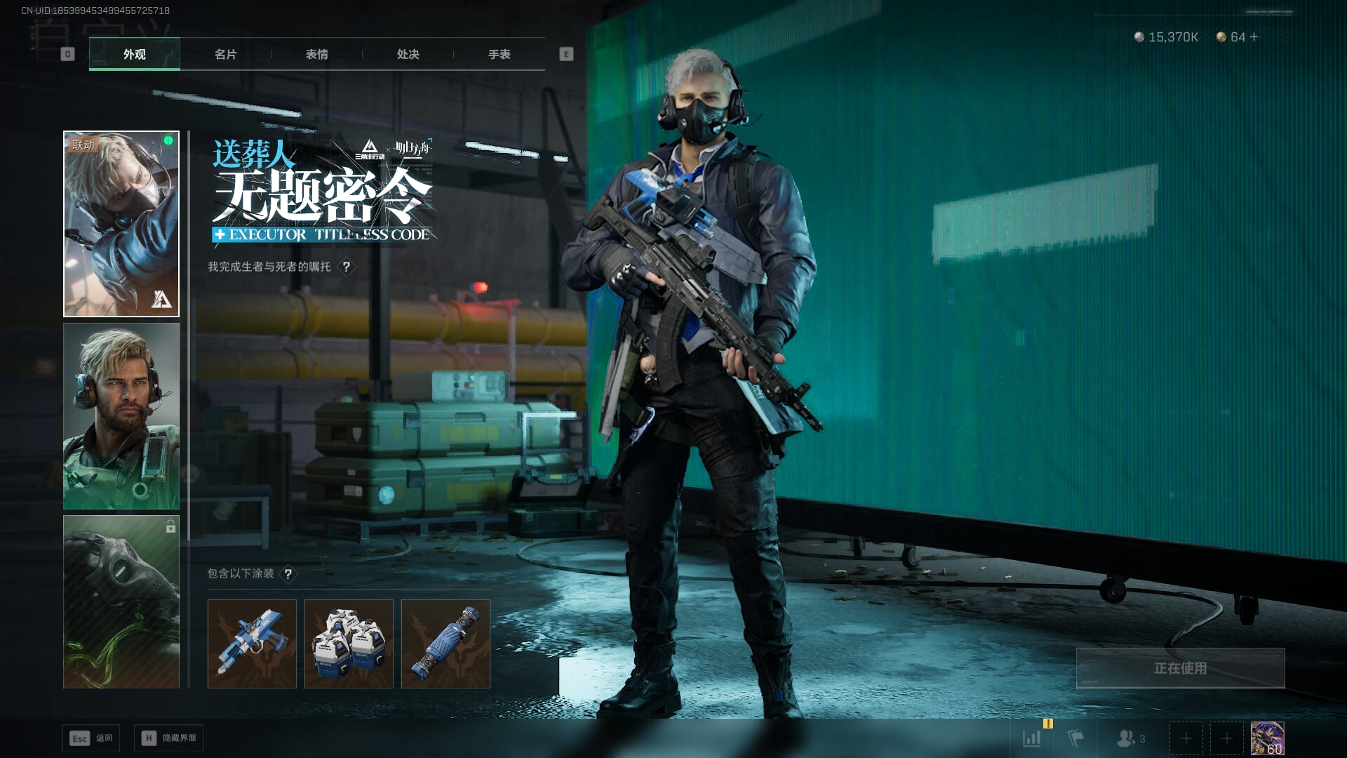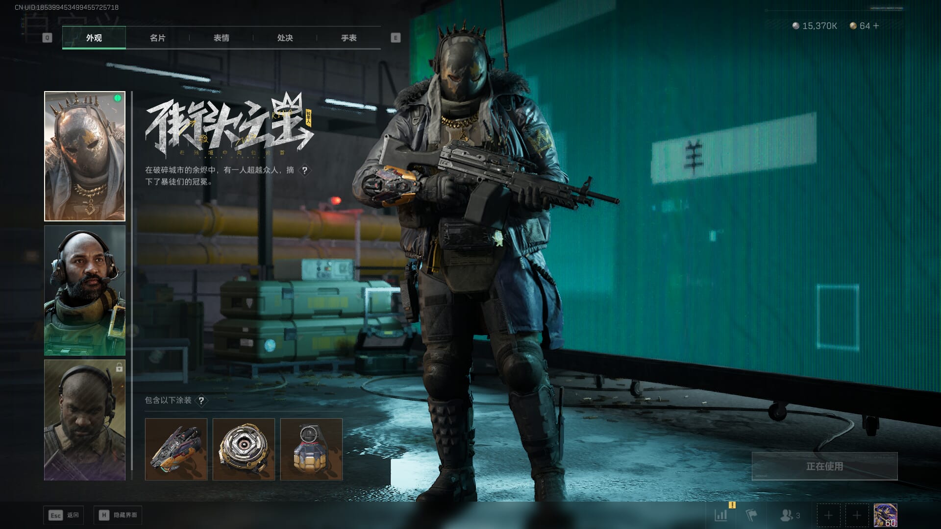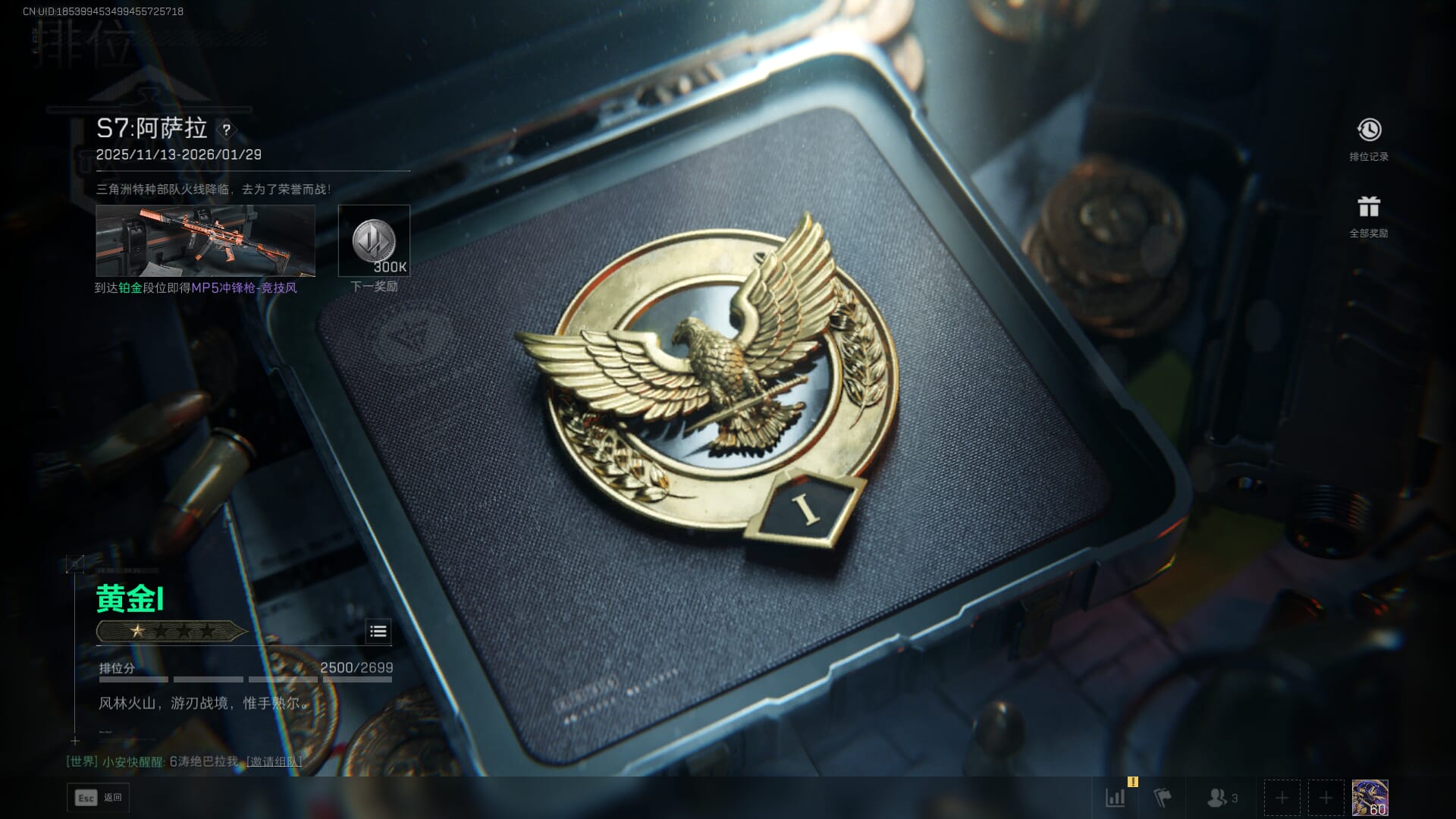 总资产:62.2M,哈夫币:84W,武器皮肤:5,黑鹰_,战场60级:列兵,【安全箱】基础安全箱;【特勤处等级】仓库LV.5,靶场LV.4,训练中心LV.4;【干员皮肤】骇爪维什戴尔,红狼电锯惊魂;【近战武器】近战武器-黑鹰;【步枪皮肤】M4A1突击步枪-阿米娅,SCAR-H战斗步枪-启航,KC17突击步枪-电锯惊魂;【狙击步枪皮肤】R93狙击步枪-维什戴尔;