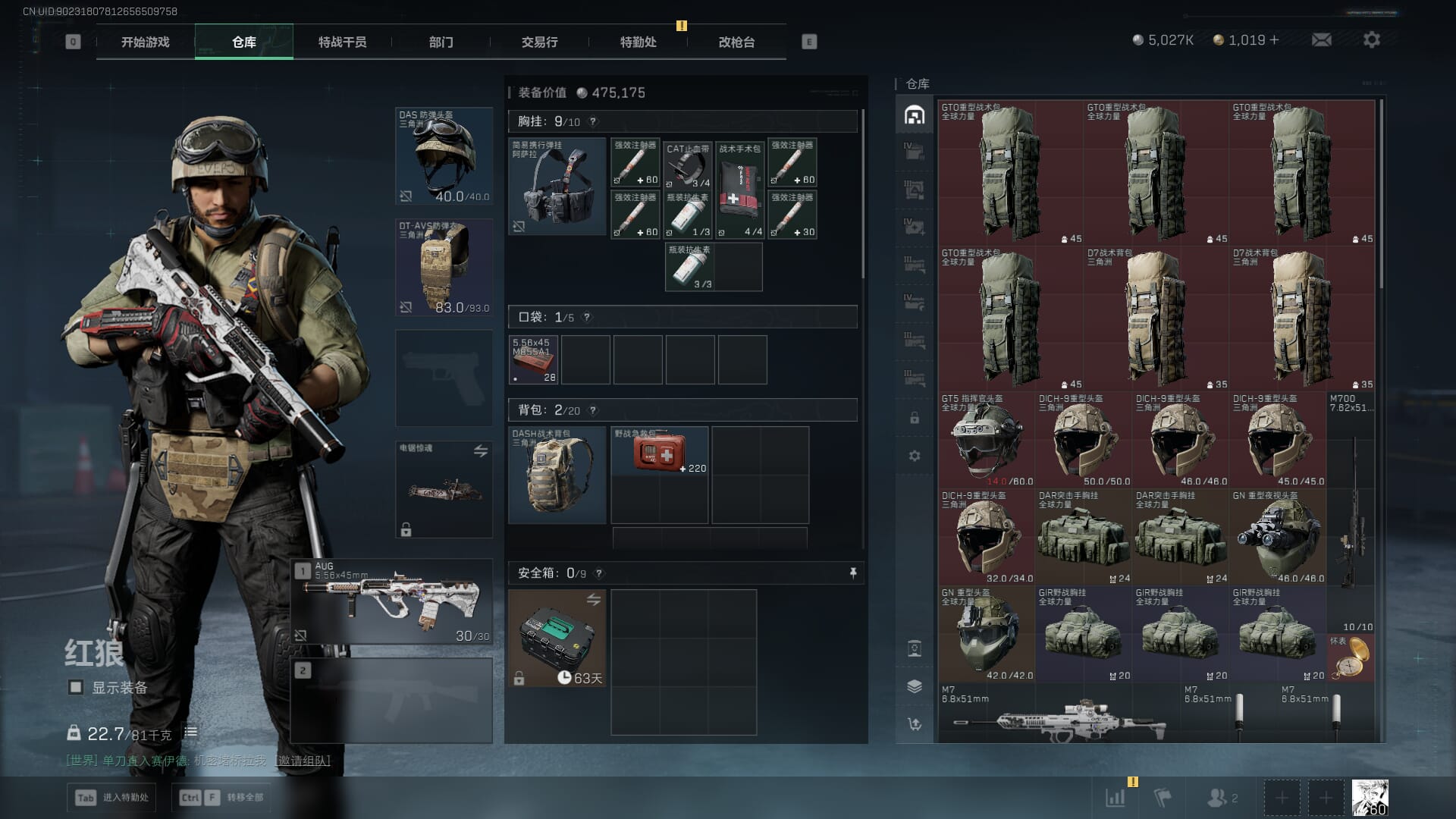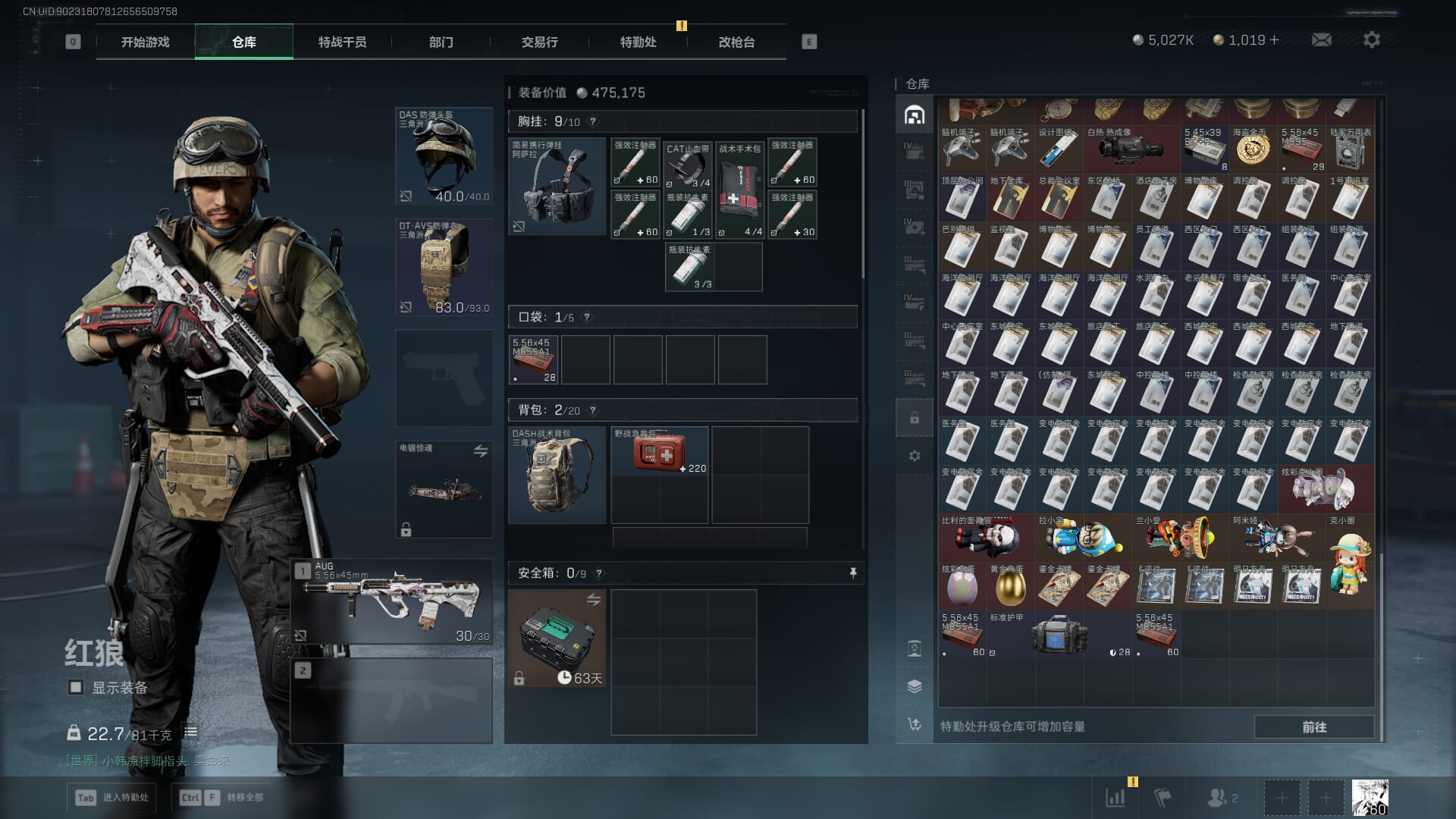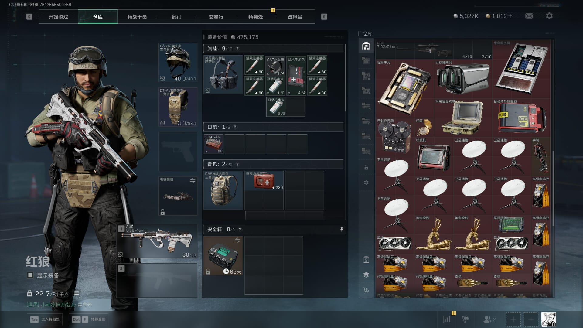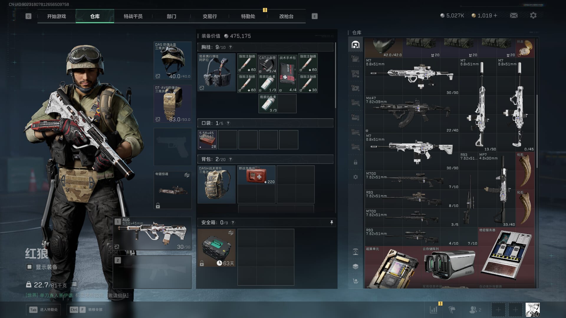 总资产:62.2M,哈夫币:84W,武器皮肤:5,黑鹰_,战场60级:列兵,【安全箱】基础安全箱;【特勤处等级】仓库LV.5,靶场LV.4,训练中心LV.4;【干员皮肤】骇爪维什戴尔,红狼电锯惊魂;【近战武器】近战武器-黑鹰;【步枪皮肤】M4A1突击步枪-阿米娅,SCAR-H战斗步枪-启航,KC17突击步枪-电锯惊魂;【狙击步枪皮肤】R93狙击步枪-维什戴尔;