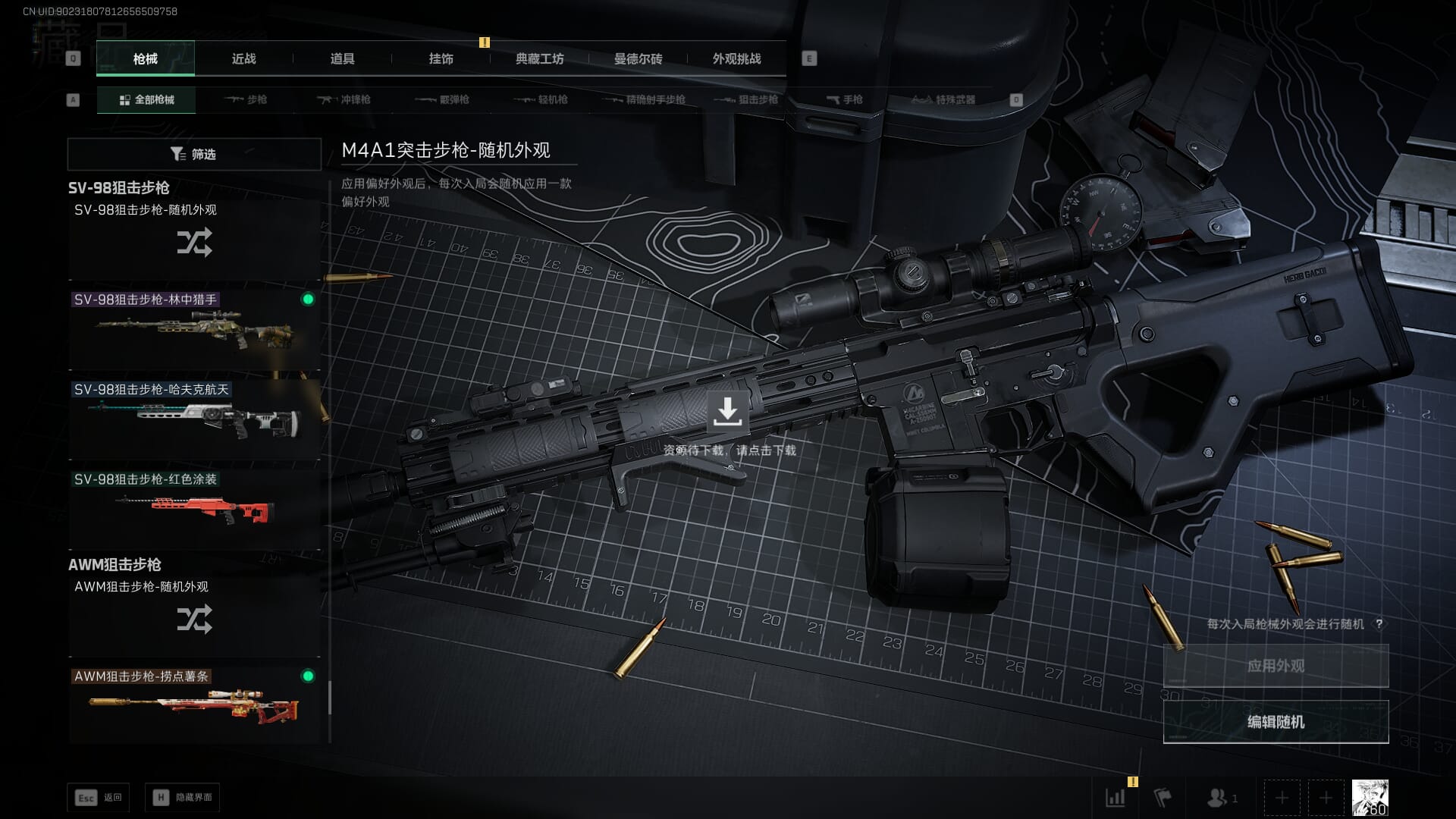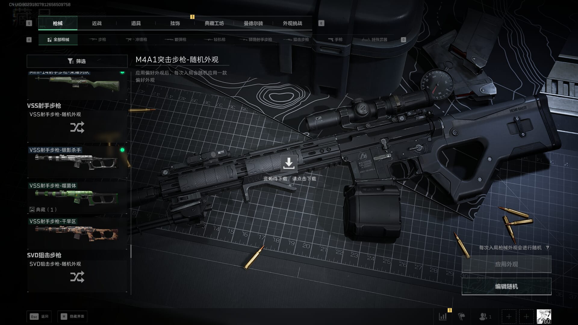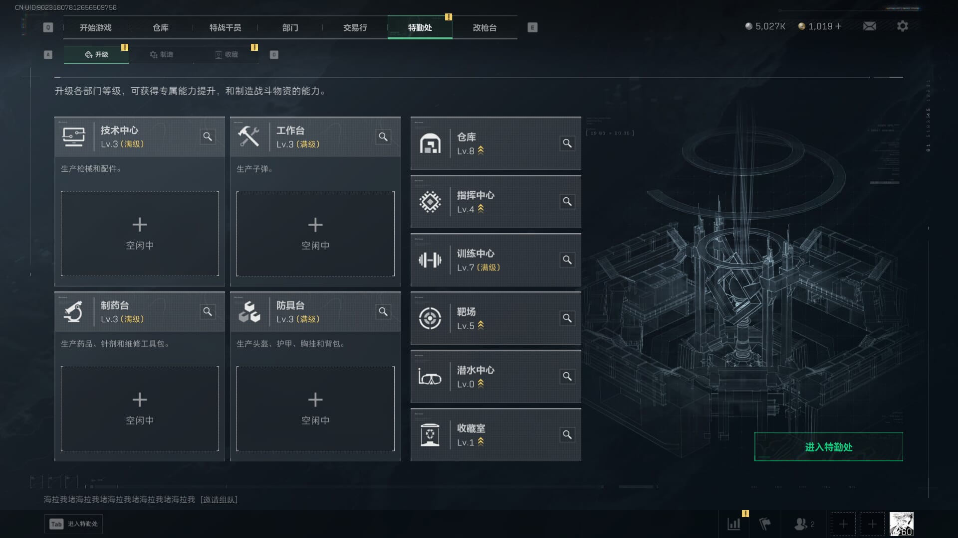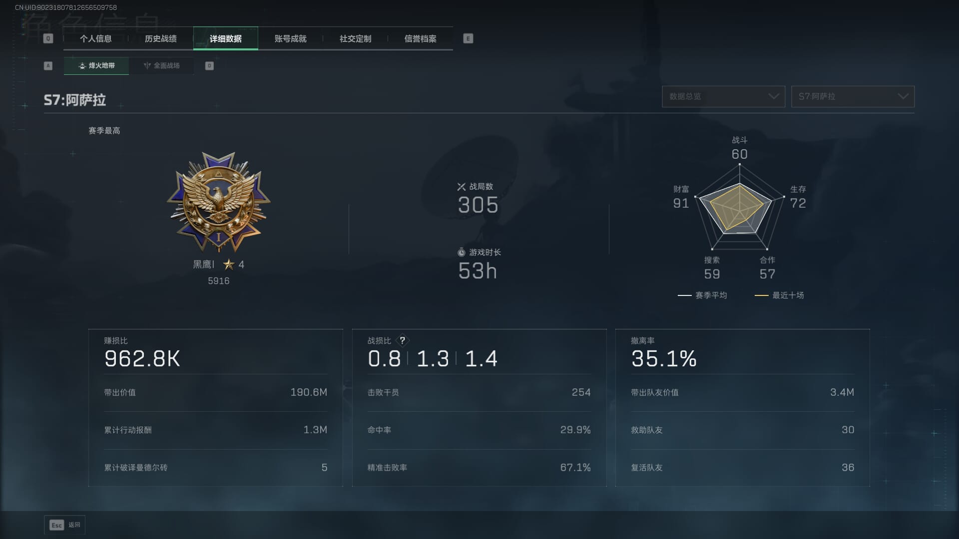 总资产:62.2M,哈夫币:84W,武器皮肤:5,黑鹰_,战场60级:列兵,【安全箱】基础安全箱;【特勤处等级】仓库LV.5,靶场LV.4,训练中心LV.4;【干员皮肤】骇爪维什戴尔,红狼电锯惊魂;【近战武器】近战武器-黑鹰;【步枪皮肤】M4A1突击步枪-阿米娅,SCAR-H战斗步枪-启航,KC17突击步枪-电锯惊魂;【狙击步枪皮肤】R93狙击步枪-维什戴尔;