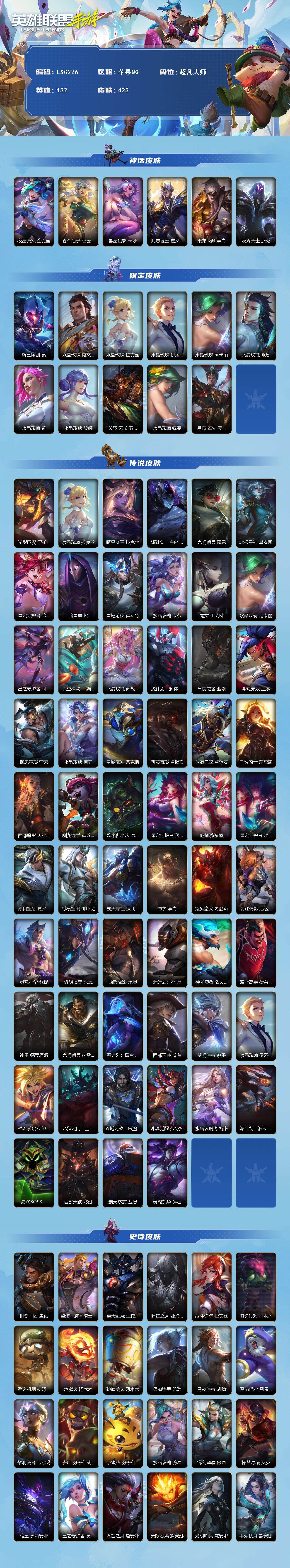 商品描述:【LSC226】132英雄/423皮肤/6神话/58传说/229史诗/超凡大师/夜星流火 金克丝/春晖仙子 苍云缥缈 卡莎/暮星追影 卡莎/此志凌云 嘉文四世/乘龙破渊 李青/灰烬骑士 派克/斩星魔剑 易/水晶玫瑰 嘉文四世/水晶玫瑰 拉克丝/水晶玫瑰 伊泽瑞尔/水晶玫瑰 阿卡丽/水晶玫瑰 永恩/水晶玫瑰 蔚/水晶玫瑰 娑娜/关羽 云长 泰达米尔/水晶玫瑰 锐雯/吕布 奉先 嘉文四世/光影巨翼 亚托克斯/暗星女王 拉克丝/源计划:净化 薇恩/光明哨兵 薇恩/北极星神 黛安娜/星之守护者 金克丝/暗星尊 烬/星域游侠 崔斯特/水晶玫瑰 卡莎/魔女 伊芙琳/星之守护者 阿卡丽/太空律动 “猫猫”