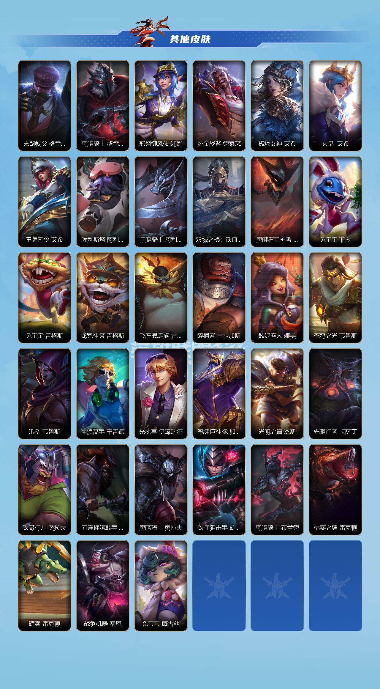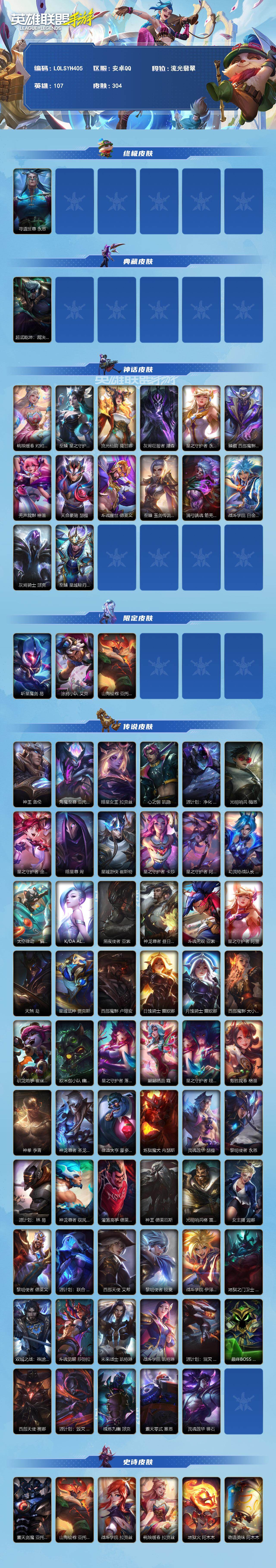 商品描述:【LOLSYH405】107英雄/304皮肤/流光翡翠/寻道世尊 永恩/超武乾坤:裁决 德莱厄斯/桃映暖春 灼灼芳菲 拉克丝/至臻 星之守护者 辛德拉/流光仙韵 莫甘娜/灰烬征服者 潘森/星之守护者 永绽盛芒 阿狸/臻藏 西部魔影 卢锡安/无声裁影 格温/天命豪赌 瑟提/斗魂耀世 德莱文/至臻 玉剑传说 武剑仙 锐雯/满弓镇魂 箭无虚发 韦鲁斯/战斗学院 白金学长 伊泽瑞尔/灰烬骑士 派克/至臻 星域秘刃 泰隆/斩星魔剑 易/涂鸦小队 艾克/山海绘卷 亚托克斯/神王 盖伦/海魔至尊 亚托克斯/暗星女王 拉克丝/心之钢 凯隐/源计划:净化 薇恩/光明哨兵 薇恩/星之守护者 金克丝/暗星尊 烬/