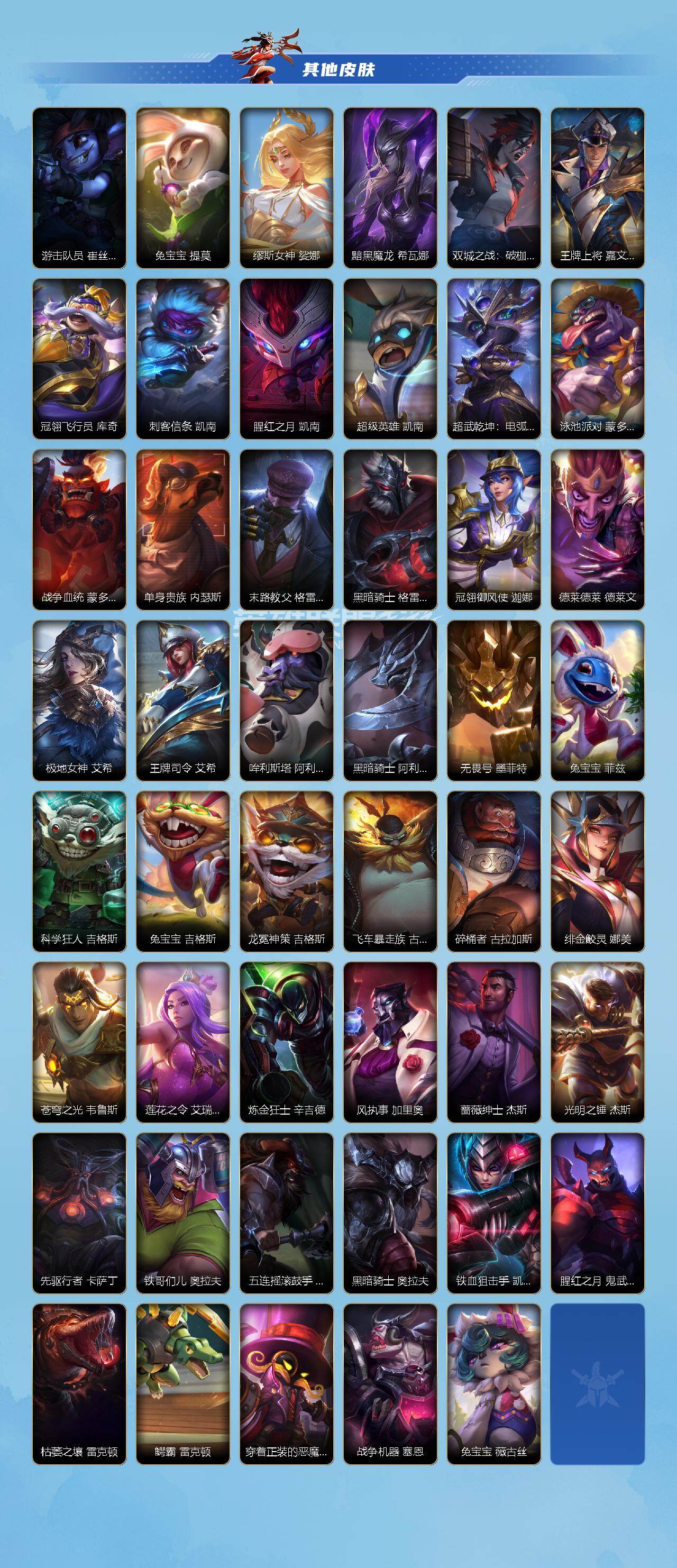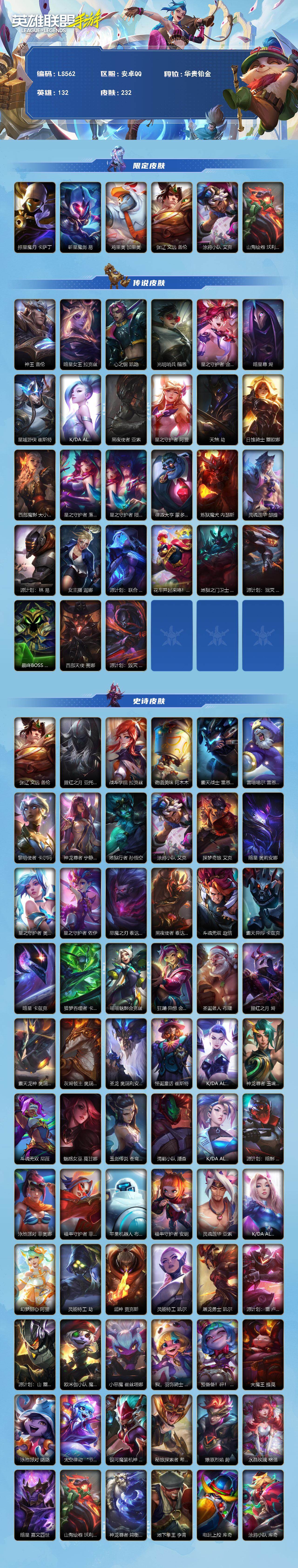 商品描述:【LS562】132英雄/232皮肤/华贵铂金/掠星魔刃 卡萨丁/斩星魔剑 易/鸡里奥 加里奥/张辽 文远 盖伦/涂鸦小队 艾克/山海绘卷 沃利贝尔/神王 盖伦/暗星女王 拉克丝/心之钢 凯隐/光明哨兵 薇恩/星之守护者 金克丝/暗星尊 烬/星域游侠 崔斯特/K/DA ALL OUT 萨勒芬妮/黑夜使者 亚索/星之守护者 阿狸/天煞 劫/日蚀骑士 蕾欧娜/西部魔影 大小姐 蕾欧娜/星之守护者 落 霞/星之守护者 陨 洛/律政大亨 蒙多医生/炼狱魔犬 内瑟斯/灵魂莲华 瑟提/源计划:林 易/女主播 迦娜/源计划:联合 艾希/花车开起来咯! 墨菲特/地狱之门卫士 加里奥/源计划:泯灭 雷克顿/最