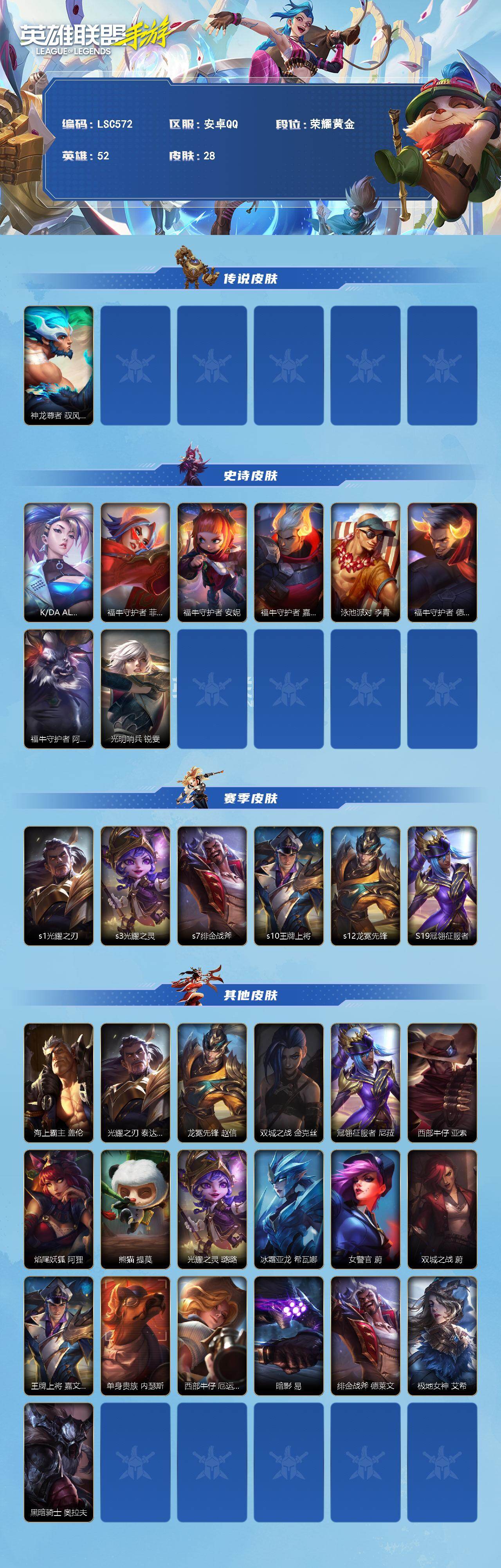 商品描述:【LSC572】52英雄/28皮肤/1传说/8史诗/荣耀黄金/神龙尊者 驭风啸龙 易/K/DA ALL OUT 阿卡丽/福牛守护者 菲奥娜/福牛守护者 安妮/福牛守护者 嘉文四世/泳池派对 李青/福牛守护者 德莱厄斯/福牛守护者 阿利斯塔/光明哨兵 锐雯/s1光耀之刃/s3光耀之灵/s7绯金战斧/s10王牌上将/s12龙冕先锋/S19冠翎征服者/海上霸主 盖伦/光耀之刃 泰达米尔/龙冕先锋 赵信/双城之战 金克丝/冠翎征服者 尼菈/西部牛仔 亚索/焰尾妖狐 阿狸/熊猫 提莫/光耀之灵 璐璐/冰霜亚龙 希瓦娜/女警官 蔚/双城之战 蔚/王牌上将 嘉文四世/单身贵族 内瑟斯/西部牛仔 厄运小姐/