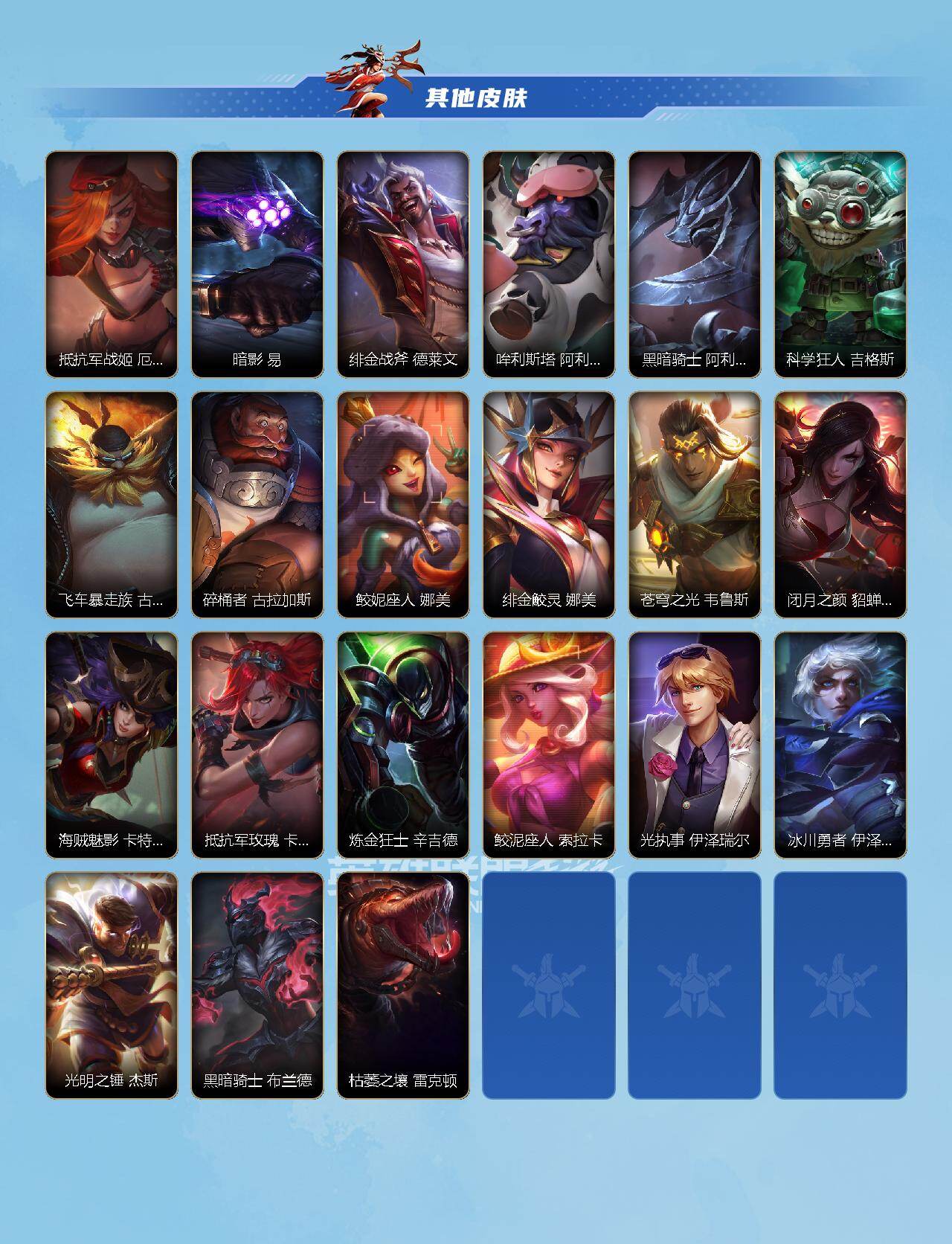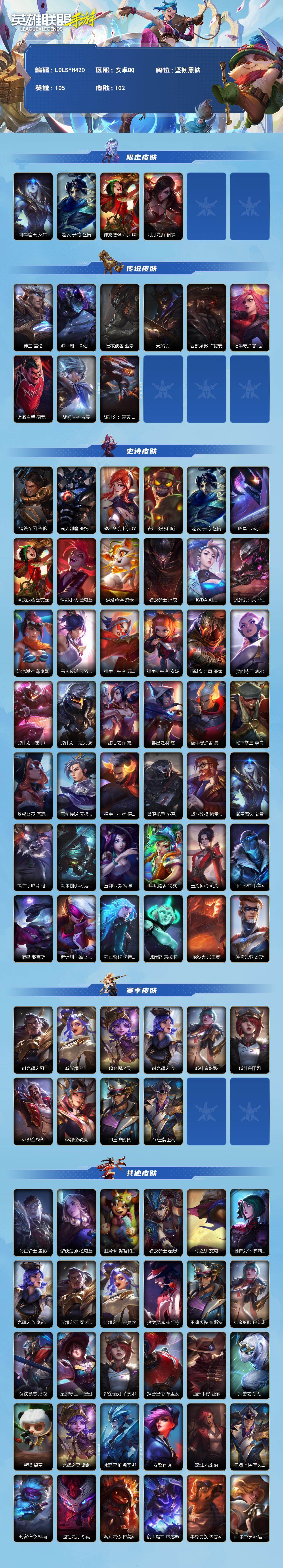 商品描述:【LOLSYH420】105英雄/102皮肤/坚韧黑铁/御星魔矢 艾希/赵云 子龙 赵信/神龙烈焰 金克丝/闭月之颜 貂蝉 卡特琳娜/神王 盖伦/源计划:净化 薇恩/黑夜使者 亚索/天煞 劫/西部魔影 卢锡安/福牛守护者 厄运小姐/灌篮高手 德莱厄斯/黎明使者 锐雯/源计划:泯灭 雷克顿/钢铁军团 盖伦/霸天剑魔 亚托克斯/战斗学院 拉克丝/丧尸 努努和威朗普/暗星 卡兹克/清剿小队 金克丝/烘焙童谣 悠米/猎龙勇士 潘森/K/DA ALL OUT 阿卡丽/源计划:火 菲奥娜/泳池派对 菲奥娜/玉剑传说 无双 菲奥娜/福牛守护者 菲奥娜/福牛守护者 安妮/源计划:风 亚索/灵能特工 凯尔/源
