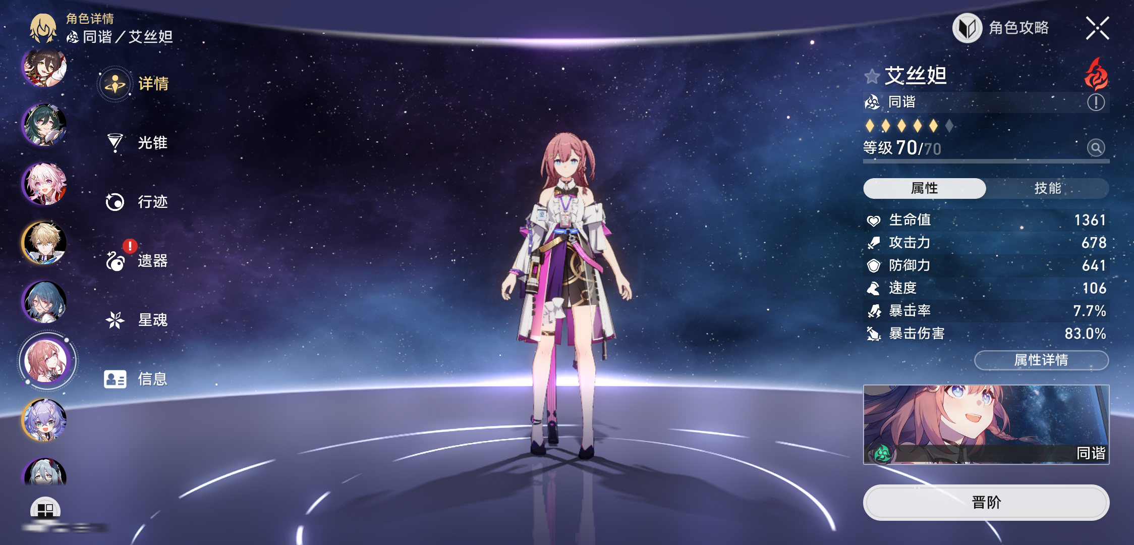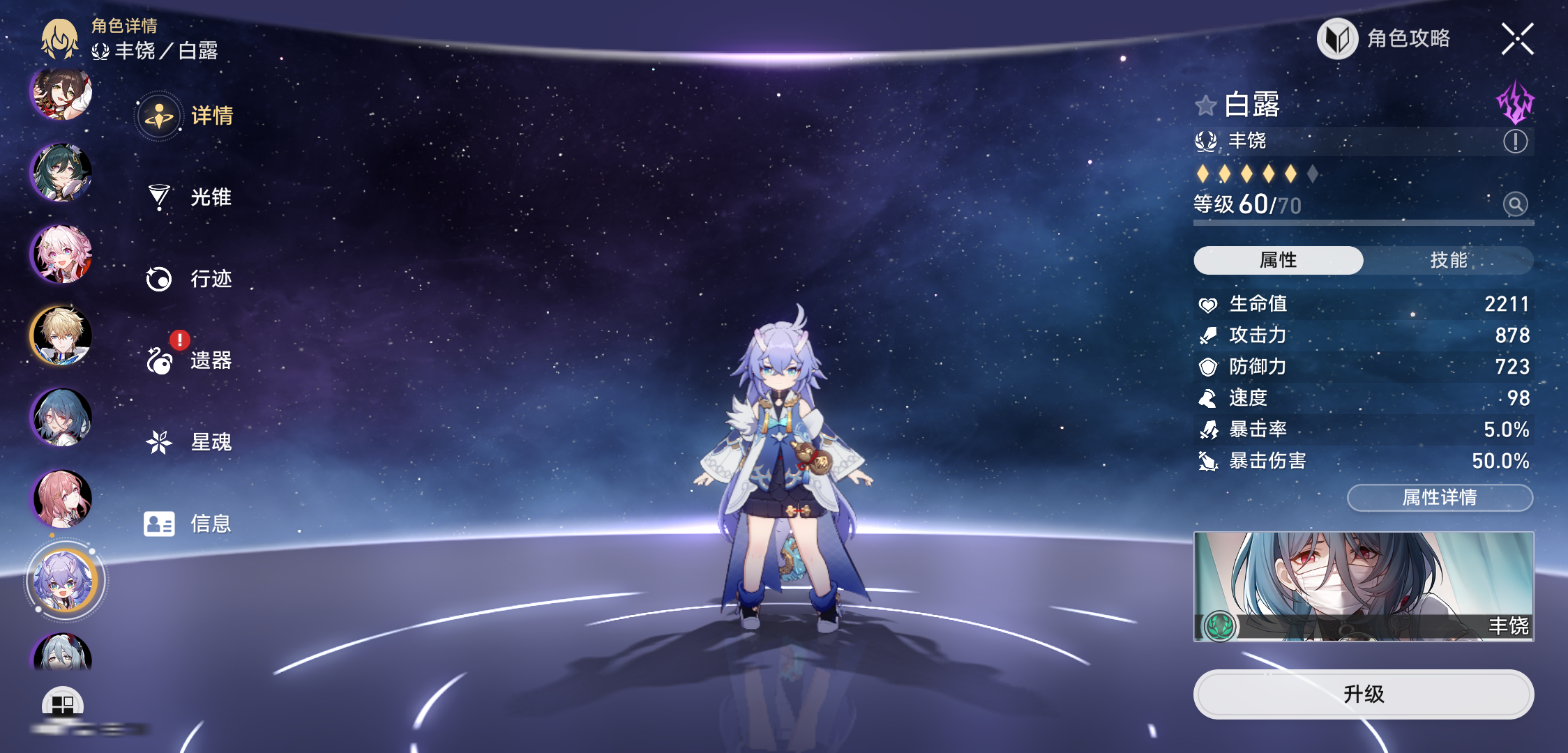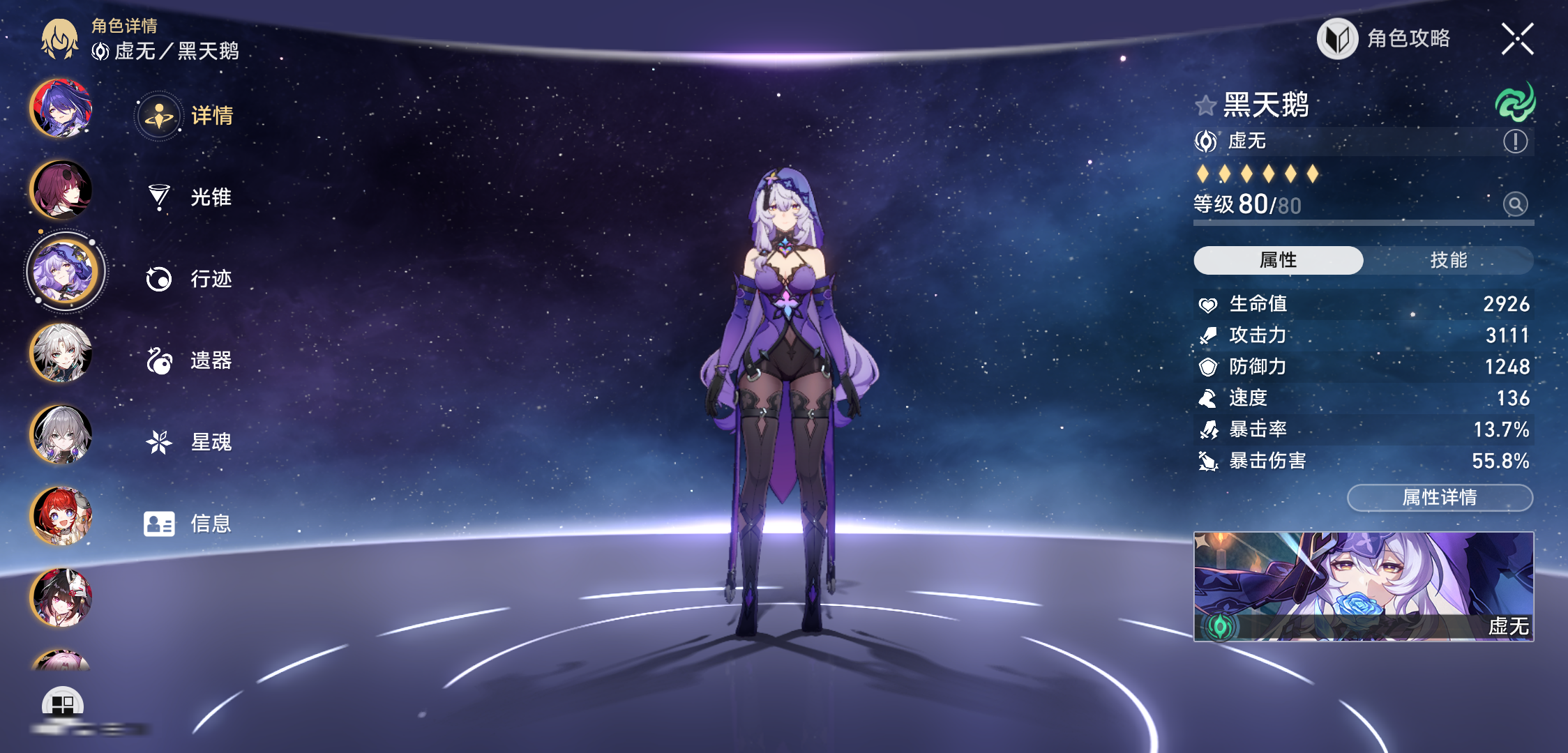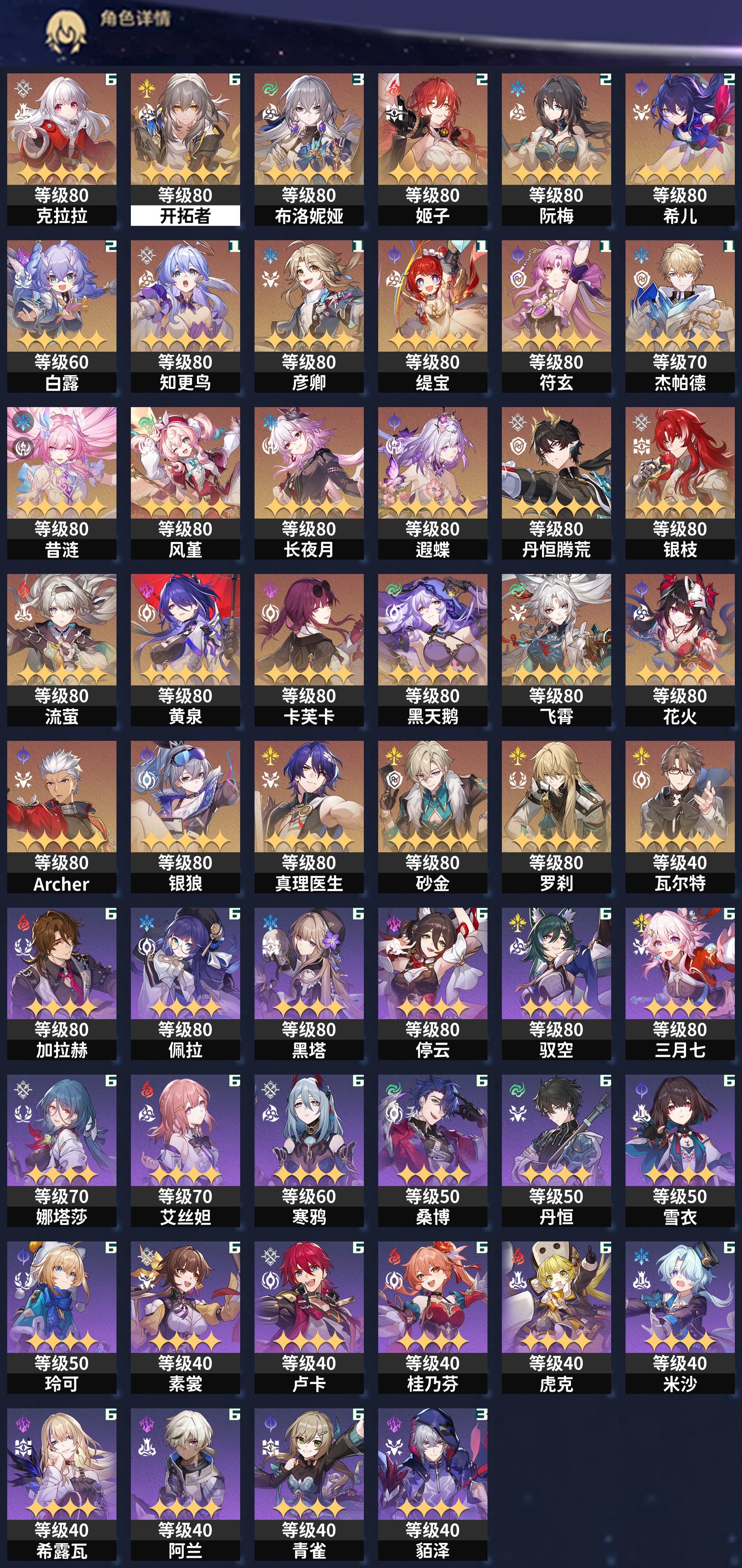 【崩坏·星穹铁道】【LYXQ6871】冒险等级:70,女主,五星数量:36,绑定情况:邮箱__五星角色:杰帕德 * 2命|白露 * 2命|姬子 * 2命|遐蝶 * 1命|布洛妮娅 * 1命|风堇|缇宝|长夜月|丹恒·腾荒|白厄|波提欧|银枝|忘归人|阮·梅|阿格莱雅|乱破|丹恒·饮月|罗刹|云璃|刻律德菈|Archer|瓦尔特|彦卿|希儿|真理医生__五星光锥:记一位星神的陨落 * 5精|比阳光更明亮的|驶向第二次生命|忍法帖·缭乱破魔|金血铭刻的时代|制胜的瞬间|让告别,更美一些|但战斗还未结束|星海巡航|以世界之名|银河铁道之夜,【邮箱未实名】