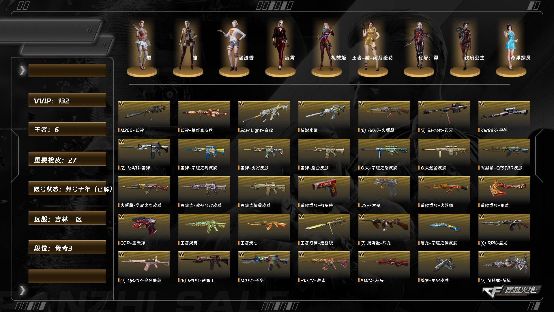 FWX5424/西部/陕西一区/可排位/102V/幻神/王者幻神/6修罗/COP堕天神/破空枪刃夜魔/4烈龙/2盘龙/朱雀/QBZ金色蔷薇/裁决/雷神/火麒麟/毁灭/黑骑士/黑龙/黑武士/火麒麟绝迹/火麒麟灵狐/王者春/【四防】/王者葵貂蝉/【四防】/凌霄/零/审判者/炫/王者救世主/新海豹突击队/修道士/职业选手/绝迹语音包/黑骑士音/火麒麟音效卡/毁灭音效卡/极光音效卡/黑龙音效卡/毁灭AG/火麒麟CFS2018/雷神宠儿/黑龙361/荣耀之锋/雷神荣耀之魄/火麒麟冠军之心/火麒麟AG无影霓裳/详情看下图