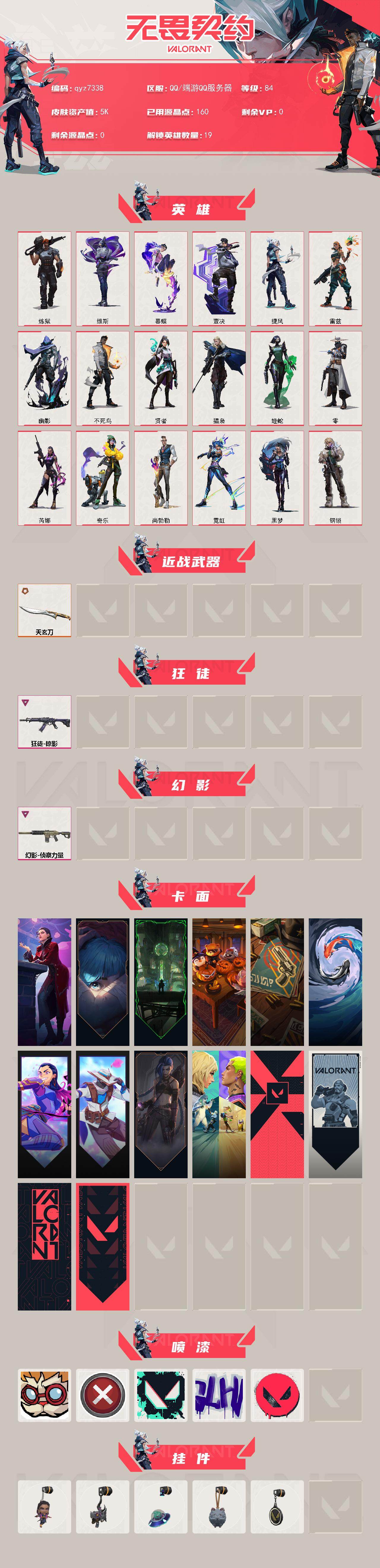[13706220]Q191850 无畏契约/38等级/未定级段位/16英雄/22皮肤/资产15000/已使用R点355/剩余R点5/2022全球冠军赛-幻影,光明哨兵-狂徒,洪荒怒焰-狂徒,超限闪存-匕首,天御刀,夜之蝴蝶,盖世英雄-冥驹,VCT-x-BLG-标配,破败军械-鬼魅,离子武器-正义