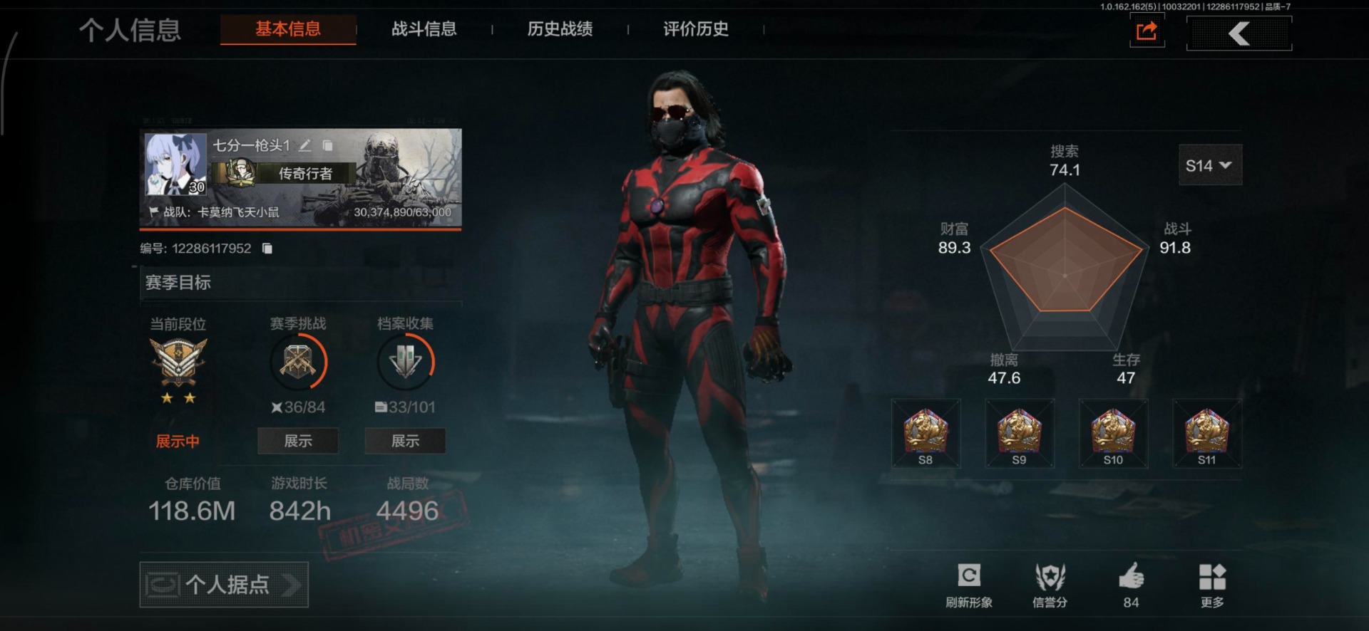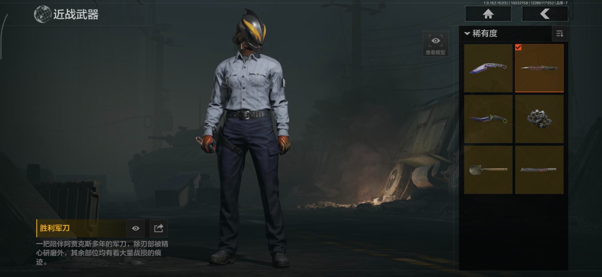 商品描述:[13967025]库存价值118.6 6近战武器 2金套装 3金枪皮 可修改实名 【柯恩币数量】:2484【角色装扮(金)】:黑暗行者特摄戏服,噤声者吉利服【近战武器】:来战·开山刀,瀚星斩铁,工兵铲,胜利军刀,急袭弯刀,精英指虎【金色枪皮】:告丧夜曲·AUG,骑士之剑·VSS,利齿风暴·MPX【紫色枪皮】:钢铁真理·F2000,旗帜·SVDS,棱光裂变·AKM,灰鼠幻歌·P90,白色丧钟·莫辛,骑士之剑·SJ16,骑士之剑·AKS74U,无畏·USAS12,典礼武备·14,鱼跃丹青·QBU191,竞技·M110,利齿风暴·T79,神锋·Vector45,湖冰倒影·MP5,怒火重燃·RPK16,敬伙伴·M16【角色装扮(紫)】:金狮护身·转运套装,鎏金街头套装,秋日盛宴风衣